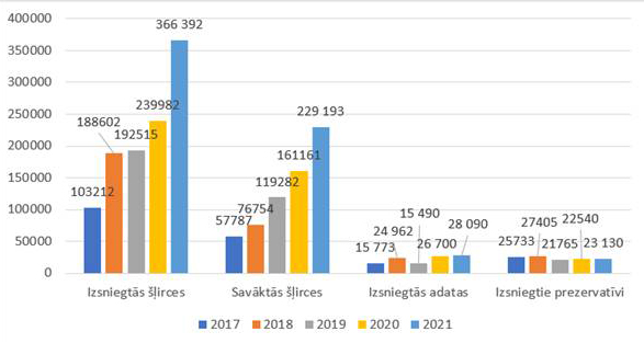 2.3. Pasākumi HIV, hepatītu un STI inficēšanās risku novēršanai riska grupās Kaitējuma mazināšana ir galvenā stratēģiskā pieeja narkotiku lietošanas HIV un hepatītu izplatības profilaksē. Latvijā ir 19 HIV profilakses punkti (turpmāk – HPP). HPP darbības rādītāji liecina, ka laikā no 2017. gada līdz 2021. gadam HPP tiek veikti aptuveni 5 000 HIV eksprestestu gadā. Analizējot HPP izsniegto materiālu skaitu, vērojams, ka kopš 2017. gada ievērojami pieaudzis kaitējuma mazināšanas pakalpojumu apjoms – gan izsniegto un savākto šļirču skaits, veikto eksprestestu skaits. EMCDDA noteicis šļirču apmaiņas programmu aptvēruma līmeņus pēc tā, cik šļirces tiek izsniegtas uz vienu aplēsto injicējamo narkotiku lietotāju. Kopš 2017. gada Latvija ar izsniegtām 108,1 šļircēm uz 1 INL sasniegusi vidējo rādītāju (100–200 šļirces uz 1 INL), un šis rādītājs turpina pieaugt, 2021. gadā sasniedzot 150,6 šļirces uz 1 INL (aprēķins veikts, izmantojot 2017. gada aplēses par INL skaitu Latvijā). Joprojām nepieciešams palielināt izsniegto šļirču skaitu un paplašināt pakalpojuma aptveri mērķa grupās, lai sasniegtu augstu šļirču apmaiņas programmas aptvērumu, kas ir ap 200 šļircēm uz 1 INL. 8. tabula HPP veiktie eksprestesti 2017.–2021. gadā*