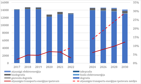 Lai sasniegtu ambiciozos klimata un enerģētikas politiku mērķus, visām iesaistītajām institūcijām (publiskajam sektoram, tai skaitā pašvaldībām, sociālajiem partneriem, nevalstiskajam sektoram, komersantiem, pētniekiem un sabiedrībai kopumā) būs jāpieņem izsvērti lēmumi, kas balstīti pētījumos, datos un sociālekonomiskajā izvērtējumā. Daļa no šiem lēmumiem varētu būt vērsti uz pamatīgām izmaiņām līdz šim pieņemtajā saimniekošanā, līdz šim pieņemtajā lēmumu pieņemšanā, dažādu nozaru un sabiedrības grupu paradumos. 3. PAŠREIZĒJĀ SITUĀCIJA, MĒRĶI UN RĪCĪBPOLITIKAS 3.1. Dekarbonizācija Latvijas kopējās SEG emisijas no 1990. g. līdz 2022. g. ir samazinātas par 61,1%101, lielāko un vērā ņemamāko samazinājumu nodrošinot enerģētikas (neieskaitot transportu) un atkritumu apsaimniekošanas sektorā. Latvijas kopējā SEG emisiju apjomā 2022. g. dominēja ne-ETS darbību SEG emisijas – 83,3%. 1. attēls Latvijas SEG emisijas 2005. – 2030. g. (Bāzes scenārijs) un mērķis (kt CO2 ekv.) Bāzes scenārijā102 tiek prognozēts, ka ne-ETS darbību SEG emisiju apjoms samazināsies par 8,3% 2005. – 2030. g.103. Kopš 2005. g. ne-ETS emisijas pieaugušas RPPI (59,4%), lauksaimniecības (22,5%) sektorā. Savukārt, emisijas no 2005. g. samazinājušās mājsaimniecības (21,6%), citas ne-ETS enerģētikas (37,5%) transporta (2,3%) un atkritumu apsaimniekošanas (39,8%) sektorā. 2022. g. kopējais AE patēriņš Latvijā bija 20 748 GWh, un AE īpatsvars 2022. g. bija 43,3%104. 2021. un 2022. g. AE īpatsvars iekļaujas indikatīvajā aktualizētā 2030. g. mērķa sasniegšanas trajektorijā105. 2.attēls. AE apjoms (kreisā ass, GWh), īpatsvars un īpatsvara mērķis (labā ass, %)106 2022. g. faktiskais AE īpatsvars bija augstāks nekā 60% gandrīz visos sektoros, kuriem tiek noteikti mērķi, izņemot elektroenerģiju, transportu un lauksaimniecību un mežsaimniecību, kuros AE īpatsvars pēdējos gados samazinās. Bāzes scenārijā AER īpatsvars enerģijas galapatēriņā paaugstināsies līdz 53,9% 2030. g. Jaunākajā Bāzes scenārijā pēc 2022. g. būtiski pieaug AER īpatsvars elektroenerģijā, bet AE siltumapgādē un transportā palielinās mazākā apjomā. 3.1.1. Transports I Bāzes scenārijs 2022. g. transporta sektora kopējais emisiju apjoms ir nenozīmīgi pieaudzis (1,0%)107, salīdzinot ar 2005. g. līmeni. Šo tendenci, galvenokārt, noteica degvielas patēriņa samazināšanās dzelzceļa transportam pie degvielas patēriņa palielināšanās tendences autotransportā. Periodā līdz 2030. g. Bāzes scenārijā SEG emisiju apjoms transportā, salīdzinot ar 2005. g., samazināsies par 2,3%. 3.attēls. Transporta sektora SEG emisijas 2005. – 2030. g. (kt CO2 ekv.) SEG emisiju samazinājums transportā (autotransportā, kam ir absolūti lielākais transporta sektora emisiju īpatsvars) ir pilnībā sasniedzams, degvielas piegādātājiem nosakot Direktīvā 2018/2001 un Plānā noteiktos SEG emisiju intensitātes samazināšanas mērķus 2030. g., komersantiem nenosakot kādus ierobežojumus šī mērķa sasniegšanai, t.i. komersanti paši varēs izvēlēties veidus kā mērķi izpildīt. Vienlaikus šī mērķa izpildi apgrūtinās atbilstošo atjaunīgās transporta enerģijas veidu pieejamība, piemēram, ir paredzams, ka transporta sektorā būs liela konkurence moderno biodegvielu pieprasījumā, jo šo degvielu piedāvājums nav ļoti liels, bet modernā biometāna izmantošanu šobrīd kavē atbilstošo transportlīdzekļu mazais skaits un ES tieši piemērojamos tiesību aktos noteiktais nosacījums, ka investīcijas šādu transportlīdzekļu iegādei neatbilst ilgtspējīgu investīciju nosacījumiem. Transporta sektora ļoti aktīva ceļu transporta elektrifikācija Bāzes scenārijā būtiski veicinās SEG emisiju samazināšanu transportā, ja EV piedāvājums un cena turpinās uzlaboties un ja tiks turpināti EV izmantošanu veicinošie pasākumi, kā arī ja tiks turpināti dzelzceļa izmantošanu veicinošie pasākumi. 4.attēls. Transporta enerģijas apjoms (kreisā ass, GWh), atjaunīgās transporta enerģijas īpatsvars un indikatīvais īpatsvara mērķis (labā ass, %)108 Ņemot vērā, ka 01.07.2022. – 31.12.2023. biodegvielu piejaukuma pienākums nebija obligāts (bija noteikts brīvprātīgs), atjaunīgās transporta enerģijas īpatsvars 2022. g. bija tikai 3,1% (6,4% 2021.g.), bet 2023. g. tas varētu būt minimāls. Vienlaikus modernās biodegvielas īpatsvars 2021. g. pārsniedza 2%, tādējādi jau izpildot 2025. g. mērķi. SEG intensitātes samazinājums 2021. g. (pret references līmeni), kas aprēķināts atbilstoši Direktīvas 2023/2413 redakcijai, 2021. g., varētu būt apmēram 1,1%. Jaunākajā Bāzes scenārijā 2030. g. atjaunīgās transporta enerģijas īpatsvars varētu sasniegt 12,2%109, šo apjomu nodrošinot tieši ar elektroenerģijas un biometāna patēriņa kāpumu un saglabājot biodegvielu izmantojuma apjomu 2021. g. apjomā, bet mazinot fosilās degvielas patēriņu. II Sasniedzamie mērķi