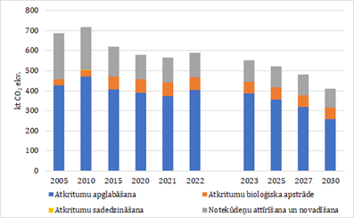 3.1.4.1. Palielināt bioloģiski noārdāmo atkritumu pārstrādi atbilstoši Atkritumu apsaimniekošanas valsts plānam 2021.-2028. g. 2. rīcības virzienam "Poligonu infrastruktūras attīstības pasākumi", 2.6.1. pasākumam ir plānots līdz 2024. g. nodot ekspluatācijā bioloģisko atkritumu pārstrādes iekārtas: Poligonā "Getliņi" – 125 000 t/gadā; Poligonā "Ķīvītes" – 21 000 t/gadā; Poligonā "Daibe" – 30 000 t/gadā; Poligonā "Cinīši" – 20 000 t/gadā; Poligonā "Janvāri" – 16 500 t/gadā Poligonā "Brakši" – 19 000 t/gadā. Pārstrādājot bioloģiskos atkritumus pārstrādes iekārtas tiek samazināts apglabāto atkritumu daudzums, kas samazina metāna emisiju no atkritumu apglabāšanas. 3.1.4.2. Sabiedrības izpratnes veidošanas un kapacitātes stiprināšanas pasākumi atbilstoši Atkritumu apsaimniekošanas valsts plāna 2021. – 2028. g. 3. rīcības virzienam "Sabiedrības informētības par atkritumu apsaimniekošanas jautājumiem, vides izglītības un līdzdalības veicināšana", 3.1. pasākumam "Paplašināt atkritumu radītāju informēšanas un izglītošanas pasākumus, lai atkritumu radītāji būtu ieinteresēti atkritumu rašanās novēršanā un dalītā vākšanā. Atbalsts pasākumiem, kas motivē atkritumu radītājus iesaistīties atkritumu rašanās novēršanā, atkritumu dalītā vākšanā (tai skaitā attiecībā uz vienreizlietojamiem plastmasas izstrādājumiem)". Sasniegtais iedzīvotāju skaits vismaz – 20 000, kā arī iedzīvotāji, kas kampaņas ietekmē mainījuši savu uzvedību vai ieradumus – 10 000. 3.1.4.3. Pilotprojekti reģionālajos poligonos atkritumu šķirošanas efektivitātes uzlabošanai. Reģionālajā poligonā "Dziļā Vāda" apglabāto nešķiroto atkritumu apjoma samazinājums līdz 77%; Reģionālajā poligonā "Dziļā Vāda" otrreiz pārstrādājamo materiālu RDF tālākai pārstrādei palielinājums par 5 932 t/gadā; sašķirotais plastmasas iepakojuma apjoms tālākai pārstrāde reģionālajā poligonā "Dziļā Vada" 467 t/gadā; Reģionālajā poligonā "Daibe" palielināta atkritumu apstrādes jauda par vismaz 400 t/gadā. Uzlabots kopējais pārstrādāto otrreizējo izejvielu daudzums. 3.1.4.4. Papildu regulējums decentralizēto kanalizācijas sistēmu (DKS) apsaimniekošanai, tā ieviešana, t.sk. stingrāka DKS uzraudzība. DKS lietotāju skaita samazināšanās pilsētās un ciemos, atbilstošs SEG emisiju no DKS kritums. Stingrāku prasību un to ieviešanas nodrošināšana DKS ne tikai mudinās īpašniekus šīs sistēmas atbilstoši apsaimniekot, bet daļā gadījumu arī kalpos par argumentāciju lēmumam par pieslēgšanos centralizētajiem kanalizācijas tīkliem, kas nodrošinās, ka notekūdeņu nonāks labi apsaimniekotās notekūdeņu attīrīšanas iekārtās. Tādejādi stingrākas prasības DKS apsaimniekošanai novedīs pie DKS skaita samazināšanās un – potenciāli – mazāka SEG emisiju apjoma. 3.1.4.5. SEG emisiju monitoringa nosacījumu izstrāde un uzsākšana lielākajās notekūdeņu attīrīšanas iekārtās. Uzsākts SEG emisiju monitorings vismaz 21 notekūdeņu attīrīšanas iekārtā. Pasākums nodrošinās informāciju par šī brīža emisijām un iespēju vēlāk datus salīdzināt un novērot progresu (vai tā trūkumu). 3.1.4.6. Notekūdeņu attīrīšanas iekārtu darbības uzlabošana. NAI ar CE>10000 darbības uzlabošana, lai palielinātu notekūdeņu attīrīšanas jaudas un efektivitāti. Palielinot notekūdeņu attīrīšanas iekārtu darbības kvalitāti un jaudu tiks apsaimniekots vairāk notekūdeņu, nodrošināta labāka vidē novadīto attīrīto notekūdeņu kvalitāte. NAI paaugstināsies spējas pieņemt un kvalitatīvi attīrīt notekūdeņus, kas tajās nonāks no mājsaimniecībām, kas izlēmušas atteikties no DKS un pieslēgties centralizētajām sistēmām. 3.1.4.7. Notekūdeņu dūņu apsaimniekošanas plāna 2024. – 2027. g. īstenošana paredz visu Latvijā radīto notekūdeņu dūņu savākšanu, uzskaiti, analīzes, pārstrādi un izmantošanu pēc iespējas lietderīgā veidā (augsnes ielabošanai, biogāzes ražošanai). Novērsta nekontrolēta dūņu uzkrāšana, noplūdes riski, nekontrolētas SEG emisijas. 3.1.4.8. Dalītas tekstilizstrādājumu savākšanas sistēmas īstenošana un pilnveidošana, kura mērķis ir samazināt tekstilizstrādājumu atkritumus 1800 t/gadā jeb 7,5% no kopējiem tekstila atkritumiem. 3.1.4.9. Atkritumu ievešanas aizlieguma noteikšanas darbības ietvaros tiks aizliegts no citām ES DV ievest sadzīves vai rūpnieciskos atkritumus to apglabāšanai un/vai reģenrācijai siltumenerģijas vai elektroenerģijas ieguvei, neskarot rūpnieciskās ražošanas iekārtas, tādējādi nodrošinot, ka Latvijā nenotiek citās valstīs radīto atkritumu apglabāšana, kas varētu apdraudēt Latvijā ražoto atkritumu apglabāšanu, ņemot vērā Latvijas atkritumu poligonu kapacitāti, kā arī varētu palielināt Latvijā enerģijas ražošanā radīto SEG emisiju apjomu, kā arī kas mazinātu Latvijas energoneatkarību no importētajiem energoresursiem. 3.1.5. RPPI sektors I Bāzes scenārijs 10.attēls. RPPI sektora SEG emisijas 2005.-2030.g. (Bāzes scenārijs) (kt CO2 ekv.) 2022. g. ne-ETS kopējās SEG emisijas RPPI sektorā salīdzinājumā 2005. g. ir palielinājušās par 101%137. Periodā līdz 2030. g. Bāzes scenārijā SEG emisiju apjoms ne-ETS RPPI sektorā, salīdzinot ar 2005. g., palielināsies par 59%. Visos gados kā galvenais ne-ETS RPPI sektora emisiju avots saglabājas ozona slāni noārdošo vielu aizvietošanai izmantotie produkti. II Sasniedzamie mērķi