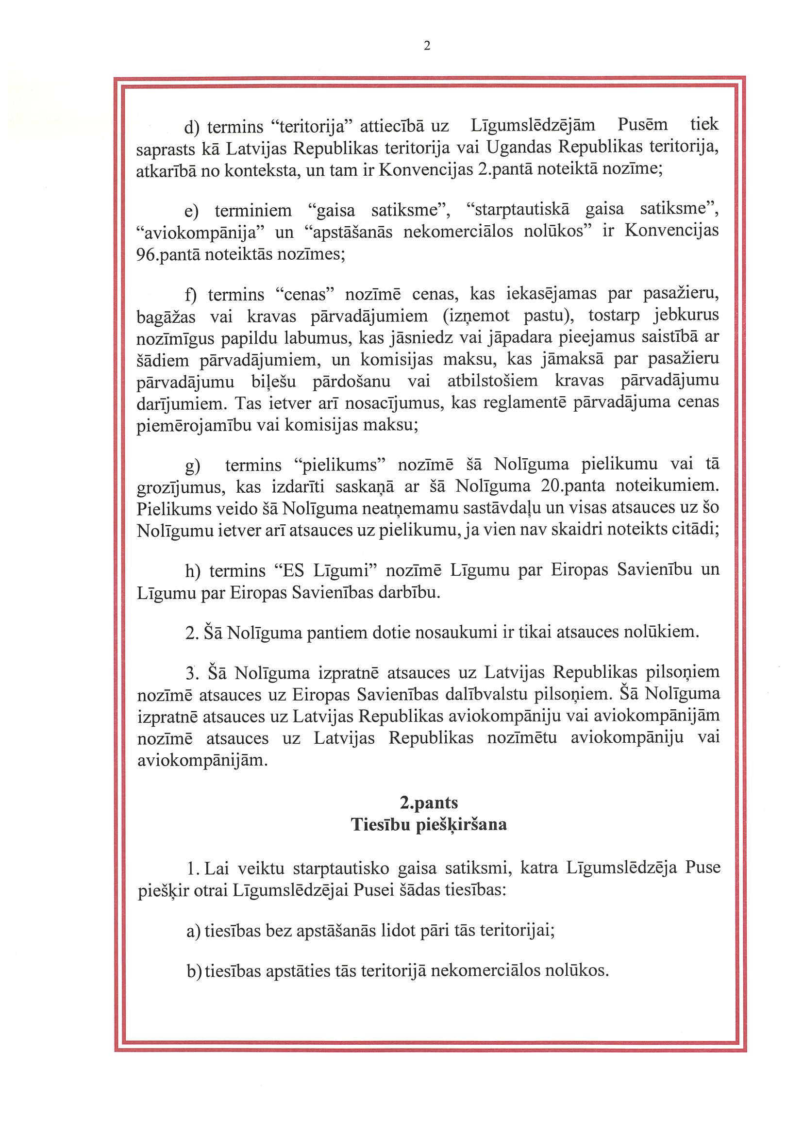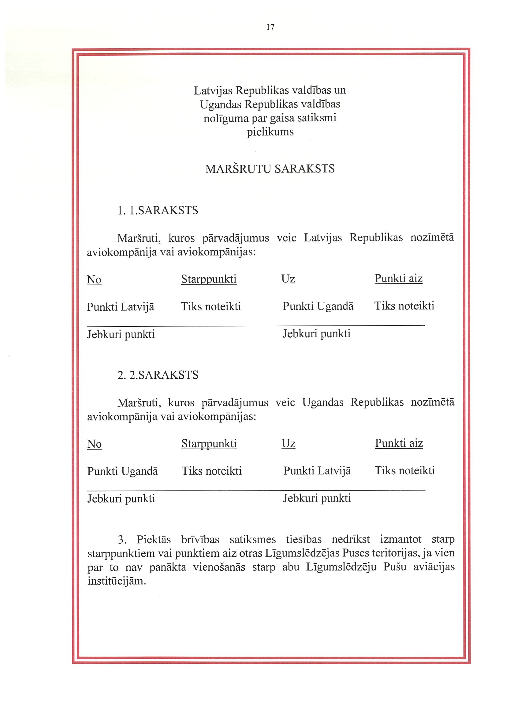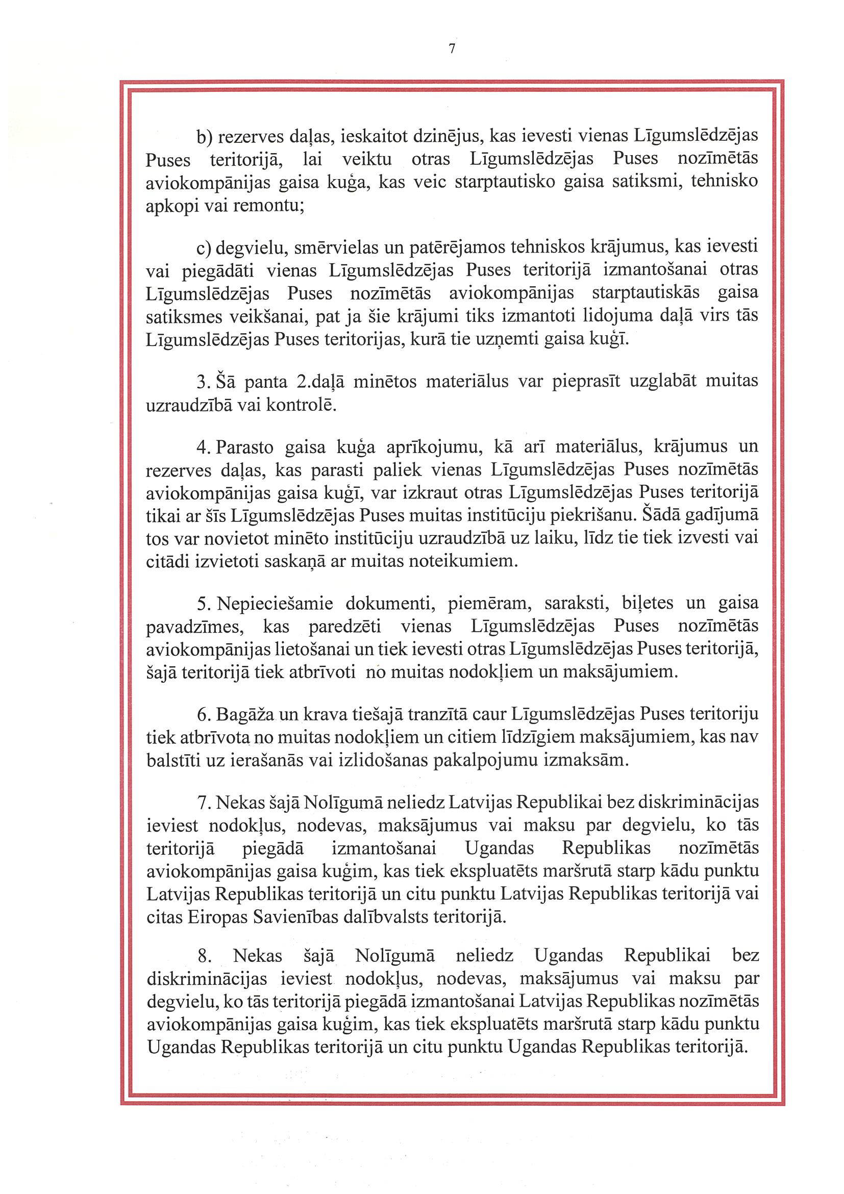 Nosaukums: Par Latvijas Republikas valdības un Ugandas Republikas valdības nolīgumu par gaisa satiksmi Statuss: