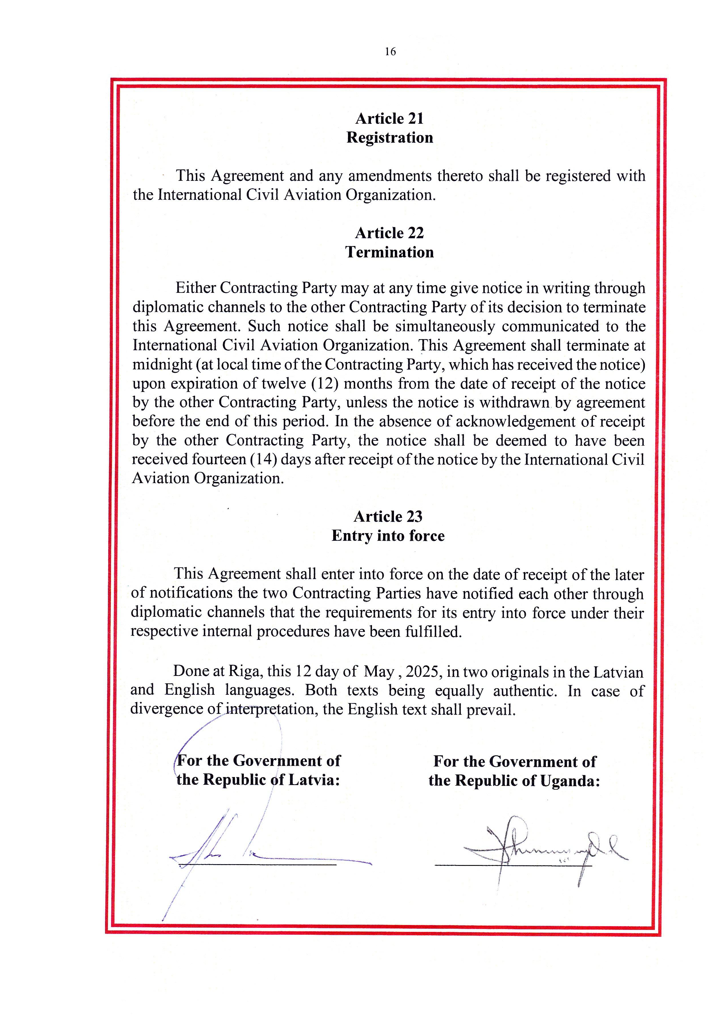 1. pants. 2025. gada 12. maijā Rīgā parakstītais Latvijas Republikas valdības un Ugandas Republikas valdības nolīgums par gaisa satiksmi (turpmāk - nolīgums) ar šo likumu tiek pieņemts un apstiprināts.