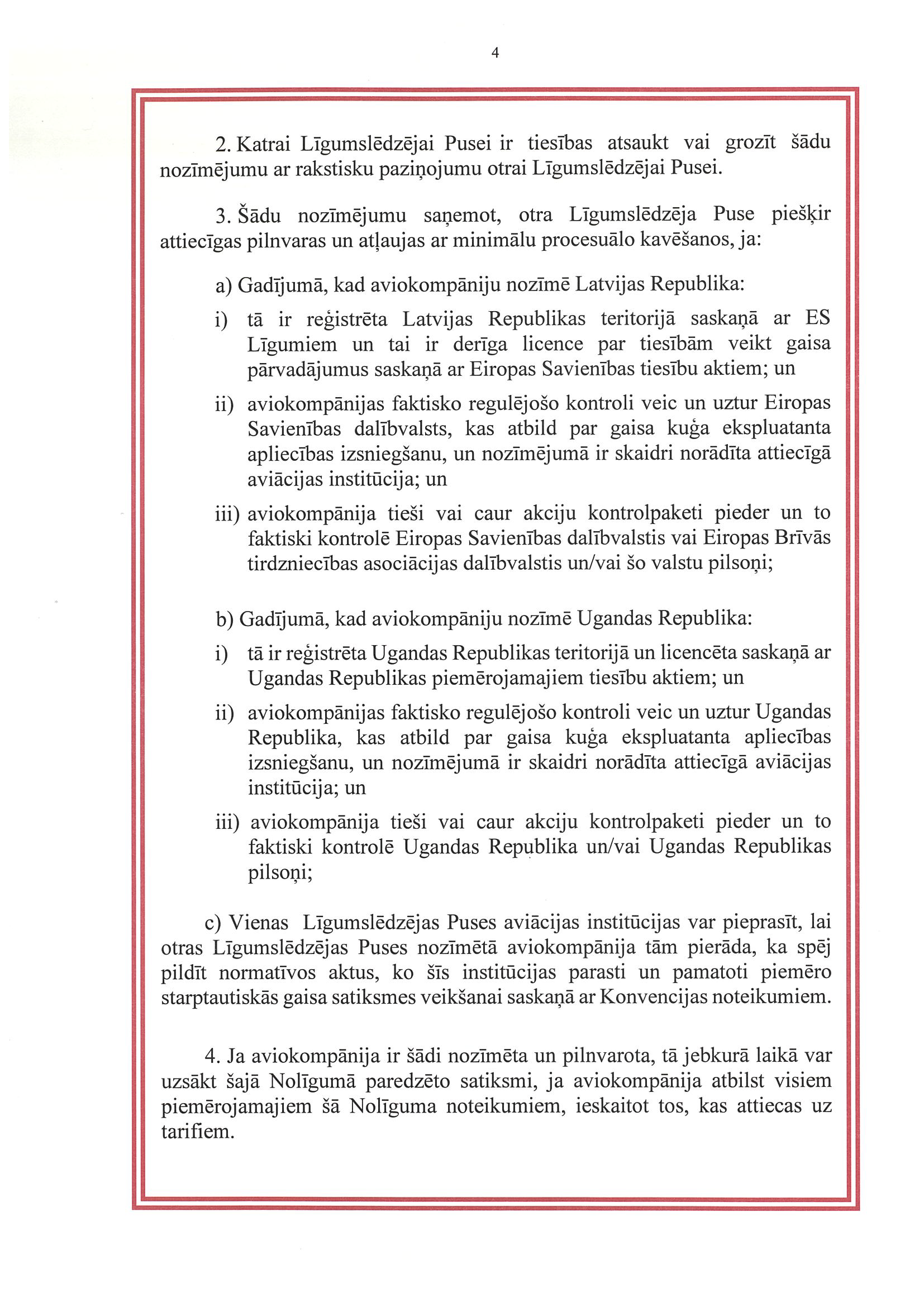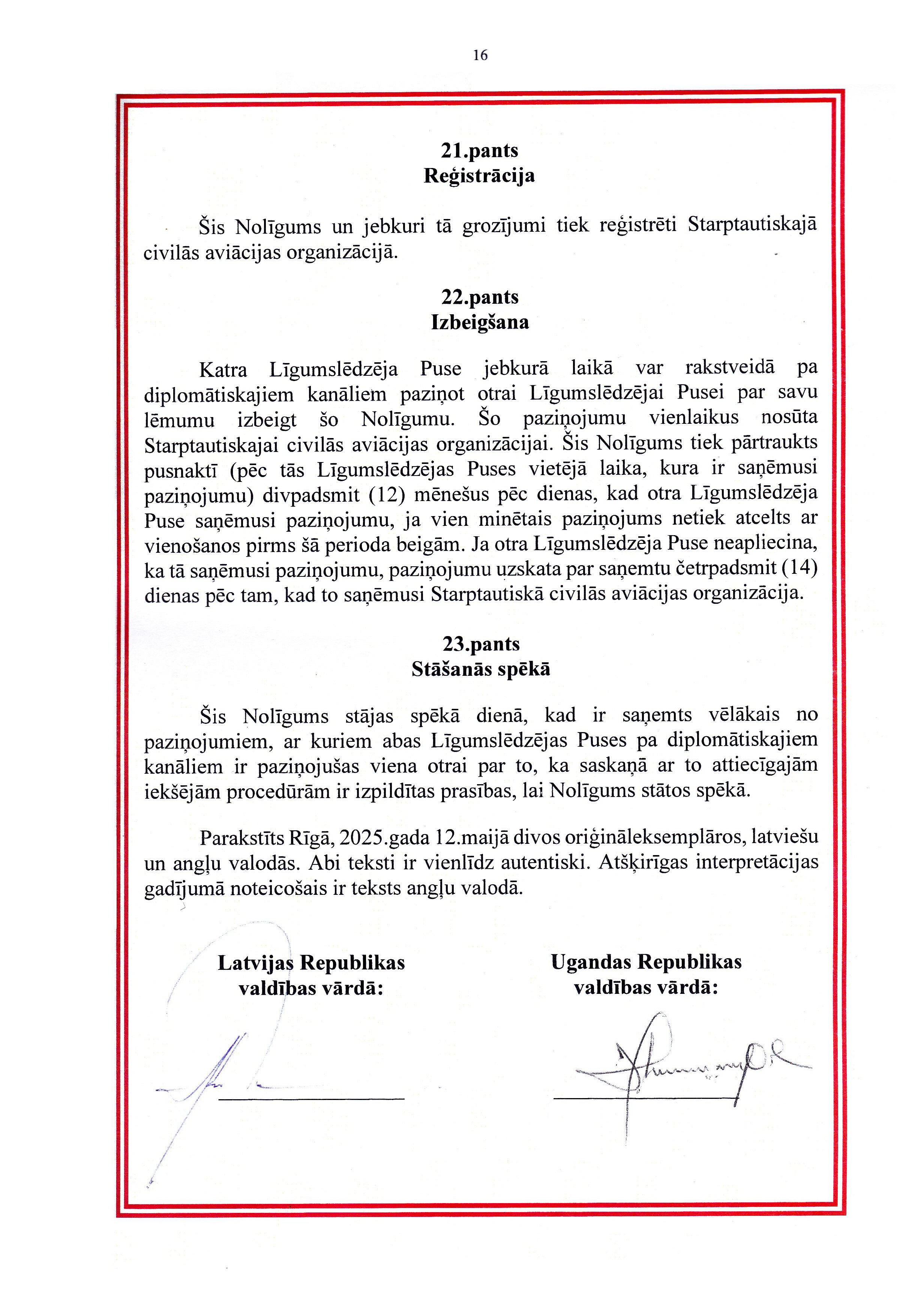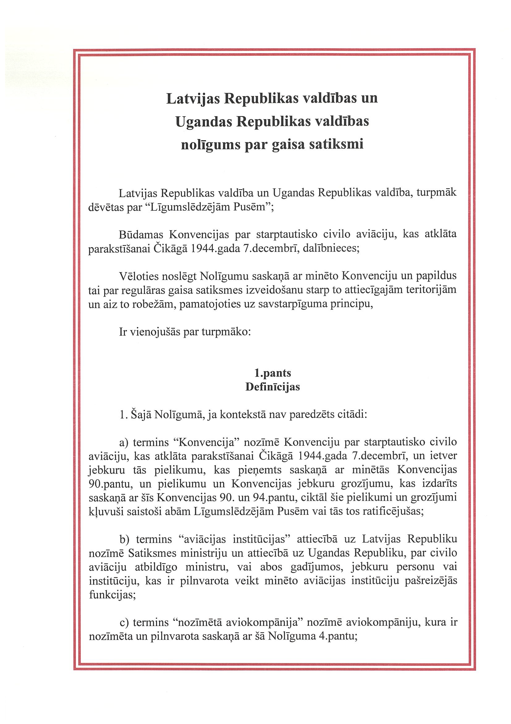 Nosaukums: LATVIJAS REPUBLIKAS VALDĪBAS UN UGANDAS REPUBLIKAS VALDĪBAS NOLĪGUMS PAR GAISA SATIKSMI Veids: starptautisks dokuments Pieņemts: 12.05.2025.Publicēts: Latvijas Vēstnesis, 205, 23.10.2025.