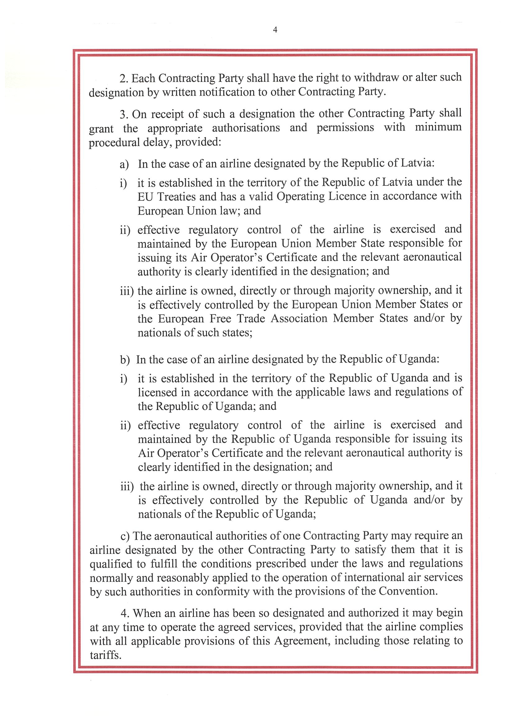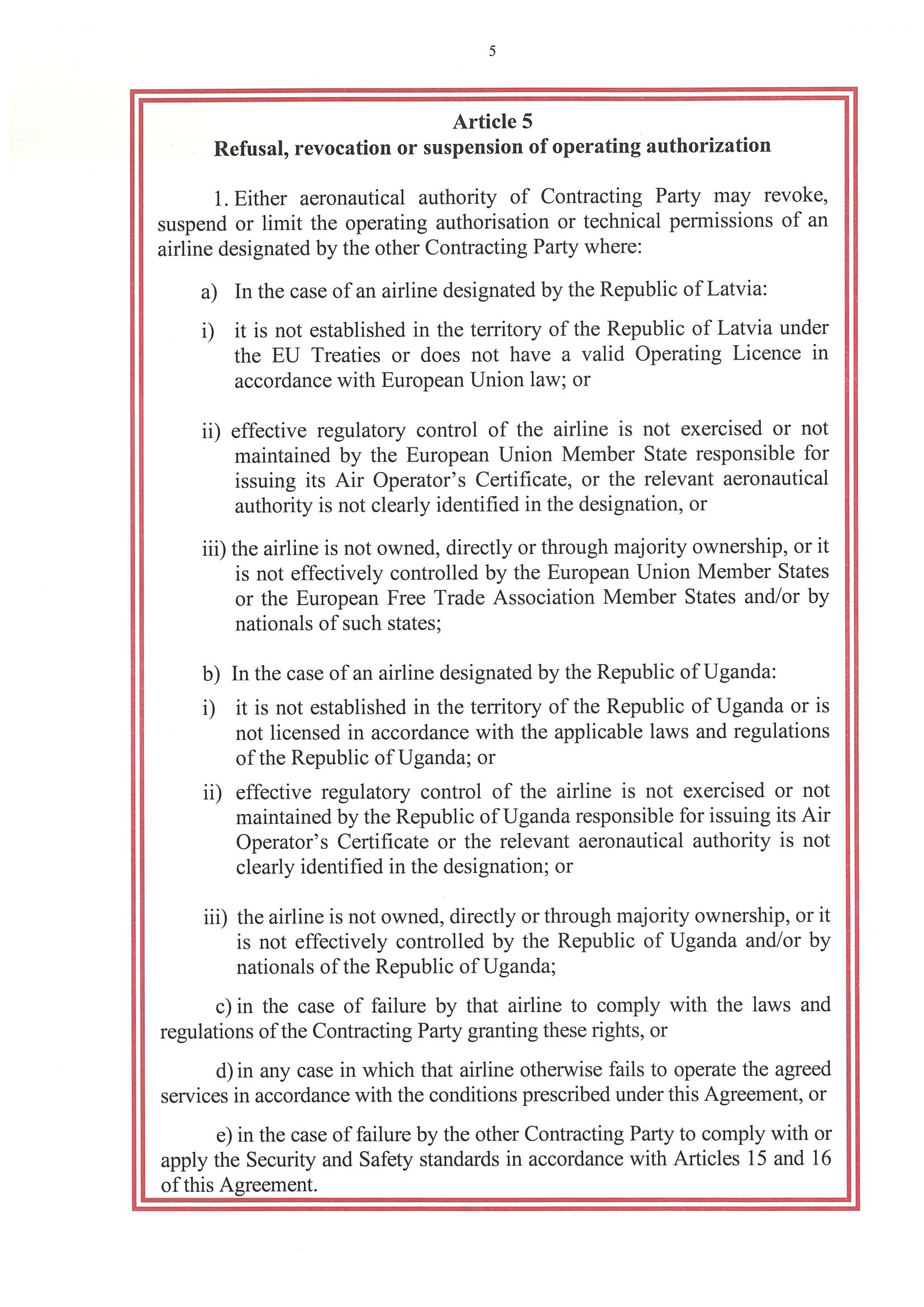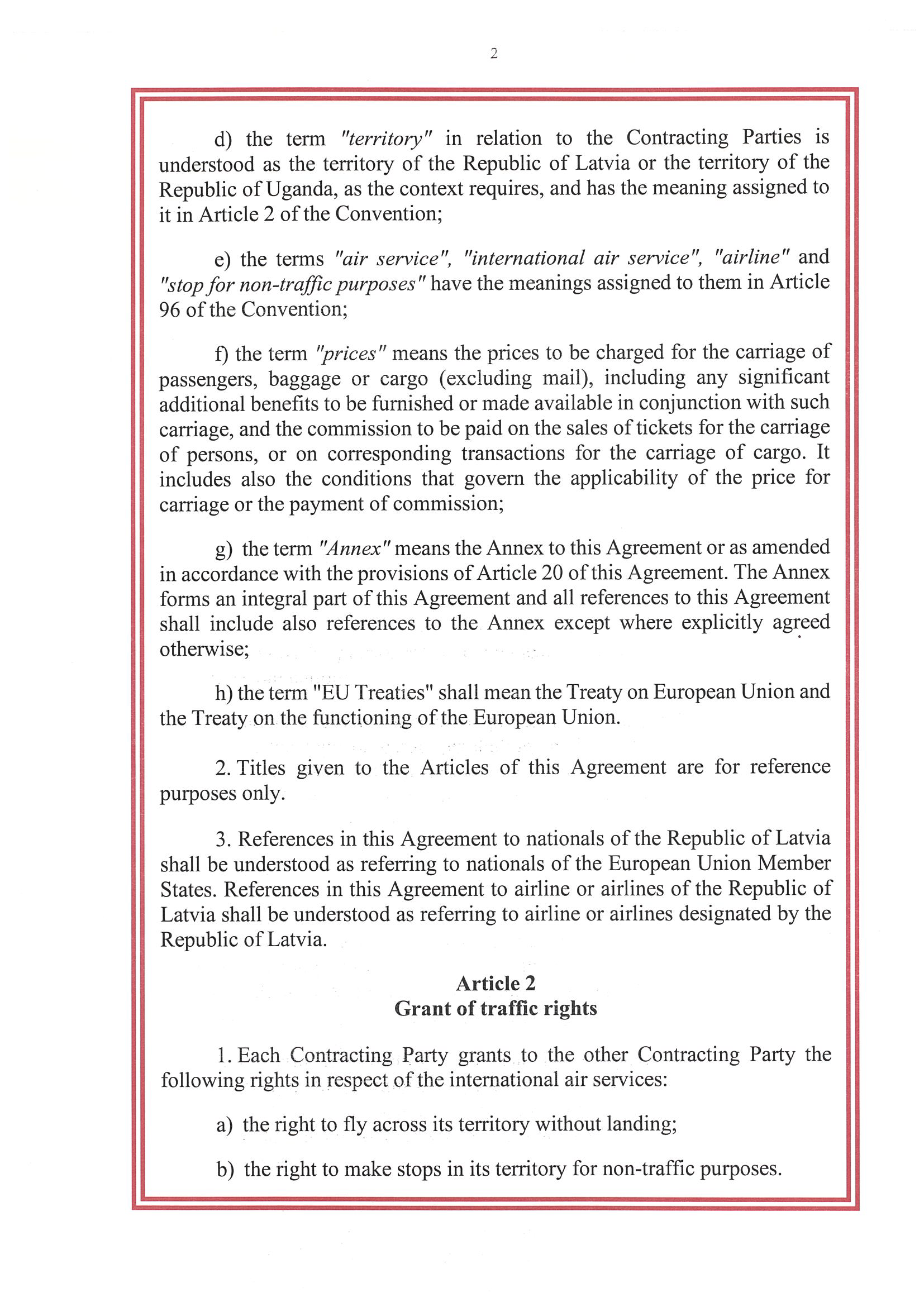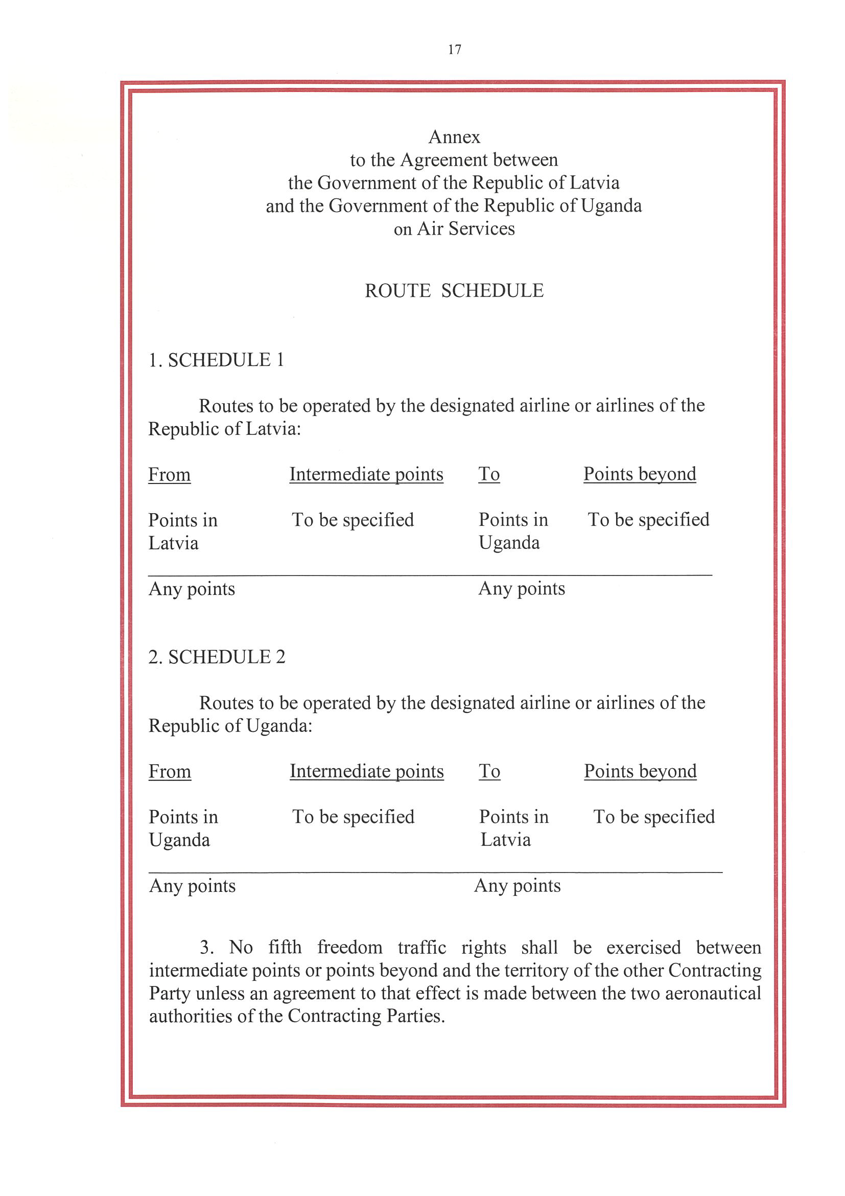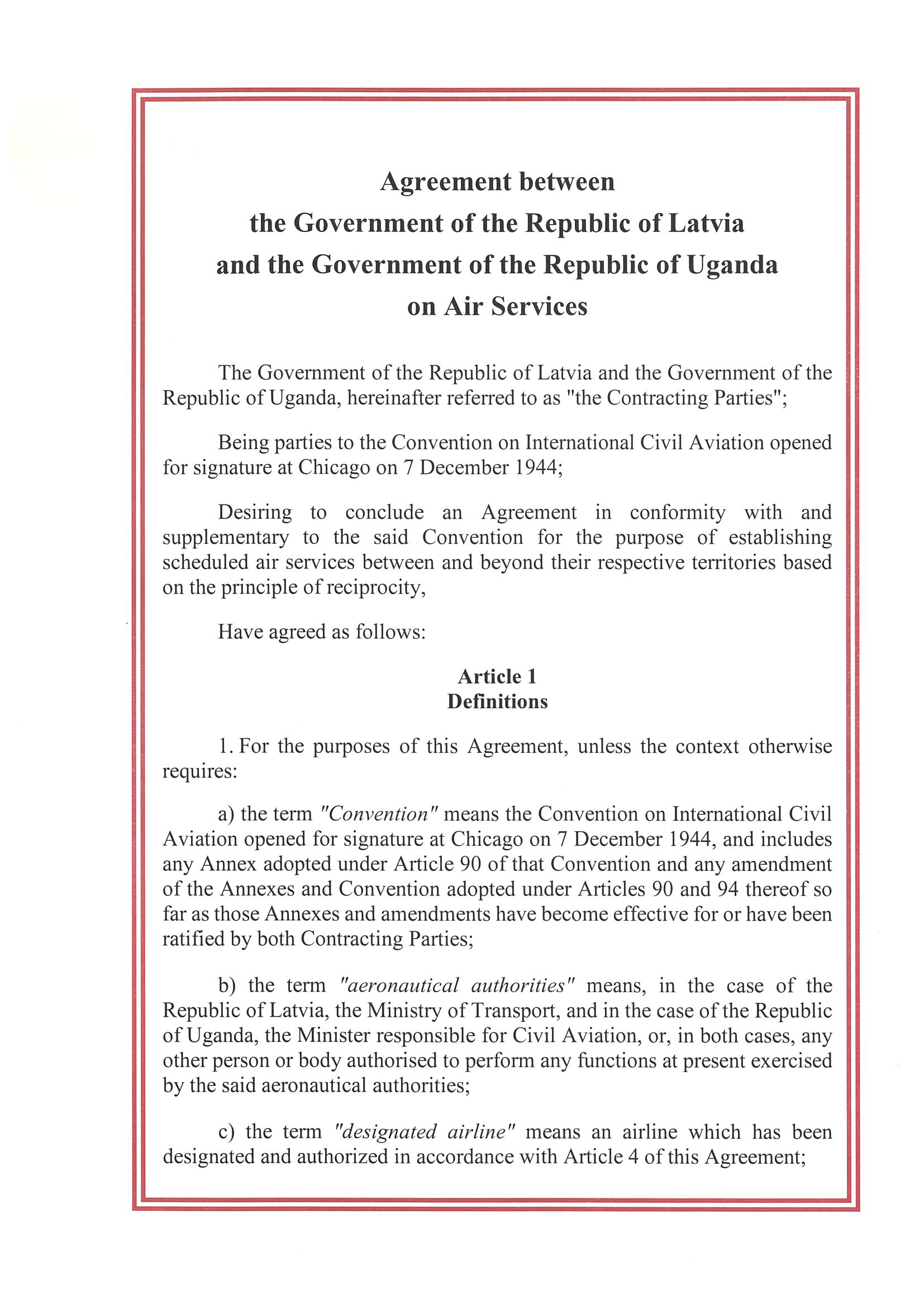 Nosaukums: AGREEMENT BETWEEN THE GOVERNMENT OF THE REPUBLIC OF LATVIA AND THE GOVERNMENT OF THE REPUBLIC OF UGANDA .. Veids: starptautisks dokuments Pieņemts: 12.05.2025.Publicēts: Latvijas Vēstnesis, 205, 23.10.2025.