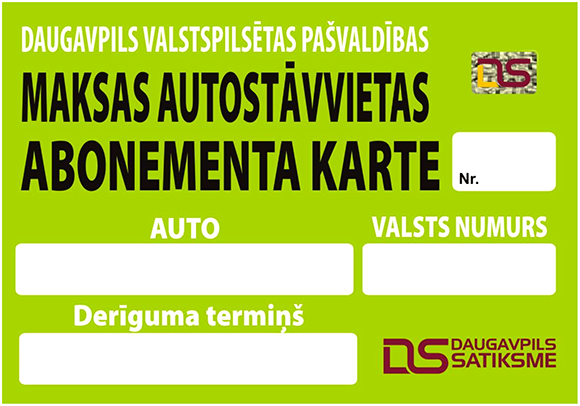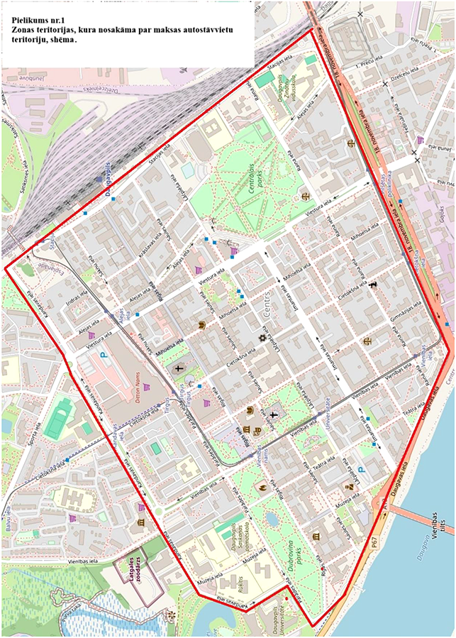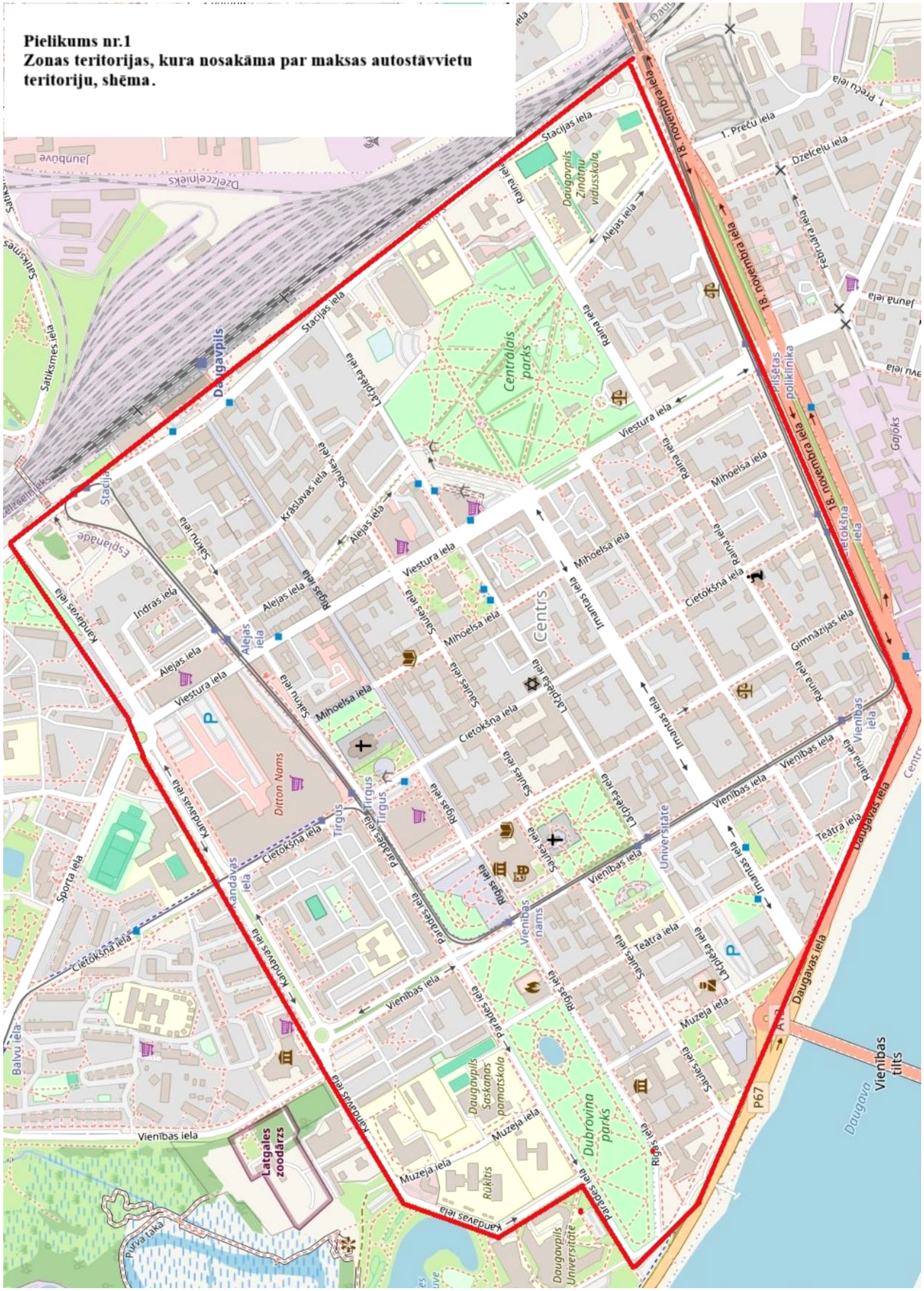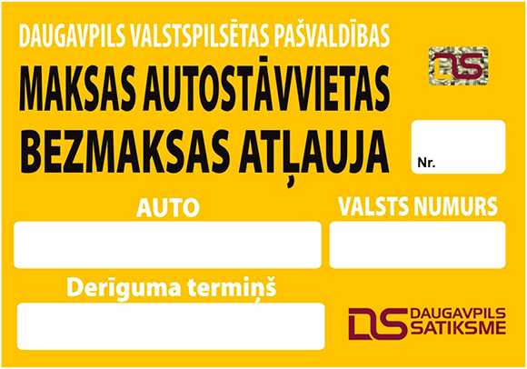 ar Daugavpils valstspilsētas pašvaldības domes 2025. gada 27. novembra lēmumu Nr. 747 (prot. Nr. 23, 26. §) Izdoti saskaņā ar likuma "Par autoceļiem" 6. panta 4.1 daļu 1. Saistošie noteikumi (turpmāk – noteikumi) nosaka Daugavpils valstspilsētas pašvaldības (turpmāk – pašvaldība) maksas autostāvvietu, kas atrodas ielu sarkano līniju robežās, apsaimniekošanas un lietošanas kārtību. 2. Noteikumos lietotie termini: 2.1. maksas autostāvvieta – mehānisko transportlīdzekļu novietošanai speciāli izveidota un aprīkota pašvaldības valdījumā esoša teritorija; 2.2. maksas autostāvvietas lietošana – transportlīdzekļa novietošana maksas autostāvvietā tās darbības laikā un apturēšana uz laiku, kas pārsniedz piecas minūtes; 2.3. maksas autostāvvietas lietotājs – mehāniskā transportlīdzekļa, kas novietots stāvēšanai maksas autostāvvietā, vadītājs, bet, ja tas nav zināms, reģistrācijas apliecībā norādītais transportlīdzekļa turētājs vai, ja transportlīdzekļa turētājs tajā nav norādīts, transportlīdzekļa īpašnieks (valdītājs), kā arī atļaujas par ārvalstīs reģistrēta transportlīdzekļa lietošanu Latvijā saņēmējs vai komersants, kurš veic attiecīgā transportlīdzekļa tirdzniecību, ja transportlīdzeklis nodots tirdzniecībai (tam uzstādītas tirdzniecības valsts reģistrācijas numura zīmes vai transportlīdzeklis reģistrēts tirdzniecības reģistrā); 2.4. maksas autostāvvietu pārvaldnieks – SIA "Daugavpils satiksme", kurai pašvaldības dome deleģējusi pārvaldes uzdevumu veikt maksas autostāvvietu ierīkošanu, apsaimniekošanu, pārvaldīšanu un maksas autostāvvietu lietošanas noteikumu ievērošanas kontroli; 2.5. maksas autostāvvietu kontrolieris – maksas autostāvvietu pārvaldnieka darbinieks, kas veic maksas autostāvvietu lietošanas noteikumu ievērošanas kontroli; 2.6. abonementa karte – dokuments, ko maksas autostāvvietu pārvaldnieks izsniedz maksas autostāvvietas lietotājam, kurš ir samaksājis avansā par maksas autostāvvietu lietošanu laika posmā no mēneša līdz gadam; 2.7. bezmaksas atļauja – dokuments, ko maksas autostāvvietu pārvaldnieks izsniedz saskaņā ar šiem noteikumiem; 2.8. elektroniskā kontroles iekārta – ierīce, kas nodrošina iespēju norēķināties par maksas autostāvvietas lietošanu ar priekšapmaksu un kas, pamatojoties uz maksas autostāvvietas lietotāja veikto samaksu, izsniedz maksājumu apliecinošu dokumentu – kvīti; 2.9. maksas autostāvvietas lietošanas priekšapmaksa – samaksa, ko maksas autostāvvietas lietotājs veic, izmantojot elektronisko kontroles iekārtu, iegādājoties mēneša abonementu vai veicot maksas autostāvvietas lietošanas apmaksas uzsākšanu, izmantojot SMS apmaksas pakalpojumu; 2.10. maksas autostāvvietas lietošanas pēcapmaksa – samaksa, ko maksas autostāvvietas lietotājs veic, ja nav veicis maksas autostāvvietas lietošanas priekšapmaksu, vai uz transportlīdzekļa priekšējā paneļa nav novietots derīgs autostāvvietas lietošanas dokuments (samaksu apliecinošs dokuments, abonements, bezmaksas atļauja vai invalīdu stāvvietu izmantošanas karte), vai priekšapmaksas beigu laiks ir pārsniedzis 5 minūtes; 2.11. SMS apmaksas pakalpojums – maksāšanas līdzeklis par transportlīdzekļa novietošanu maksas autostāvvietā, nosūtot īsziņu (izmantojot mobilo tālruni neatkarīgi no operatora) vai izmantojot mobilo lietotni, un naudas līdzekļu norakstīšana no maksas autostāvvietas lietotāja elektroniskās naudas konta par faktisko maksas autostāvvietas lietošanas laiku. 3. Maksas autostāvvietas darbības laiks darba dienās ir no plkst. 08:00 līdz plkst. 18:00, sestdienās no plkst. 08:00 līdz plkst. 16:00. Svētdienās un svētku dienās autostāvvietas lietošana ir bez maksas. Maksas autostāvvietas darba laiks ir norādīts ar papildzīmi zem ceļa zīmes. 4. Maksas autostāvvietu pārvaldnieks var ierobežot vai aizliegt maksas autostāvvietas lietošanu, ja tas nepieciešams pašvaldības vai ar pašvaldību saskaņotā pasākuma organizēšanai. 7. Par maksas autostāvvietas lietošanu tiek noteikta šāda tarifa likme – 1,00 euro stundā zonas teritorijā, kuras robežas noteiktas pa Stacijas ielu no 18. novembra ielas līdz Kandavas ielai, pa Kandavas ielu no Parādes ielas līdz Stacijas ielai, pa Parādes ielu no Daugavas ielas līdz Kandavas ielai, pa Daugavas ielu no 18. novembra ielas līdz Parādes ielai, pa 18. novembra ielu no Daugavas ielas līdz Stacijas ielai (1. pielikums). 8. Ielu posmus, kuri nosakāmi par maksas autostāvvietām, ar savu lēmumu apstiprina pašvaldības Transporta komisija. 11. Maksas autostāvvietu pārvaldniekam, izvērtējot lietderību un samērīgumu ar sabiedrības interešu ierobežojumu, ir tiesības noslēgt ar fiziskām un juridiskām personām, kuru komercdarbības nodrošināšanai paredzētās ēkas tuvumā atrodas autostāvvieta, līgumu uz laiku līdz vienam gadam par tiesībām pastāvīgi lietot atsevišķu maksas autostāvvietu. Mēneša maksa par šādas maksas autostāvvietas lietošanu tiek noteikta 50,00 euro apmērā. 12. Transportlīdzekļa daļēja novietošana maksas autostāvvietā neatbrīvo maksas autostāvvietas lietotāju no pienākuma veikt samaksu par autostāvvietu pilnā apmērā. 13. Ja maksas autostāvvietā novietotais transportlīdzeklis aizņem vairāk par vienu vietu, maksas autostāvvietas lietotājs veic apmaksu atbilstoši aizņemto vietu skaitam. 14. Maksas autostāvvietas lietošanas tiesības apliecina: 14.1. elektroniskās kontroles iekārtas izsniegta kvīts; 14.2. maksas autostāvvietu kontroliera rīcībā esošā informācija par norēķiniem, kas veikti, izmantojot SMS apmaksas pakalpojumu; 14.3. mēneša abonements šo noteikumu 10. punktā noteiktajās teritorijās esošo maksas stāvvietu lietošanai; 14.4. bezmaksas atļauja, kas apliecina tās īpašni