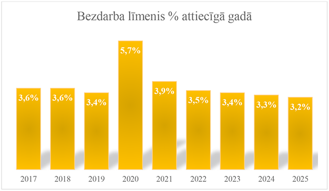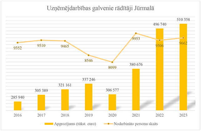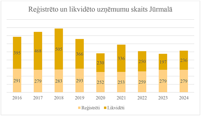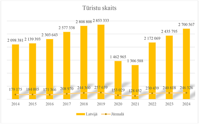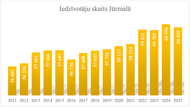 PASKAIDROJUMA RAKSTS PIE 2026. GADA BUDŽETAAtbilstoši likuma "Par pašvaldību budžetiem" 17. panta pirmajai daļai - ziņojums, kurā sniegta informācija par attiecīgās pašvaldības ekonomisko un sociālo situāciju, pašvaldības uzdevumiem saimnieciskajam gadam, kuram plāno pašvaldības budžetu, un tam sekojošiem diviem saimnieciskajiem gadiem. Sociālekonomiskā situācija Jūrmalā Iedzīvotāji Pēc Pilsonības un migrācijas lietu pārvaldes (turpmāk - PMLP) 2025. gada 01. jūlija datiem, Jūrmalas valstspilsētā ir 60 068 iedzīvotāji (sk. 1. attēlu). Laika posmā no 2011. gada līdz 2025. gadam vērojams iedzīvotāju skaita pieaugums par 7,25 %. Pēdējā gada laikā iedzīvotāju skaits ir nedaudz samazinājies par 0,54 %, jeb 328 iedzīvotājiem. 1. attēls Avots: PMLP Kā liecina PMLP dati, Jūrmalas valstspilsētas iedzīvotāju procentuāli lielākā daļa no kopējā iedzīvotāju skaita ir darbspējas vecumā, proti, 38 826 iedzīvotāji. Pēc darbspējas vecuma iedzīvotāji ir 13 449 un pirms darbspējas vecumā - 7 793 iedzīvotāji. Jūrmalas valstspilsētas iedzīvotāju vecuma struktūra (informācija uz 2025. gada 01. jūliju) ir attēlota 2. attēlā. 2. attēls Avots: PMLP Izglītojamo skaits izglītības iestādēs Atbilstoši Latvijas Republikas Izglītības ministrijas datiem Jūrmalas valstspilsētas izglītības iestādēs 2024./2025. mācību gada sākumā bija reģistrēts 6521 audzēknis, no kuriem 1746 uzsāka gaitas pirmsskolas izglītības iestādēs, 4497 vispārējās izglītības iestādēs un 278 profesionālās izglītības programmas realizējošās izglītības iestādēs. 2024./ 2025. mācību gada sākumā, salīdzinot ar iepriekšējo periodu, kopējais audzēkņu skaits ir nedaudz palielinājies (skat. 3. attēlu). 3. attēls Avots: LR Izglītības ministrija Nodarbinātība un bezdarbs Kā liecina Nodarbinātības valsts aģentūras dati (turpmāk - NVA), Jūrmalā bezdarba līmenis 2025. gadā bija 3,2 %, kas ir zemāk nekā vidēji Latvijā (3,8 %). Salīdzinoši ar 2024. gadu bezdarba līmenis ir samazinājies par 0,1 % (skat. 4. attēlu). 4. attēls Avots: NVA 2025. gadā, tāpat kā iepriekšējos gados, Jūrmalas valstspilsētas pašvaldība vasaras mēnešos līdzfinansēja darba algu Jūrmalā deklarētiem jauniešiem, kuri iegūst izglītību vispārējās, speciālās vai profesionālās izglītības iestādēs un kuri ir sasnieguši 15 gadu vecumu. Kopumā 2025. gada vasarā Jūrmalas valstspilsētas administrācija noslēdza līgumus ar 5 uzņēmumiem, līdzfinansējot darba algas 50 % apmērā no valstī noteiktās minimālās mēnešalgas 33 Jūrmalas valstspilsētā deklarētiem jauniešiem. Uzņēmējdarbība un tūrisms Uzņēmējdarbības vide Jūrmalā ir cieši saistīta ar pilsētas tūrisma jomas uzņēmējdarbību, tās pamatu veido tirdzniecības un pakalpojumu sektora uzņēmumi, kas sniedz pakalpojumus Jūrmalas iedzīvotājiem un tūristiem. Ņemot vērā Covid-19 pandēmijas izplatību, tās rezultātā ieviestos ierobežojumus un Jūrmalas valstspilsētā reģistrēto uzņēmumu pamatdarbību, kas tika tieši skarta, apgrozījums 2020. gadā samazinājās par vairāk kā 30 tūkstošiem euro salīdzinājumā ar 2019. gadu, taču 2021. gadā apgrozījums pat pārsniedza 2019. gada rādītājus un 2022. gadā, kā arī 2023. gadā tas turpinājis ievērojami palielināties - 2023. gadā pārsniedzot 2019. gada rādītājus par vairāk kā 170 tūkstošiem euro. Nodarbināto personu skaits sāka sarukt jau pirms Covid-19 pandēmijas izplatības, taču 2021. gadā ir bijis lielākais nodarbināto personu skaits pēdējo gadu laikā, sasniedzot 9953 nodarbinātas personas. 2022. gadā tas ir samazinājies uz 9506 nodarbinātām personām, bet 2023. gadā nedaudz palielinājies uz 9662 nodarbinātām personām. (skat. 5. attēlu). 5. attēls Avots: CSP Kā liecina Centrālās statistikas pārvaldes (turpmāk - CSP) informācija, Jūrmalas valstspilsētā reģistrēto uzņēmumu skaits, kas darbojas izmitināšanas un ēdināšanas jomā (NACE 2. red.), pēdējos gados ir bijis ļoti svārstīgs. Viesmīlības jomas uzņēmumi pandēmijas gados saskārās ar nopietniem izaicinājumiem, tādēļ 2021. gadā Jūrmalas valstspilsētā darbojās 154 izmitināšanas un ēdināšanas uzņēmumi un 2022. gadā 153, kas ir mazākais skaits pēdējo gadu periodā, bet 2023. gadā vērojams straujš skaita palielinājums un Jūrmalas valstspilsētā darbojās 162 izmitināšanas un ēdināšanas uzņēmumi, kas gandrīz sasniedz 2020. gada skaitu. (skat. 6. attēlu). 6. attēls Avots: CSP Laika periodā no 2017. gada līdz 2021. gadam vērojama uzņēmumu, kuru darbības nozare ir saistīta ar izmitināšanas un ēdināšanas pakalpojumiem, nodarbināto personu skaita sarukums, 2022. gadā skaits nedaudz palielinājies, tomēr 2023. gadā nedaudz samazinājies. Svārstīga situācija ir bijusi ar šo uzņēmumu apgrozījumu - 2020. gadā ir piedzīvots ievērojams apgrozījuma kritums, tomēr 2022. gadā apgrozījums ievērojami palielinājies, kas sasniedzis 2017. gada rādījumus un 2023. gadā turpinājis palielināties, ievērojami pārsniedzot 2017. gada rādījumus. (skat. 7. attēlu). 7. attēls Avots: CSP Atbilstoši Lursoft statistikas datiem 2024. gadā Jūrmalā ir likvidēti 236 uzņēmumi un ir reģistrēti 279 jauni uzņēmumi (skat. 8. attēlu), salīdzinoši ar 2023. gadu ir pieaudzis likvidēto un palicis nemainīgs reģistrēto uzņēmumu skaits. 2024. gadā Latvijā reģistrēti 9320 jauni uzņēmumi, bet likvidēti 9433 uzņēmumi, liecina Lursoft apkopotā informācija. Salīdzinot ar 2023. gadu, jaunreģistrēto uzņēmumu skaits ir palielinājies un palielinājies arī likvidēto uzņēmumu skaits. Lursoft apkopotā informācija parāda, ka 2024. gadā likvidēto uzņēmumu bijis par aptuveni 1,6 tūkstošiem vairāk nekā 2023. gadā. 8. attēls Avots: Uzņēmumu reģistrs Saskaņā ar CSP