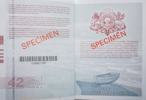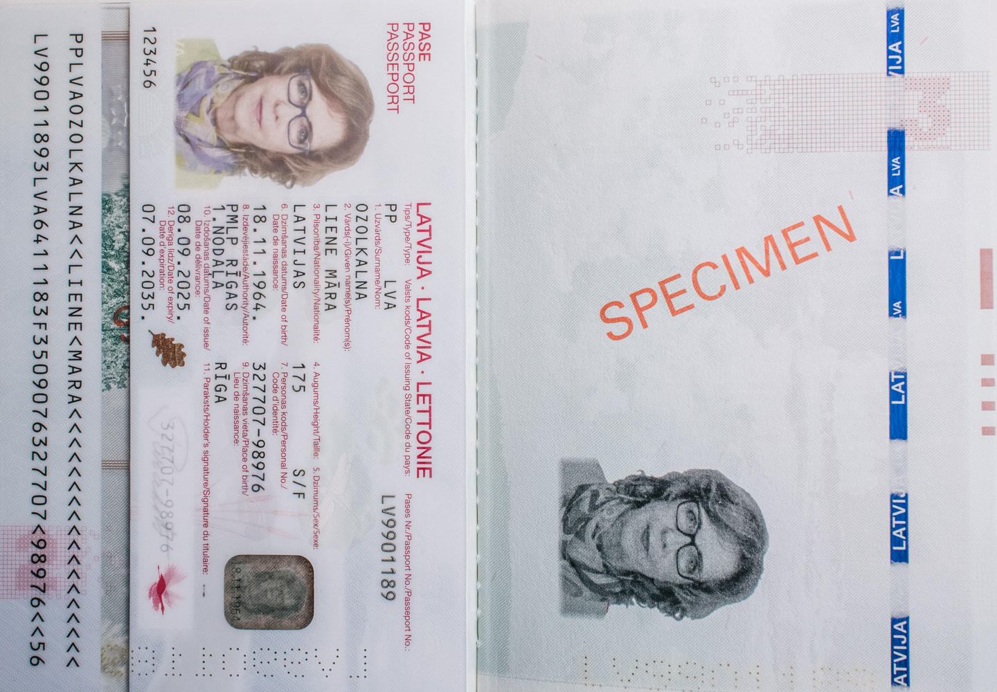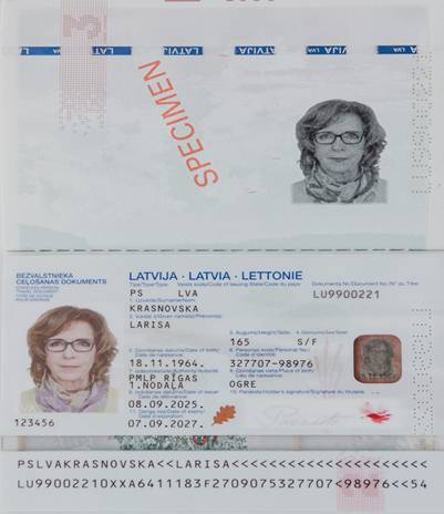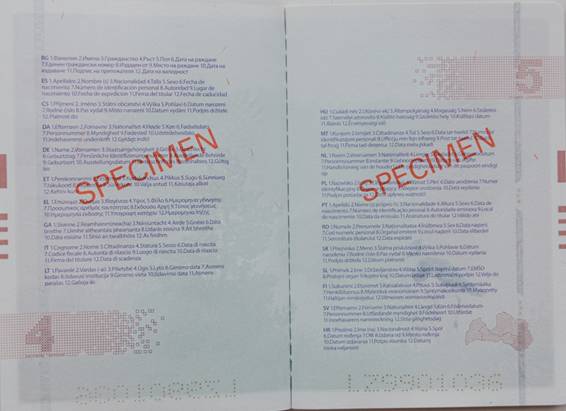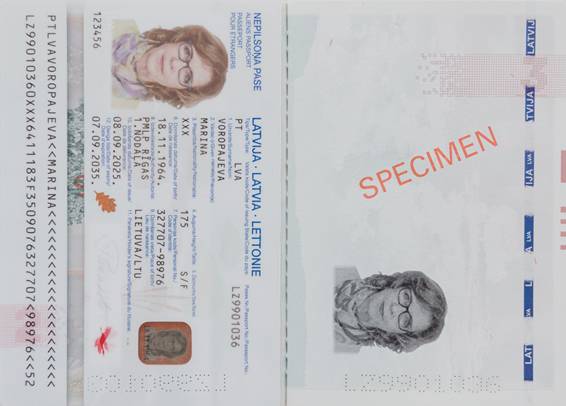 1. pielikums "2. pielikums Latvijas pilsoņa pases paraugsI. Pases vāks (1. vāks) (1. attēls) Krāsa: bordo sarkans-violets EIROPAS SAVIENĪBA LATVIJAS REPUBLIKA Valsts simbolika: lielais valsts ģerbonis zelta krāsā PASE Mikroshēmas simbols (saskaņā ar ICAO) II. Pases pirmā vāka iekšpuse (2. vāks) (2.a attēls) III. 1. lappuse (datu lapas otra puse) (2.b attēls) Eiropas Savienība Европейски Съюз Unión Europea Evropská unie Europæiske Union Europäische Union Euroopa Liit Еυρωπαϊκή 'Ενωση European Union Union Européenne An tAontas Eorpach Unione Europea Europos Sąjunga Európai Unió Unjoni Ewropea Europese Unie Unia Europejska União Europeia Uniunea Europeană Európska únia Evropska unija Euroopan unioni Europeiska Unionen Europska Unija Latvijas Republika Република Латвия República de Letonia Lotyšská republika Republikken Letland die Republik Lettland Läti Vabariik Δημοκρατία της Λετονίας Republic of Latvia la République de Lettonie Poblacht na Laitvia Repubblica di Lettonia Latvijos Respublika Lett Köztársaság Repubblika tal-Latvja de Republiek Letland Republika Łotewska República da Letónia Republica Letonă Lotyšská republika Republika Latvija Latvian tasavalta Republiken Lettland Republika Latvija Pase Паспорт Pasaporte Cestovní pas Pas Reisepass Pass Διαβατήριο Passport Passeport Pas Passaporto Pasas Útlevél Passaport Paspoort Paszport Passaporte Paşaport Cestovný pas Potni list Passi Pass Putovnica IV. 2. lappuse (datu lapa) (3.a attēls) Datu lapa - informācijas lauku nosaukumi latviešu, angļu, franču valodā, indekss pie informācijas lauka - zināšanai un atbilstošā tulkojuma atrašanai PASE/PASSPORT/PASSEPORT LATVIJA/LATVIA/LETTONIE Tips/Type/Type PP Valsts kods/Code of Issuing State/Code du pays LVA Pases Nr./Passport No./Passeport No. 1. Uzvārds/Surname/Nom 2. Vārds(-i)/Given name(-s)/Prénom(-s) 3. Pilsonība/Nationality/Nationalité 4. Augums/Height/Taille 5. Dzimums/Sex/Sexe 6. Dzimšanas datums/Date of birth/Date de naissance 7. Personas kods/Personal No./Code d'identité 8. Izdevējiestāde/Authority/Autorité 9. Dzimšanas vieta/Place of birth/Lieu de naissance 10. Izdošanas datums/Date of issue/Date de délivrance 11. Paraksts/Holder's signature/Signature du titulaire 12. Derīga līdz/Date of expiry/Date d'expiration V. 3. lappuse (3.b attēls) Tautība XXXXXXX Pases turētāja personvārda oriģinālforma latīņalfabētiskajā transliterācijā ir/ The original form of the name of the holder of this passport transliterated in Latin alphabet is/ La forme originale du nom du titulaire de ce passeport en translittération à l'alphabet latin est XXXXXXX Pases turētāja personvārda vai dzimtas uzvārda vēsturiskā forma ir/ The historical form of the given name or the family name of the holder of this passport is/ La forme historique du prénom ou du nom de famille du titulaire de ce passeport est XXXXXXX (Ierakstus izdara personalizācijas procesā) VI. 4. un 5. lappuse (4.a un 4.b attēls) Datu lapas informācijas lauku nosaukumu tulkojums Eiropas Savienības valstu valodās BG 1. Фамилия 2. Имена 3. Гражданство 4. Ръст 5. Пол 6. Дата на раждане 7. Единен граждански номер 8. Издаден от 9. Място на раждане 10. Дата на издаване 11. Подпис на притежателя 12. Дата на валидност ES 1. Apellidos 2. Nombre (s) 3. Nacionalidad 4. Talla 5. Sexo 6. Fecha de nacimiento 7. Número identificacón personal 8. Autoridad 9. Lugar de nacimiento 10. Fecha de expedición 11. Firma del titular 12. Fecha de caducidad CS 1. Přijmení 2. Jméno 3. Státní občanství 4. Výška 5. Pohlaví 6. Datum narození 7. Rodné číslo 8. Pas vydal 9. Místo narození 10. Datum vydání 11. Podpis držitele 12. Platnost do DA 1. Efternavn 2. Fornavne 3. Nationalitet 4. Højde 5. Køn 6. Fødselsdato 7. Personnummer 8. Myndighed 9. Fødested 10. Udstedelsesdato 11. Indehaverens underskrift 12. Gyldigt indtil DE 1. Name 2. Vornamen 3. Staatsangehörigkeit 4. Größe 5. Geschlecht 6. Geburtstag 7. Persönliche Identifizierungsnummer 8. Ausstellende Behörde 9. Geburtsort 10. Ausstellungsdatum 11. Unterschrift des Passinhabers 12. Gültig bis ET 1. Perekonnanimi 2. Eesnimed 3. Kodakondsus 4. Pikkus 5. Sugu 6. Sünniaeg 7. Isikukood 8. Väljaandja 9. Sünnikoht 10. Välja antud 11. Kasutaja allkiri 12. Kehtiv kuni EL 1. Επώνυμο 2.'Ονομα 3. Iθayέvειa 4. Υψος 5. Φύλο 6. Ημερομηνία γέννησης 7. Προσωπικός apιθμός ταυτότητaς 8. Εκδούσα Αρχή 9. Τόπος γεννήσεως 10. Ημερομηνία έκδοσης 11. Υπογραφή κατόχου 12. Ημερομηνία λήξης GA 1. Sloinne 2. Réamhainm (neacha) 3. Náisiúntacht 4. Airde 5. Gnéas 6. Dáta breithe 7. Uimhir aitheantais phearsanta 8. Údarás eisiúna 9. Áit bhreithe 10. Dáta eisiúna 11. Síniú an tsealbhóra 12. As feidhm IT 1. Cognome 2. Nome 3. Cittadinanza 4. Statura 5. Sesso 6. Data di nascita 7. Codice fiscale 8. Autorità di rilascio 9. Luogo di nascita 10. Data di rilascio 11. Firma del titolare 12. Data di scadenza LT 1. Pavardé 2. Vardas(-ai) 3. Pilietybé 4. Ūgis 5. Lytis 6. Gimimo data 7. Asmens kodas 8. Išdavusi institucija 9. Gimimo vieta 10. Išdavimo data 11. Asmens parašas 12. Galioja iki HU 1. Családi név 2. Utónév(-ek) 3. Állampolgárság 4. Magasság 5. Nem 6. Születési idö 7. Személyi azonosító 8. Kiállitó hatóság 9. Születési hely 10. Kiállítási dátum 11. Aláírás 12. Érvényességi idő MT 1. Kunjom 2. Ismijiet 3. Ċittadinanza 4. Tul 5. Sess 6. Data tat-twelid 7. Numru ta ' identifikazzjoni personali 8. Uffiċċju min fejn inħareġ 9. Post tat-twelid 10. Data tal-ħruġ 11. Firma tad-detentur 12. Data meta jiskadi NL 1. Naam 2. Voornamen