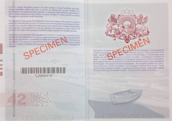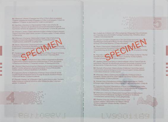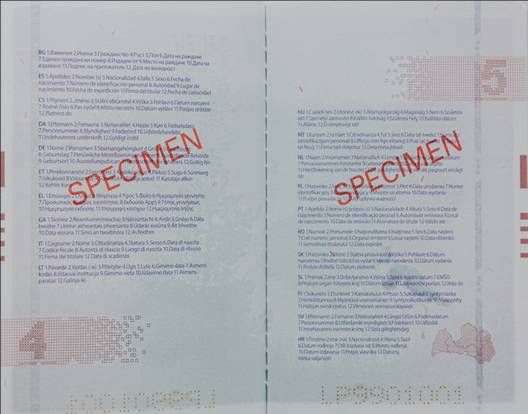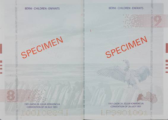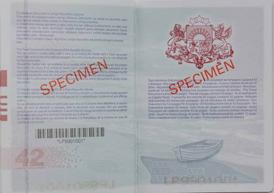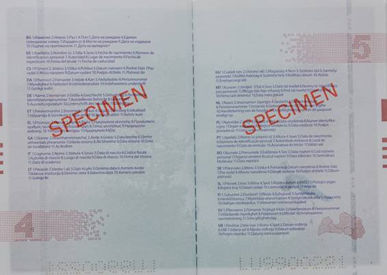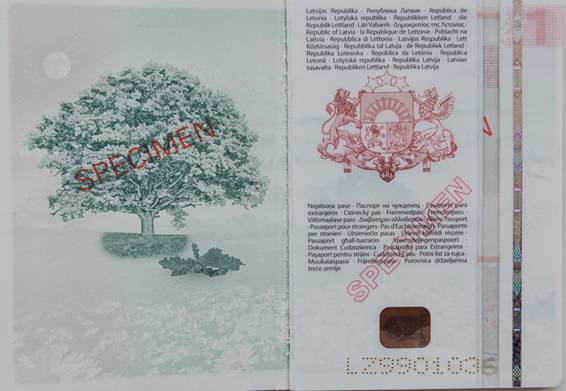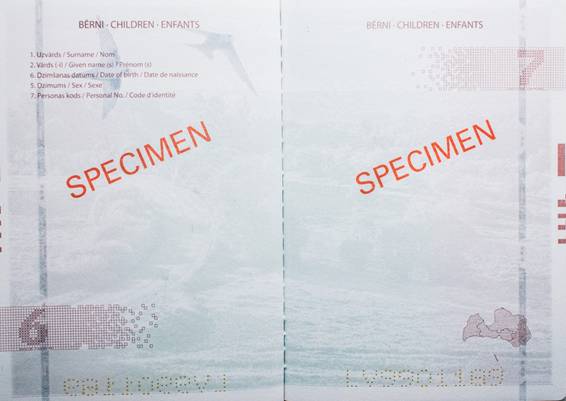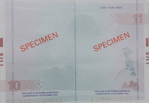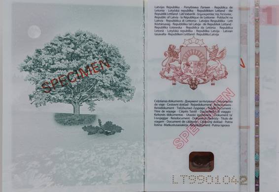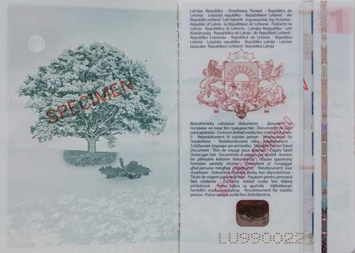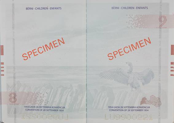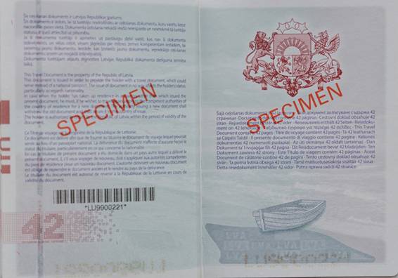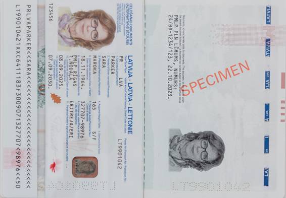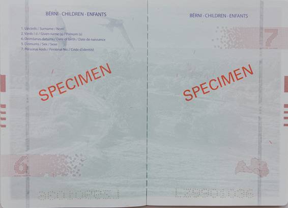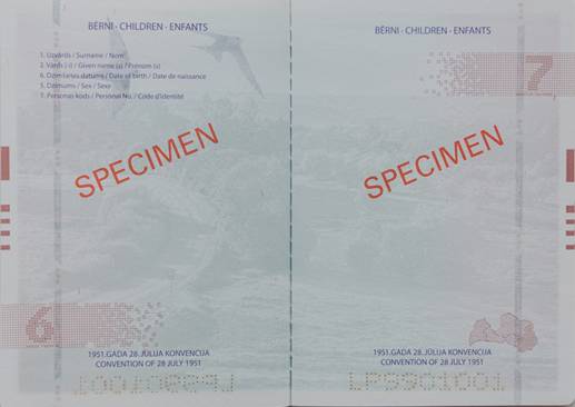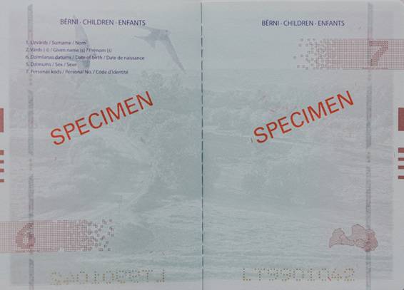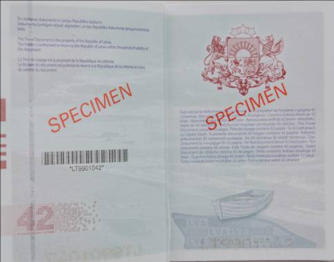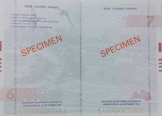 3. pielikums "4. pielikums Bezvalstnieka ceļošanas dokumenta paraugsI. Pases vāks (1. vāks) (1. attēls) Krāsa: brūna LATVIJAS REPUBLIKA REPUBLIC OF LATVIA Valsts simbolika: lielais valsts ģerbonis zelta krāsā CEĻOŠANAS DOKUMENTS TRAVEL DOCUMENT (CONVENTION OF 28 SEPTEMBER 1954) Mikroshēmas simbols (saskaņā ar ICAO) II. Pases pirmā vāka iekšpuse (2. vāks) (2.a attēls) III. 1. lappuse (2.b attēls) Latvijas Republika Република Латвия República de Letonia Lotyšská republika Republikken Letland die Republik Lettland Läti Vabariik Δημοκρατία της Λετονίας Republic of Latvia la République de Lettonie Poblacht na Laitvia Repubblica di Lettonia Latvijos Respublika Lett Köztársaság Repubblika tal-Latvja de Republiek Letland Republika Łotewska República da Letónia Republica Letonă Lotyšská republika Republika Latvija Latvian tasavalta Republiken Lettland Republika Latvija Bezvalstnieka ceļošanas dokuments Документ за пътуване на лице без гражданство Documento de viaje para apátridas Cestovní doklad osoby bez státní příslušnosti Rejsedokument til statsløs person Reiseausweis für Staatenlose Kodakondsuseta isiku reisidokument Ταξιδιωτικό έγγραφο για απάτριδες Stateless Person Travel Document Titre de voyage pour apatride Cáipéis Taistil Duine gan Stát Documento di viaggio per apolidi Asmens be pilietybės kelionės dokumentas Utazási igazolvány hontalan személy részére Dokument ta' l-ivvjaġġar għal-persuna mingħajr ċittadinanza Reisdocument voor staatlozen Dokument Podróży osoby bez obywatelstwa Título de viagem para Apátridas Paşaport pentru persoană fără cetăţenie Cestovný doklad osoby bez štátnej príslušnosti Potna listina za apatrida Valtiottoman henkilön matkustusasiakirja Resedokument för statslös person Putna isprava osobe bez državljanstva IV. 2. lappuse (3.a attēls) Datu lapa - informācijas lauku nosaukumi latviešu, angļu, franču valodā, indekss pie informācijas lauka - zināšanai un atbilstošā tulkojuma atrašanai BEZVALSTNIEKA CEĻOŠANAS DOKUMENTS STATELESS PERSON TRAVEL DOCUMENT TITRE DE VOYAGE POUR APATRIDE LATVIJA/LATVIA/LETTONIE Tips/Type/Type PS Valsts kods/Code of Issuing State/Code du pays LVA Dokumenta Nr./Document No./No du Titre (divi burti un septiņi cipari) 1. Uzvārds/Surname/Nom 2. Vārds(-i)/Given name(s)/Prénom(s) 3. Augums/Height/Taille 4. Dzimums/Sex/Sexe 5. Dzimšanas datums/Date of birth/Date de naissance 6. Personas kods/Personal No./Code d'identité 7. Izdevējiestāde/Authority/Autorité 8. Dzimšanas vieta/Place of birth/Lieu de naissance 9. Izdošanas datums/Date of issue/Date de délivrance 10. Paraksts/Holder's signature/Signature du titulaire 11. Derīga līdz/Date of expiry/Date d'expiration V. 3. lappuse (3.b attēls) VI. 4. un 5. lappuse (4.a un 4.b attēls) Datu lapas informācijas lauku nosaukumu tulkojumi Eiropas Savienības valstu valodās BG 1. Фамилия 2. Имена 3. Ръст 4. Пол 5. Дата на раждане 6. Единен граждански номер 7. Издаден от 8. Място на раждане 9. Дата на издаване 10. Подпис на притежателя 11. Дата на валидност ES 1. Apellidos 2. Nombre(s) 3. Talla 4. Sexo 5. Fecha de nacimiento 6. Número de identificacón personal 7. Autoridad 8. Lugar de nacimiento 9. Fecha de expedición 10. Firma del titular 11. Fecha de caducidad CS 1. Přijmení 2. Jméno 3. Výška 4. Pohlaví 5. Datum narození 6. Rodné číslo 7. Pas vydal 8. Místo narození 9. Datum vydání 10. Podpis držitele 11. Platnost do DA 1. Efternavn 2. Fornavne 3. Højde 4. Køn 5. Fødselsdato 6. Personnummer 7. Myndighed 8. Fødested 9. Udstedelsesdato 10. Indehaverens underskrift 11. Gyldigt indtil DE 1. Name 2. Vornamen 3. Größe 4. Geschlecht 5. Geburtstag 6. Persönliche Identifizierungsnummer 7. Ausstellende Behörde 8. Geburtsort 9. Ausstellungsdatum 10. Unterschrift des Passinhabers 11. Gültig bis ET 1. Perekonnanimi 2. Eesnimed 3. Pikkus 4. Sugu 5. Sünniaeg 6. Isikukood 7. Väljaandja 8. Sünnikoht 9. Välja antud 10. Kasutaja allkiri 11. Kehtiv kuni EL 1. Επώνυμο 2. 'Ονομα 3. Υψος 4. Φύλο 5. Ημερομηνία γέννησης 6. Προσωπικός apιθμός ταυτότητaς 7. Εκδούσα Αρχή 8. Τόπος γεννήσεως 9. Ημερομηνία έκδοσης 10. Υπογραφή κατόχου 11. Ημερομηνία λήξης GA 1. Sloinne 2. Réamhainm (neacha) 3. Airde 4. Gnéas 5. Dáta breithe 6. Uimhir aitheantais phearsanta 7. Údarás eisiúna 8. Áit bhreithe 9. Dáta eisiúna 10. Síniú an tsealbhóra 11. Ss feidhm IT 1. Cognome 2. Nome 3. Statura 4. Sesso 5. Data di nascita 6. Codice fiscale 7. Autorità di rilascio 8. Luogo di nascita 9. Data di rilascio 10. Firma del titolare 11. Data di scadenza LT 1. Pavardé 2. Vardas(-ai) 3. Ūgis 4. Lytis 5. Gimimo data 6. Asmens kodas 7. Išdavusi institucija 8. Gimimo vieta 9. Išdavimo data 10. Asmens parašas 11. Galioja iki HU 1. Családi név 2. Utónév(-ek) 3. Magasság 4. Nem 5. Születési idö 6. Személyi azonosító 7. Kiállító hatóság 8. Születési hely 9. Kiállítási dátum 10. Aláírás 11. Érvényességi idő MT 1. Kunjom 2. Ismijiet 3. Tul 4. Sess 5. Data tat-twelid 6. Numru ta' identifikazzjoni personali 7. Uffiċċju min fejn inħareġ 8. Post tat-twelid 9. Data tal-ħruġ 10. Firma tad-detentur 11. Data meta jiskadi NL 1. Naam 2. Voornamen 3. Lengte 4. Geslacht 5. Geboortedatum 6. Persoonsnummer 7. Instantie 8. Geboorteplaats 9. Datum van afgifte 10. Handtekening van de houder 11. De geldigheidsduur van dit paspoort eindigt op PL 1. Nazwisko 2. Imię 3. Wzrost 4. Płeć 5. Data urodzenia 6. Numer identyfikacyjny 7. Organ wydający 8. Miejsce urodzenia 9. Data wydania 10. Podpis posiadacza 11. Data upływu waźności PT 1. Apelido 2. N