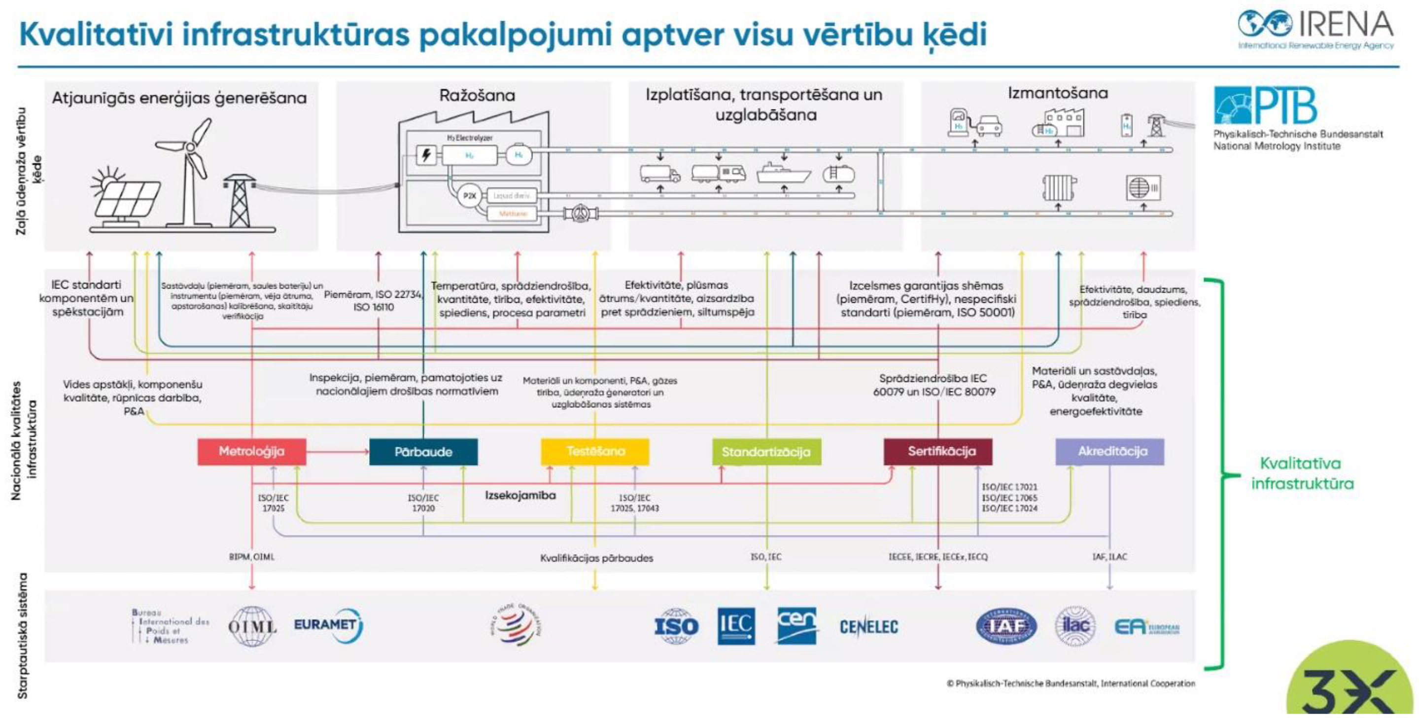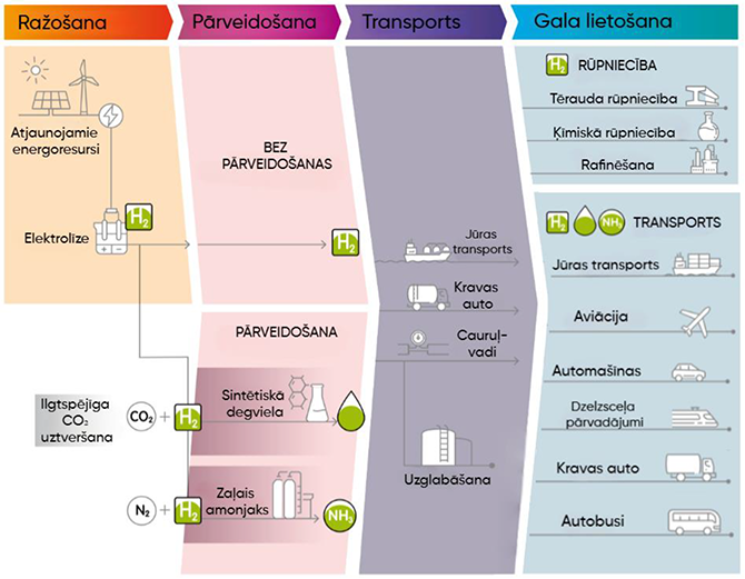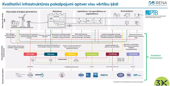 Zaļā ūdeņraža ražošana pēdējos gados ir piedzīvojusi ievērojamu tehnoloģisko progresu, ko nosaka nepieciešamība pēc tīrākiem enerģijas risinājumiem. Elektrolīzes efektivitāte: Protonu apmaiņas membrānu34 un sārmu elektrolīzes iekārtu efektivitāte ir sasniegusi vairāk nekā 80 %, padarot zaļā ūdeņraža ražošanu rentablāku un mērogojamu. Jaunākās inovācijas ietver fotoelektroķīmiskās sistēmas, kas izmanto saules gaismu tiešai ūdens sadalīšanai ūdeņradī un skābeklī, vēl vairāk uzlabojot enerģijas konversijas rādītājus. Jaunie katalizatori: Jaunu elektrokatalizatoru, piemēram, materiālu uz rutēnija bāzes, izstrāde ir ļāvusi ražot ūdeņradi zemākā temperatūrā un spiedienā. Šie katalizatori uzlabo elektrolizatoru izturību un selektivitāti, padarot tos piemērotākus rūpnieciska mēroga lietojumiem. Bioloģiskās un hibrīdmetodes: Pētījumi par bioūdeņraža ražošanu, izmantojot aļģes un hibrīdsistēmas, kas apvieno biotehnoloģijas ar ķīmiskiem procesiem, ir daudzsološi ilgtspējīgai ūdeņraža ražošanai ar zemu enerģijas patēriņu. Lai gan patlaban ieguvumi ir pieticīgi, šīs metodes piedāvā ceļu turpmākai inovācijai zaļā ūdeņraža ražošanā. Zaļais ūdeņradis arvien biežāk tiek izmantots kā izejviela zemas CO₂ emisijas ķimikāliju ražošanai, kas ir būtiskas, lai dekarbonizētu dažādus rūpnieciskos procesus. Zaļais amonjaks: Zaļais amonjaks, ko sintezē, izmantojot zaļo ūdeņradi un slāpekli, apiet Hābera-Boša procesu, kas rada lielas oglekļa emisijas. Nesenie sasniegumi specializēto katalizatoru jomā ir uzlabojuši efektivitāti, padarot zaļo amonjaku par enerģijas nesēju un dzīvotspējīgu alternatīvu mēslošanas līdzekļiem35. Metanols un organiskās ķīmiskās vielas: Zaļo ūdeņradi un uztverto CO2 var izmantot, lai ražotu metanolu36, kas ir galvenā rūpnieciskā ķimikālija un potenciālā degviela. Inovācijas katalītiskajos procesos ir samazinājušas metanola ražošanas enerģētisko pēdu, kas atbilst aprites ekonomikas mērķiem. Ilgtspējīga degviela: Zaļajam ūdeņradim ir izšķiroša nozīme sintētisko degvielu, piemēram, aviācijas un kuģniecības zaļo – degvielu ražošanā, vienlaikus šo sintētisko degvielu nākotnes loma vēl nav viennozīmīgi skaidra. Uzlabotas reaktoru konstrukcijas un integrācija ar atjaunīgiem enerģijas avotiem ir padarījusi šīs degvielas dzīvotspējīgākas, lai dekarbonizētu grūti ietekmējamas nozares. Enerģijas uzglabāšana un tīkla balansēšana: Zaļo ūdeņradi teorētiski var izmantot atjaunīgās enerģijas pārpalikumu uzglabāšanai, risinot vēja un saules enerģijas nepastāvības problēmu, tomēr šobrīd šī opcija nešķiet izmaksu efektīva, salīdzinot ar citām uzglabāšanas metodēm. Eksporta iespējas: Šobrīd daudzas pasaules valstis izstrādā stratēģijas no ūdeņraža iegūtu produktu, piemēram, amonjaku vai metanolu, eksportam, vai ES gadījumā – ražošanai plašākam ES tirgum, ne tikai vietējām vajadzībām. Transports: Zaļo ūdeņradi var izmantot, lai dekarbonizētu smago transportu, kā arī dzelzceļu, gadījumos, kad elektrifikācija nav ekonomiski pamatota. Detalizētāk globālā situācija, tehnoloģiskās iespējas un izaicinājumi izanalizēta pārskata rakstā37. Tomēr – neskatoties uz pieejamajiem tehniskajiem risinājumiem un dažādiem ambicioziem plāniem, ņemot vērā izmaksas un citu šķēršļus ir būtiska starpība starp uzstādījumiem un to ekonomisko pamatotību38 Globālās enerģētikas attīstības tendences un regulējuma ietvars tiek veidots, balstoties uz nozīmīgākajām starptautiskajām iniciatīvām un pētījumiem, ko izstrādā IRENA un IEA. Šīs organizācijas veic detalizētu analīzi par enerģijas pārejas scenārijiem, tehnoloģiju attīstību un politikas instrumentiem, kas nepieciešami klimatneitralitātes mērķu sasniegšanai. IRENA analītiskie ziņojumi sniedz būtisku ieguldījumu ilgtspējīgas enerģētikas attīstībā, izceļot atjaunīgās enerģijas potenciālu un investīciju nepieciešamību. Viens no nozīmīgākajiem dokumentiem ir "Global Renewables Outlook: Energy Transformation 2050" jeb "Pasaules atjaunīgo energoresursu perspektīvas: Enerģētikas transformācija 2050. gadam", kas analizē iespējamos dekarbonizācijas scenārijus un to ekonomisko ietekmi līdz 2050. gadam. Ziņojumā uzsvērts, ka sistemātiska pāreja uz AER var nodrošināt vairāk nekā 70 % no pasaules primārās enerģijas patēriņa, vienlaikus radot līdz pat 42 miljoniem jaunu darbavietu atjaunīgās enerģijas nozarē39. Papildus tam, "Renewable Capacity Statistics 2023" jeb "Statistika par atjaunīgo energoresursu ražošanas jaudu 2023. gadā" norāda, ka 2022. gadā globālā atjaunīgās enerģijas jauda pieauga par 9,6 %, sasniedzot 3 372 GW. Nozīmīgākais pieaugums novērots saules un vēja enerģijas segmentā, kas kopā veidoja 88 % no jaunās uzstādītās jaudas40. Papildus tam, IRENA 2024. gada novembrī publicēja ziņojumu "Quality Infrastructure Roadmap for Green Hydrogen" jeb "Zaļā ūdeņraža kvalitatīvas infrastruktūras ceļvedis", kurā detalizēti izklāstīta globālās kvalitatīvas infrastruktūras nozīme zaļā ūdeņraža attīstībā41. Ziņojums piedāvā ceļvedi standartizācijas, sertifikācijas un atbilstības novērtēšanas sistēmu izveidei, lai nodrošinātu starptautiski saskaņotu pieeju zaļā ūdeņraža tirgum. Galvenie ziņojuma secinājumi: • Nepieciešamība veidot vienotus standartus un sertifikācijas sistēmas, lai nodrošinātu uzticamu un pārredzamu tirgu zaļajam ūdeņradim; • Ieteikumi izstrādāt efektīvas verifikācijas un izsekojamības sistēmas, kas ļautu tirgus dalībniekiem pierādīt ūdeņraža ilgtspējību; • Ieteikts veicināt politikas ietvaru, kas atbalsta kvalitātes infrastruktūras ieviešanu un investīciju piesaisti; 