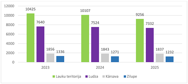 1. attēls. Iedzīvotāju skaits Ludzas novada lauku teritorijās un pilsētās 2023.-2025. gadā