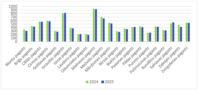 2. attēls. Iedzīvotāju skaits Ludzas novada pagastos, 2024.-2025. gads