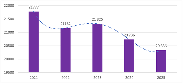 Vērtējot situāciju kopumā, konstatējama ilgstoša un strukturāla iedzīvotāju skaita samazināšanās Ludzas novada administratīvajā teritorijā. Laika posmā no 2021. līdz 2025. gadam iedzīvotāju skaits samazinājies par aptuveni 6,6 %, kas apliecina noturīgu demogrāfiskās lejupslīdes tendenci (skatīt 3. attēlu). Minētās demogrāfiskās izmaiņas negatīvi ietekmē pašvaldības fiskālo kapacitāti, samazinot nodokļu ieņēmumu potenciālu un vienlaikus palielinot spiedienu uz publisko pakalpojumu un infrastruktūras uzturēšanas izmaksām.
