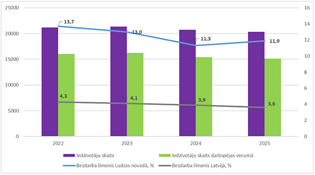 4. attēls. Iedzīvotāju skaita un bezdarba līmeņa attiecība Latvijā un Ludzas novadā laikā no 2022. gada līdz 2025. gadam