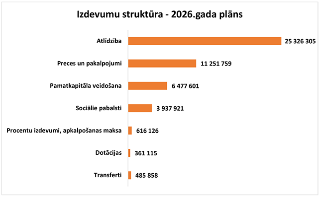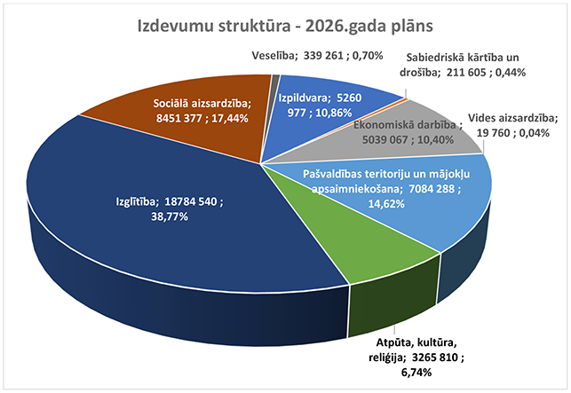 2026. gadā kopējie izdevumi plānoti 48.456 milj. EUR apmērā. Lielāko daļu budžeta veido izglītības jomas izdevumi - 38.77% jeb 18,784 milj. EUR. Papildus valsts finansējumam pašvaldība nodrošina piemaksas profesionālās ievirzes mākslas, mūzikas un sporta skolu pedagogu darba likmēm, sekmējot atalgojuma konkurētspēju un izglītības kvalitāti novadā.