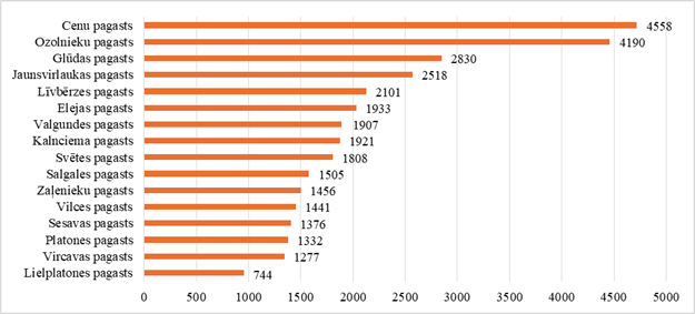 No 16 Jelgavas novada pagastiem iedzīvotāju skaita ziņā lielākie ir Cenu pagasts (4558 iedzīvotāji), Ozolnieku pagasts (4190 iedzīvotāji) un Glūdas pagasts (2830 iedzīvotāji), mazākais - Lielplatones pagasts ar 744 iedzīvotājiem.