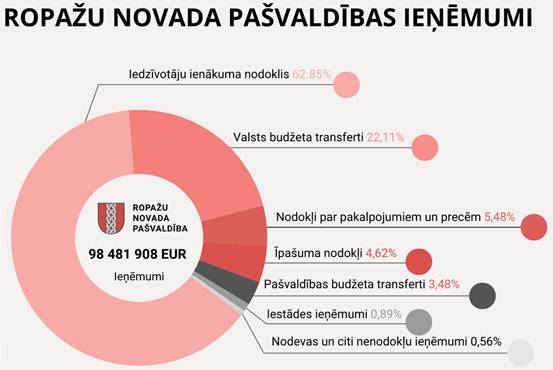 Ropažu novada pašvaldības 2026. gada budžeta konsolidētie ieņēmumi plānoti 98 481 908 EUR apjomā. Budžeta plānā iekļauti arī Ropažu novada pašvaldības, PA "Stopiņu ambulance" un Gaismas pamatskolas ieņēmumi. 2026. gada ieņēmumu plāns, salīdzinot ar 2025. gadā apstiprināto budžeta ieņēmumu plānu, ir palielinājies par 0,3 %, jeb par 297 248 EUR. Ieņēmumu palielinājums saistīts ar to, ka palielināti plānotie ieņēmumi no iedzīvotāju ienākuma nodokļa, taču samazināti plānotie ieņēmumi no nodokļiem par precēm un pakalpojumiem. 2026. gada ieņēmumi pedagogu atalgojumam plānoti 12 mēnešu periodam, atšķirībā no iepriekšējiem gadiem, kad tie sākotnēji tika plānoti 8 mēnešiem. Ieņēmumus veido nodokļu ieņēmumi, nenodokļu ieņēmumi (no uzņēmējdarbības, nodevām, sodiem un sankcijām), pārējie nenodokļu ieņēmumi (no pašvaldības īpašuma iznomāšanas un pārdošanas), ieņēmumi no iestāžu sniegtajiem maksas pakalpojumiem un citi pašu ieņēmumi, kā arī transferti (mērķdotācijas, kas tiek saņemtas no atsevišķām ministrijām un pašvaldībām un paredzētas galvenokārt pedagogu darba samaksai, kā arī ES fondu finansēto projektu īstenošanai un pašvaldību maksājumiem par izglītības pakalpojumiem). Ropažu novada pašvaldības pamatbudžeta kontu atlikums uz 2026. gada 1. janvāri ir 21 737 529 EUR, savukārt naudas līdzekļu atlikums uz 2025. gada 31. decembri ir 7409 EUR. Attēls Nr. 1 (Avots: Ropažu novada pašvaldība) Iedzīvotāju ienākuma nodoklis (IIN) 2026. gadā plānots 61 892 596 EUR apmērā, kas ir par 8,3 %, jeb 4 758 303 EUR vairāk nekā tika plānots 2025. gadā. Nekustamā īpašuma nodokļa (NĪN) plānotie ieņēmumi – 4 552 120 EUR, kas ir par 1 % jeb par 67 171 EUR mazāk nekā plānots 2025. gadā. Dabas resursu nodokļa ieņēmumi plānoti 5 400 000 EUR apmērā. Saņemtie transferti no valsts budžeta plānoti 21 777 814 EUR apmērā. Nenodokļu ieņēmumus veido valsts un pašvaldības nodevas, naudas sodi un sankcijas 100 000 EUR un plānotie ieņēmumi no pašvaldības īpašumu pārdošanas, kopumā 325400 EUR. Ieņēmumi no citām pašvaldībām funkciju nodrošināšanai plānoti 3 427 400 EUR apmērā, (saistošajos noteikumos tiek izslēgti savstarpējie ieņēmumi un izdevumi starp Ropažu novada pašvaldību, PA "Stopiņu ambulance" un Gaismas pamatskolu). Maksas pakalpojumus un citus pašu ieņēmumus 880 238 EUR apmērā veido maksa par izglītības pakalpojumiem, ieņēmumi par nomu un īri, maksa par ārstniecības pakalpojumiem, ieņēmumi par sniegtajiem komunālajiem pakalpojumiem, ieņēmumi par biļešu realizāciju, ieņēmumi par pārējiem sniegtajiem maksas pakalpojumiem.