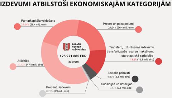 Attēls Nr. 2 (Avots: Ropažu novada pašvaldība) Budžeta konsolidētie izdevumi plānoti 125 271 885 EUR apmērā (neieskaitot Valsts kases aizņēmumu pamatsummas atmaksas). Tas ir par 15 940 113 EUR vairāk nekā 2025. gada konsolidētais budžeta plāns. 2026. gada izdevumu plānā valsts finansētu pedagogu atlīdzība plānota 12 mēnešu periodam, kā arī 2025. gadā pašvaldība īstenoja vairākus infrastruktūras projektus gan no aizņemtajiem līdzekļiem, gan Eiropas struktūrfondu līdzfinansētus projektus. 2026. gadā būtisks izdevumu pieaugums ir pamatkapitāla veidošanai, kas, galvenokārt, saistīts ar investīciju projektu īstenošanu. Salīdzinot ar 2025. gadu, par 19 % lielāki izdevumi plānoti sociālo pabalstu izmaksām. Atlīdzībai plānotais pieaugums plānots 8 % apmērā. Vispārējie valdības dienesti Izdevumi plānoti 20 416 268 EUR apmērā un tie paredzēti pašvaldības darbības nodrošināšanai – vadībai, finanšu vadībai un klientu apkalpošanai. Kopējais plānotais līdzekļu apjoms šajā funkcijā ir par 1 539 984 EUR lielāks nekā 2025. gada plāns. Kā galvenais palielinājums jāmin pieaugums iemaksām pašvaldību izlīdzināšanas fondā 10 831 899 EUR, jeb par 1 309 077 EUR vairāk, nekā 2025. gadā. Vispārējo valdības dienestu funkcijām tiek plānoti sekojoši izdevumi: o Deputātu, t.sk. vadības izdevumi – 642 309 EUR; o Domes izveidoto pastāvīgo komisiju izdevumi – 263 457 EUR; o Attīstības, īpašumu un investīciju departaments (vadība un Projektu vadības nodaļa) – 492 498 EUR; o Juridiskais, publisko iepirkumu un personālvadības departaments – 1 251 711 EUR; o Informācijas un komunikācijas tehnoloģiju departaments – 684 262 EUR; o Finanšu un grāmatvedības departaments – 1 368 281 EUR; o Sabiedrisko attiecību nodaļa – 561 231 EUR; o Kanceleja un Valsts un pašvaldību vienotie klientu apkalpošanas centri – 421 097 EUR; o Teritoriālās pārvaldes – 767 084 EUR; o Ropažu novada pašvaldības administrācija – 876 267 EUR; o Pašvaldības iemaksas pašvaldību finanšu izlīdzināšanas fondā 10 831 899 EUR apmērā; o Kredītu apkalpošanas un procentu maksājumi – 981 898 EUR; o Izdevumi neparedzētiem gadījumiem (rezerves fonds) – 1 000 000 EUR. Aizsardzība Plānoti izdevumi civilai aizsardzībai 55 296 EUR. Sabiedriskā kārtība un drošība Plānoti izdevumi pašvaldības policijas darba nodrošināšanai 2 572 331 EUR, Dzimtsarakstu nodaļas darbības nodrošināšanai – 196 559 EUR. Pašvaldība plānojusi arī turpmāk atbalstīt Inčukalna un Krimuldas brīvprātīgo ugunsdzēsēju biedrības piešķirot dotāciju – 36 400 EUR apmērā. Kopā sabiedriskajai drošībai un kārtībai plānots tērēt par 13 % vairāk, nekā 2025. gadā. Ekonomiskā darbība Ekonomiskās darbības funkcijas nodrošināšanai plānoti izdevumi 14 262 873 EUR apmērā. No tiem: o Ielu un ceļu uzturēšanai kopā plānoti 2 214 794 EUR, no tiem autoceļu fonda līdzekļi ir 637 894 EUR. o Turpināsies darbi pie investīciju projektiem ielu, ceļu sakārtošanai, pamatojoties uz apstiprināto investīciju plānu 2026.–2028. gadam, kā arī citiem investīciju projektiem 4 714 794 EUR apmērā (tajā skaitā dubultās virsmas apstrāde autoceļiem visās teritoriālajās pārvaldēs, kopā par 2,5 milj. EUR). o Būvniecības uzraudzības funkciju nodrošina Ropažu novada pašvaldības Būvvalde, kuras budžetā paredzēti – 977 120 EUR. o Tūrisma jomas kopējie izdevumi – 215 901 EUR, t.sk. tūrisma speciālistu atalgojums un tūrisma jomas aktivitātes. o Uzņēmējdarbības atbalstam plānoti 121 213 EUR. o Attīstības, īpašumu un investīciju departamenta Attīstības plānošanas nodaļas izdevumi – 1 007 798 EUR. o Turpinot iesākto iniciatīvu, plānots atbalsts iedzīvotāju kopienām (sabiedrības līdzdalības budžets) – 289 836 EUR. o Sadarbībā ar Nodarbinātības valsts aģentūru plānoti nodarbinātības pasākumi vasaras brīvlaikā jauniešiem no 15–18 gadu vecumam par kopējo summu 108 038 EUR. o Ropažu novada pašvaldības Centrālā administrācijas kapitāldaļu pārvaldības izmaksas – 136 419 EUR. Ekonomiskās darbības izdevumi, salīdzinot ar 2025. gadā plānotajiem, pieauguši par 48 %. Vides aizsardzība Kopējie izdevumi vides aizsardzības funkcijas nodrošināšanai plānoti 4 065 900 EUR apmērā, kas par vairākām reizēm pārsniedz 2025. gada plānotos izdevumus. Tas saistīts ar diviem jauniem plānotajiem investīciju projektiem – meliorācijas un lietus ūdens kanaliācijas būvniecība un pārbūve Ropažu novadā par 1 500 000 EUR un Kanalizācijas tīklu būvniecība Ropažu novadā par 2 500 000. Pārējie izdevumi decentralizētās kanalizācijas apsaimniekošanai visā novadā. Pašvaldības teritoriju un mājokļu apsaimniekošana Izdevumi plānoti 13 468 065 EUR apmērā, t.sk.: o Ielu apgaismojuma uzturēšanai un rekonstrukcijai – 552 620 EUR. o Pašvaldības teritoriju sakopšanai un uzturēšanai – 3 290 493 EUR. Izdevumos iekļauti teritorijā savākto atkritumu izvešana, koku zāģēšana un vainagu veidošana, zāles pļaušana, kapu apsaimniekošana, esošo labiekārtojumu elementu apsaimniekošana, meliorācijas sistēmas apsaimniekošana un atsevišķu teritoriju labiekārtošana u.c. o Plānoti 130 000 EUR līdzfinansējumi saistošo noteikumu izpildei, kas saistīti ar teritorijas un mājokļu apsaimniekošanu, t.sk. energoefektivitātes paaugstināšanu. o Pašvaldības īpašumu un dzīvojamā fonda apsaimniekošanai – 961 548 EUR, t.sk. ēku, kuras tiek izmantotas dažādiem mērķiem uzturēšana, īpašumu uzmērīšana u.c. Papildu izdevumi kas saistīti ar šo funkciju – Nekustamā īpašuma nodaļas izdevumi 934 941 EUR. o Investīciju projekti, kas saitīti ar teritorijas labiekārtojumu un ēku uzlabošanu plānoti 7 355 397 EUR apmērā. Veselība Kopējie izdevumi plānoti 709 371 EUR