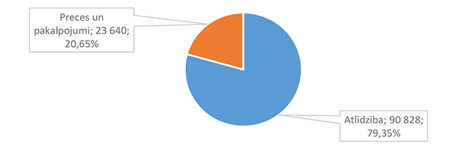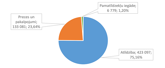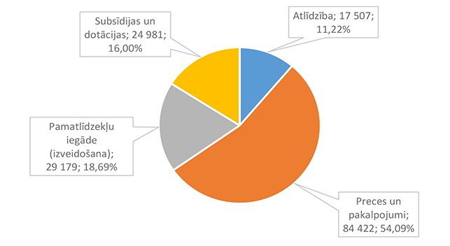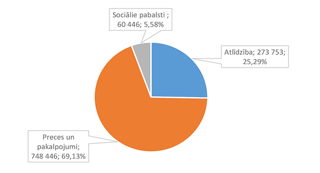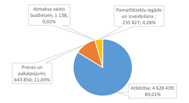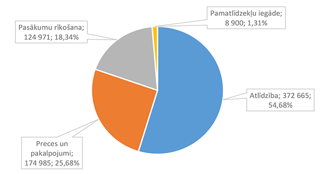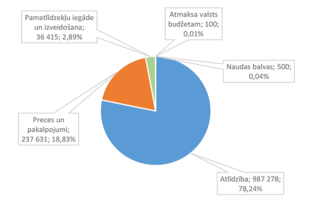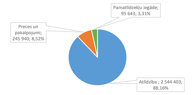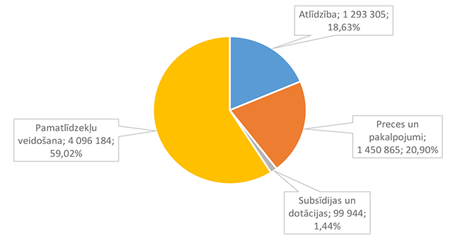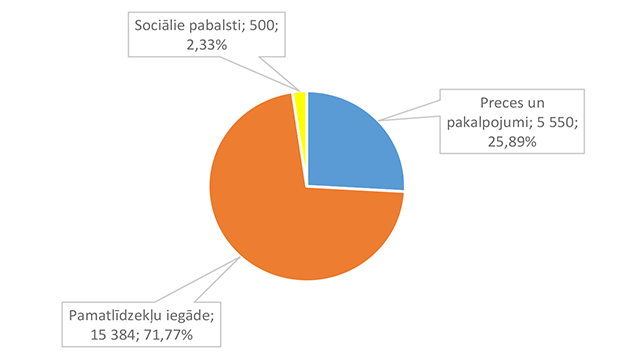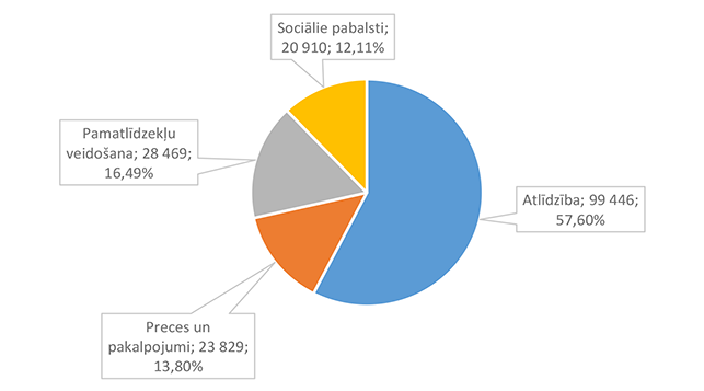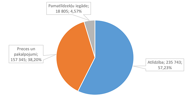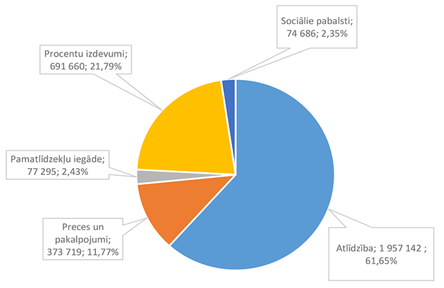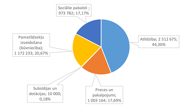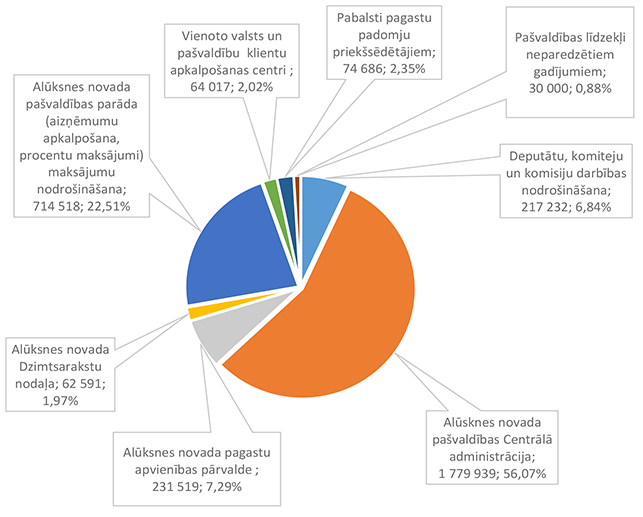 Lielāko izdevumu daļu sastāda izdevumi atlīdzībai – 16 586 312 EUR, kas ir 47,24 % no izdevumiem pēc ekonomiskās klasifikācijas kodiem. Otra lielāka izdevumu pozīcija ir pamatkapitāla veidošana – 8 901 459 EUR, kas ir 25,36 % no izdevumiem pēc ekonomiskās klasifikācijas kodiem un, galvenokārt, saistīta ar Eiropas Savienības fondu projektu īstenošanu. 1.2.1. Izpildvaras un likumdošanas institūcijas Funkcionālajā kategorijā "Izpildvaras un likumdošanas institūcijas" iekļauta Alūksnes novada pašvaldības domes deputātu, komiteju un komisiju, Alūksnes novada pašvaldības Centrālās administrācijas, Alūksnes novada pagastu apvienības pārvaldes, Alūksnes novada Dzimtsarakstu nodaļas, vienoto valsts un pašvaldību klientu apkalpošanas centru, Alūksnes novada pašvaldības parāda (aizņēmumu apkalpošana, procentu maksājumi) maksājumu un pabalstu pagastu padomju priekšsēdētājiem nodrošināšana, ka arī pašvaldības līdzekļi neparedzētiem gadījumiem. Funkcionālās kategorijas "Izpildvaras un likumdošanas institūcijas" 2026. gada finansējuma izdevumu nodrošināšanai struktūra pa institūcijām apkopota 1. attēlā. 1. attēls Izpildvaras un likumdošanas institūciju 2026. gada finansējuma struktūra (euro, %) Lielāko izdevumu daļu sastāda Alūksnes novada pašvaldības Centrālās administrācijas darbības nodrošināšana – 1 779 939 EUR, kas ir 56,07 % no funkcionālās kategorijas "Izpildvaras un likumdošanas institūcijas" plānotā finansējuma. Otra lielāka izdevumu pozīcija ir pašvaldības parāda maksājumu nodrošināšana (Valsts kases aizdevumu apkalpošana un procentu maksājumi) – 714 518 EUR, kas ir 22,51 % no funkcionālās kategorijas "Izpildvaras un likumdošanas institūcijas" plānotā finansējuma. Funkcionālās kategorijas "Izpildvaras un likumdošanas institūcijas" struktūra pa ekonomiskās klasifikācijas kodiem apkopota 2. attēlā. 2. attēls Izpildvaras un likumdošanas institūciju 2026. gada finansējuma sadalījums pa ekonomiskās klasifikācijas kodiem (euro, %) Lielāko izdevumu daļu sastāda izdevumi atlīdzības nodrošināšanai 1 957 142 EUR, kas ir 61,65 % no funkcionālajai kategorijai "Izpildvaras un likumdošanas institūcijas" plānotā finansējuma. Sociālajos pabalstos paredzēts finansējums bijušajiem pagastu padomju priekšsēdētājiem, lai nodrošinātu ikmēneša pabalstus kā starpību starp valstī noteiktajām divām minimālajām mēneša darba algām un piešķirto vecuma pensiju, pamatojoties uz Republikas pilsētas domes un novada domes deputāta statusa likumu. 1.2.2. Sabiedriskā kārtība un drošība Funkcionālajā kategorijā "Sabiedriskā kārtība un drošība" iekļauti Alūksnes novada Pašvaldības policija, atskurbtuves pakalpojuma nodrošināšana, pasākumi civilās aizsardzības nodrošināšanai, Alūksnes novada ugunsdrošības hidrantu uzturēšana, Eiropas Reģionālās attīstības fonda (turpmāk – ERAF) projekts "Objektu (patvertņu) pielāgošana un aprīkošana civilās aizsardzības mērķiem Alūksnē". Funkcionālās kategorijas "Sabiedriskā kārtība un drošība" 2026. gada finansējuma struktūra pa institūcijām apkopota 3. tabulā. 3. tabula Sabiedriskās kārtības un drošības 2026. gada finansējuma struktūra (euro, %)