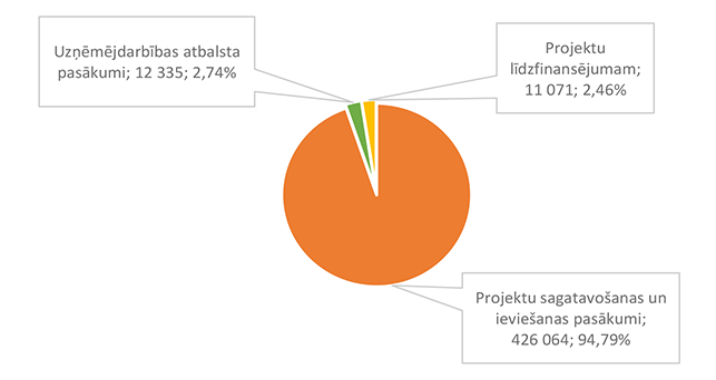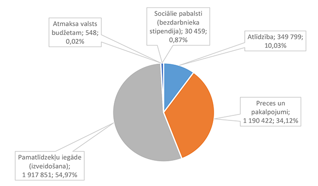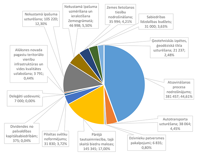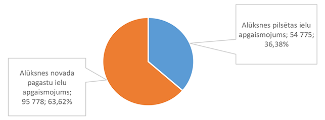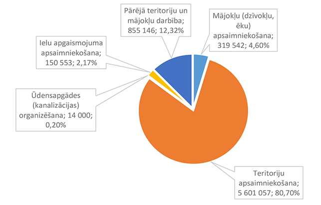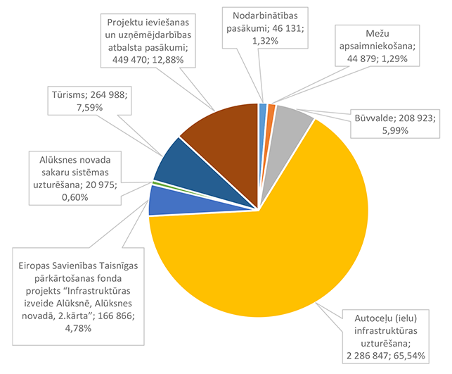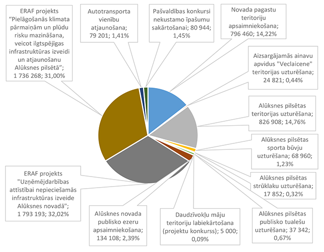 Funkcionālās kategorijas "Sabiedriskā kārtība un drošība" 2026. gada finansējuma struktūra pa ekonomiskās klasifikācijas kodiem apkopota 3. attēlā. 3. attēls Sabiedriskās kārtības un drošības institūciju 2026. gada finansējuma sadalījums pa ekonomiskās klasifikācijas kodiem (euro, %) Lielāko izdevumu daļu sastāda izdevumi pamatlīdzekļu iegādei 831 924 EUR, kas sastāda 84,21 % no funkcionālās kategorijas "Sabiedriskā kārtība un drošība" plānotā finansējuma (civilās aizsardzības pasākumu un Eiropas Savienības fonda projekta īstenošana). Alūksnes novada Pašvaldības policijai pamatlīdzekļu iegādes finansējums plānots 13 000 EUR apmērā, kas tiks izmantots pašvaldības darbinieku aizsarglīdzekļu iegādei. Civilās aizsardzības pasākumu nodrošināšanai novirzīts papildus piešķirtais valsts finansējums, pamatojoties uz likuma "Par valsts budžetu 2026. gadam un budžeta ietvaru 2026., 2027. un 2028. gadam" 35. panta pirmās daļas 3.punktu kā vienai no piecām Eiropas Savienības ārējās robežas pašvaldībām, ka arī 2025. gadā šim mērķim piešķirtais un neizmantotais finansējums. Atskurbināšanas autonomu funkciju Alūksnes novada pašvaldība nodrošina pakalpojuma līguma ietvaros. 1.2.3. Ekonomiskā darbība Funkcionālajā kategorijā "Ekonomiskā darbība" iekļauti nodarbinātības pasākumu nodrošināšana, mežu apsaimniekošana, būvniecības procesa kontrole Alūksnes novada teritorijā, Alūksnes novada pašvaldības autoceļu (ielu) infrastruktūras būvniecība un uzturēšana, Alūksnes novada pašvaldības sakaru sistēmas uzturēšana, tūrisms, projektu ieviešanas un uzņēmējdarbības atbalsta pasākumi, investīciju projekts "Alūksnes pilsētas tranzītielu seguma virskārtas atjaunošana" un Eiropas Savienības Taisnīgas pārkārtošanas fonda projekts "Infrastruktūras izveide Alūksnē, Alūksnes novadā, 2. kārta". 4. attēls Ekonomiskās darbības 2026. gada finansējuma struktūra (euro, %) Funkcionālajā kategorijā "Nodarbinātības pasākumi" paredzēts finansējums pasākumiem, kas tiek īstenoti sadarbībā ar Nodarbinātības valsts aģentūru, 46 131 EUR apmērā, tajā skaitā algotiem pagaidu sabiedriskiem darbiem 33 602 EUR apmērā un skolēnu nodarbinātības pasākumam vasarā 12 529 EUR apmērā. Funkcionālajā kategorijā "Mežu apsaimniekošana" paredzēts finansējums Alūksnes novada pašvaldībai piederošo mežu apsaimniekošanai, jaunstādu kopšanai un meža zemju taksācijai (pašvaldības iestāde "SPODRA"). Būvniecības procesa kontroli Alūksnes novada teritorijā veic pašvaldības iestāde "Būvvalde", 2026. gadā turpinās darbs pie jauna teritorijas plānojuma izstrādes. Funkcionālajā kategorijā "Autoceļu (ielu) infrastruktūras uzturēšana" paredzēts finansējums ceļu un/vai ielu būvdarbu projektēšanai, būvdarbu veikšanai un autoceļu (ielu) uzturēšanai no valsts budžeta dotācijas un pašvaldības finansējuma šādiem mērķiem un šādā apmērā: 1. Alūksnes pilsētas satiksmes drošības pasākumiem 239 374 EUR apmērā; 2. Alūksnes novada pagastu apvienības pārvaldes ceļu uzturēšanai (no pašvaldības finansējuma) 45 487 EUR apmērā; 3. Alūksnes novada pašvaldības autoceļu (ielu) uzturēšanai no valsts budžeta finansējuma 951 841 EUR apmērā; 4. Satiksmes ministrijas finansējums un pašvaldības līdzfinansējums Alūksnes pilsētas tranzītielu virskārtas seguma atjaunošanai 963 587 EUR apmērā; 5. Pašvaldības īpašumā pārņemto valsts vietējo autoceļu posmu uzturēšanai 86 558 EUR apmērā. Funkcionālajā kategorijā "Alūksnes novada sakaru sistēmas uzturēšana" paredzēts finansējums Alūksnes novada pašvaldības iestāžu centrālās sakaru sistēmas uzturēšanai, datu uzglabāšanai (serveris) un pārraidīšanas nodrošināšanai (interneta pieslēgums). Funkcionālajā kategorijā "Tūrisms" paredzēts finansējums Alūksnes Tūrisma informācijas centra darbības nodrošināšanai. Funkcionālajā kategorijā "Projektu ieviešanas un uzņēmējdarbības atbalsta pasākumi" paredzēts finansējums investīciju projektu sagatavošanas un ieviešanas pasākumu nodrošināšanai un dažādu fondu projektu līdzfinansējumam (nesadalīts konkrētiem projektiem). 5. attēls Projektu ieviešanas un uzņēmējdarbības atbalsta pasākumu 2026. gada finansējuma struktūra (euro, %) Funkcionālās kategorijas "Ekonomiskā darbība" 2026. gada finansējuma struktūra pa ekonomiskās klasifikācijas kodiem apkopota 6. attēlā. 6. attēls Ekonomiskās darbības 2025. gada finansējuma sadalījums pa ekonomiskās klasifikācijas kodiem (euro, %) Lielāko izdevumu daļu sastāda izdevumi pamatlīdzekļu iegādei (būvprojektu izstrāde, projektu īstenošana un objektu būvuzraudzība) 1 917 851 EUR, kas ir 54,97 % no funkcionālās kategorijas "Ekonomiskā darbība" plānotā finansējuma, otrajā vietā ir izdevumi precēm un pakalpojumiem 1 190 422 EUR, kas ir 34,12 % no funkcionālās kategorijas "Ekonomiskā darbība" plānotā finansējuma. Sociālajos pabalstos paredzēts finansējums bezdarbnieku nodarbinātībai algotos pagaidu sabiedriskajos darbos. 1.2.4. Vides aizsardzība Funkcionālajā kategorijā "Vides aizsardzība" paredzēts finansējums bioloģiskās daudzveidības un ainavas aizsardzībai 156 089 EUR apmērā, tajā skaitā: 1. Lietus ūdens attīrīšanas izdevumu kompensācijai (dotācija SIA "RŪPE") 24 981 EUR apmērā, 2. Dabas resursu nodokļa ietvaros paredzēto pasākumu īstenošanai 109 661 EUR apmērā, 3. Zaļo un dārza atkritumu kompostēšanas laukuma Alūksnes novadā uzturēšanai 20 647 EUR apmērā, 4. Tabakas izstrādājumu ar filtru (TIF) apsaimniekošana 800 EUR apmērā. Funkcionālās kategorijas "Vides aizsardzība" 2026. gada finansējuma struktūra pa ekonomiskās klasifikācijas kodiem apkopota 7. attēlā. 7. attēls Vides aizsardzības 2026. gada fi