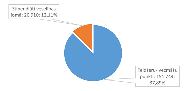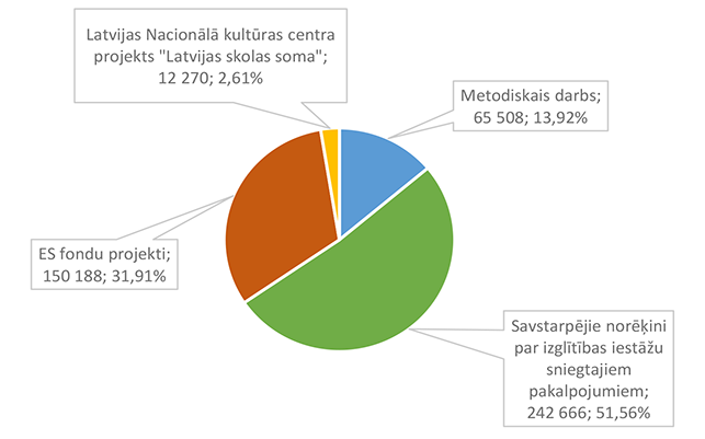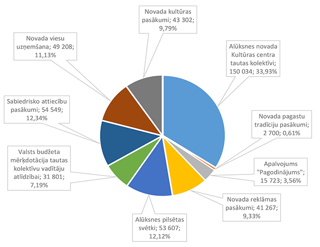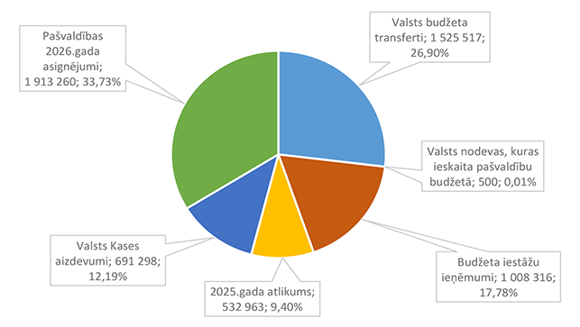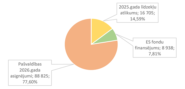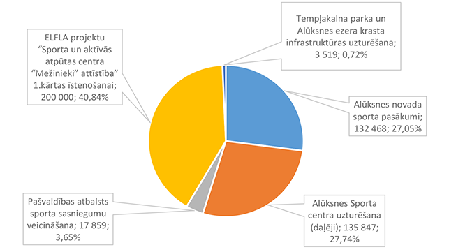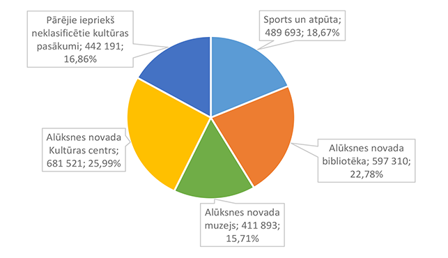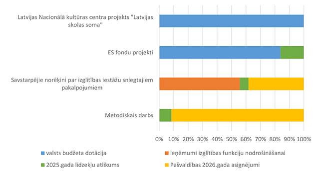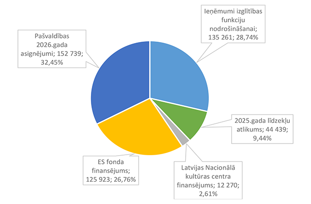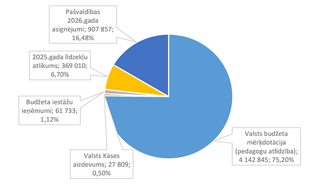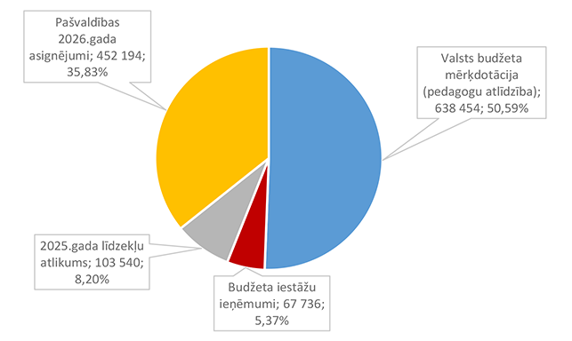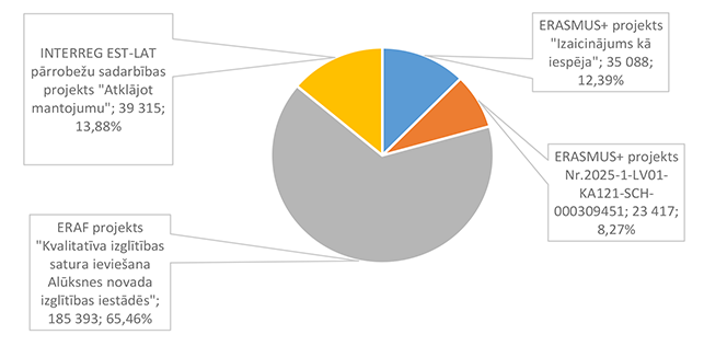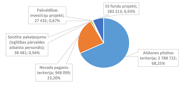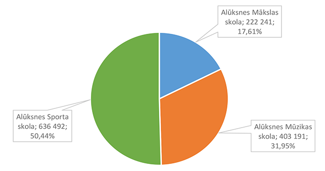 Pamata un vispārējo izglītību Alūksnes novadā nodrošina viena Alūksnes pilsētas izglītības iestāde un divas Alūksnes novada pagastu izglītības iestādes. 27. attēls Pamata un vispārējās izglītības 2026. gada finansējuma struktūra pa teritorijām (euro, %, bez finansējuma prognozes) Pamata un vispārējās izglītības izdevumi tiek segti no valsts mērķdotācijas līdzekļiem (pedagogu atlīdzība), pašvaldības 2026. gada asignējumiem, budžeta iestāžu ieņēmumiem (telpu nomas u.c.), iestāžu 2025. gada līdzekļu atlikuma un Valsts kases aizdevuma. 28. attēls Pamata un vispārējās izglītības 2026. gada finansēšanas avotu struktūra (euro, %) Lielākais īpatsvars pamata un vispārējās izglītības finansēšanas avotos ir valsts mērķdotācijai 4 142 845 EUR, kas ir 75,20 % no pamata un vispārējās izglītības 2026. gada finansējuma kopsummas. Otrais pēc īpatsvara ir pašvaldības 2026. gada finansējums 907 857 EUR, kas ir 16,48 % no pamata un vispārējās izglītības 2026. gada finansējuma kopsummas. 29. attēls Pamata un vispārējās izglītības ES fondu izdevumu struktūra pa projektiem (euro, %) 2026. gadā Alūksnes novada pašvaldība turpina īstenot ERASMUS + un INTERREG EST-LAT programmas projektus, ka arī uzsāks īstenot ERAF projektu "Kvalitatīva izglītības satura ieviešana Alūksnes novada izglītības iestādēs" (Ernsta Glika Alūksnes Valsts ģimnāzijas dabaszinātņu kabineta ierīkošana). 30. attēls Pamata un vispārējās izglītības finansējuma struktūra pa ekonomiskās klasifikācijas kodiem (euro, %) Lielākais īpatsvars pamata un vispārējās izglītības izdevumos ir atlīdzības nodrošināšanai 4 628 439 EUR, kas ir 84,01 % no pamata un vispārējās izglītības 2026. gada plānotā finansējuma, otrais pēc īpatsvara izdevumu veids ir preču iegādei un pakalpojumu nodrošināšanai 643 850 EUR, kas ir 11,69 % no pamata un vispārējās izglītības 2026. gada plānotā finansējuma. 1.2.8.3. Profesionālās ievirzes izglītība Funkcionālajā kategorijā "Profesionālās ievirzes izglītība" paredzēts finansējums Alūksnes Mākslas skolas, Alūksnes Mūzikas skolas, Alūksnes Sporta skolas uzturēšanai. 31. attēls Profesionālās ievirzes izglītības 2026. gada finansējuma struktūra pa iestādēm un pasākumiem (euro, %, ar finansējuma prognozi) Lielākais īpatsvars ir finansējumam Alūksnes Sporta skolas uzturēšanai 636 492 EUR, kas ir 50,44 % no profesionālās ievirzes izglītībai 2026. gada plānotā finansējuma. Otrā vietā pēc īpatsvara ir Alūksnes Mūzikas skolas uzturēšana 403 191 EUR, kas ir 31,95 % no profesionālās ievirzes izglītībai 2026. gada plānotā finansējuma. 32. attēls Profesionālās ievirzes izglītības 2026. gada finansējuma struktūra pa finansēšanas avotiem (euro, %) Lielākais īpatsvars ir valsts budžeta mērķdotācijai 638 454 EUR apmērā, kas ir 50,59 % no profesionālās ievirzes izglītībai 2026. gada plānotā finansējuma. Otrais pēc īpatsvara ir pašvaldības finansējums 452 194 EUR, kas ir 35,83 % no profesionālās ievirzes izglītībai 2026. gada plānotā finansējuma. 31. attēls Profesionālās ievirzes izglītības 2026. gada finansējuma sadalījums pa ekonomiskās klasifikācijas kodiem (euro, %) Lielākais īpatsvars profesionālās ievirzes izglītības izdevumos ir atlīdzībai 987 278 EUR, kas ir 78,24 % no profesionālās ievirzes izglītības 2026. gada plānotā finansējuma. Ekonomiskās klasifikācijas kodā "Atmaksa valsts budžetam" paredzēta 2025. gadā neizlietotā finansējuma sporta profesionālās ievirzes pedagogu darba samaksai atmaksa valstij, saskaņā ar noslēgto līgumu. 1.2.8.4. Interešu izglītība Funkcionālajā kategorijā "Interešu izglītība" paredzēts finansējums profesionālās ievirzes izglītības iestādēm interešu stundu nodrošinājumam, jaunatnes darba nodrošinājumam Alūksnes novadā un Alūksnes bērnu un jauniešu centra uzturēšanai, metodiskā darba nodrošināšanai interešu izglītības jomā un Eiropas savienības fondu projektu īstenošanai. 7. tabula Interešu izglītības 2026. gada finansējuma struktūra (euro, %)