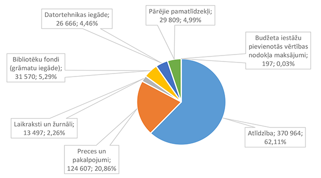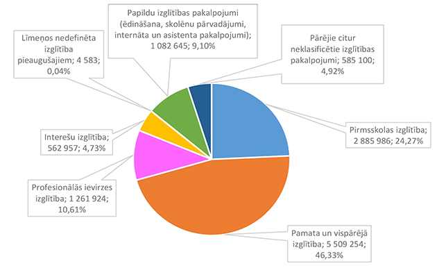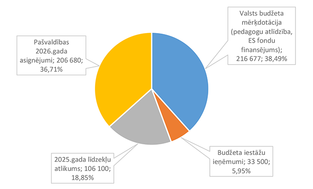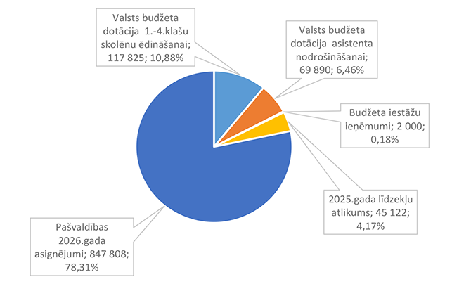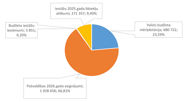 Pirmsskolas izglītību Alūksnes novadā uz 2026. gada sākumu nodrošina četras pirmsskolas izglītības iestādes un trīs pamata un vispārējas izglītības iestādes. 24. attēls Pirmsskolas izglītības 2026. gada finansējuma struktūra pa teritorijām (euro, %, bez finansējuma prognozes) Pirmsskolas izglītības izdevumi tiek segti no valsts mērķdotācijas līdzekļiem (pedagogu, kuri nodarbināti bērnu no piecu gadu vecumā apmācībā un bērnu speciālās izglītības programmu apmācībā, atlīdzība), pašvaldības 2026. gada asignējumiem, budžeta iestāžu ieņēmumiem (telpu noma) un iestāžu 2025. gada līdzekļu atlikuma. 25. attēls Pirmsskolas izglītības 2026. gada finansēšanas avotu struktūra (euro, %) Lielākais īpatsvars pirmsskolas izglītības finansēšanas avotos ir Alūksnes novada pašvaldības asignējumiem 1 928 056 EUR, kas ir 66,81 % no pirmsskolas izglītības 2026. gada finansējuma kopsummas. 26. attēls Pirmsskolas izglītības 2026. gada finansēšanas struktūra pa ekonomiskās klasifikācijas kodiem (euro, %) Lielākais īpatsvars pirmsskolas izglītības izdevumos ir atlīdzības nodrošināšanai 2 544 403 EUR, kas ir 88,16 % no pirmsskolas izglītības 2026. gada plānotā finansējuma. 1.2.8.2. Pamata un vispārējā izglītība Funkcionālajā kategorijā "Pamata un vispārējā izglītība" paredzēts finansējums pamatskolu un ģimnāzijas uzturēšanai bez finansējuma ēdināšanas pakalpojuma nodrošināšanai, dienesta viesnīcas pakalpojuma nodrošināšanai, skolēnu pārvadājumiem un asistenta pakalpojumiem. Funkcionālajā kategorijā paredzēts finansējums pašvaldības un Eiropas Savienības fondu investīciju projektu īstenošanai izglītības jomā. 6. tabula Pamata un vispārējās izglītības 2026. gada finansējuma struktūra (euro, %)