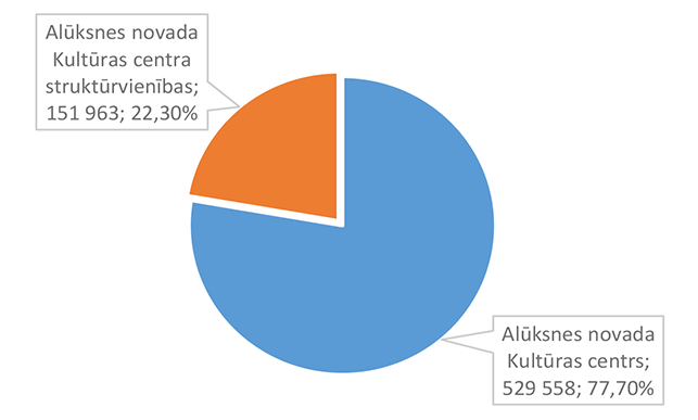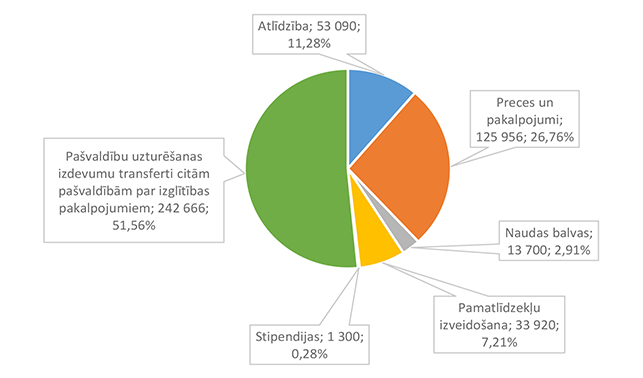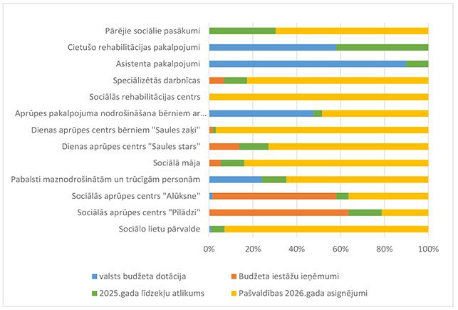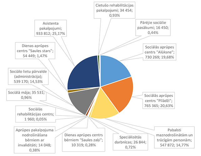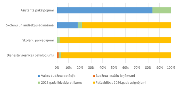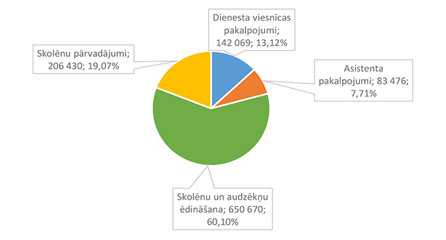 Vislielākais pēc īpatsvara finansējums piešķirts Alūksnes Bērnu un jauniešu centram, kas īsteno lielāku daļu interešu programmu Alūksnes pilsētā un novadā, 2026. gadā īstenos sešus Eiropas Savienības fondu projektus un organizēs nometni Ukrainas nepilngadīgajiem civiliedzīvotājiem. 32. attēls Interešu izglītības 2026. gada finansējuma struktūra pa finansēšanas avotiem (euro, %) Lielākais īpatsvars ir valsts budžeta finansējumam 216 677 EUR, kas ir 38,49 % no interešu izglītībai 2026. gadā plānotā finansējuma. Mācību stundu sadali pa izglītības iestādēm un interešu izglītības programmām veic Alūksnes Bērnu un jauniešu centra izveidotā komisija. No valsts budžeta mērķdotācijas tiek apmaksātas 357,28 mācību stundas nedēļā. No pašvaldības 2026. gada asignējumiem tiek apmaksātas 100,4 mācību stundas nedēļā interešu programmās "Vides izglītība "Mazpulki"", "Sports" un "Pūtēju orķestris". Alūksnes bērnu un jauniešu centram deleģēts uzdevums koordinēt jaunatnes darbu visā novada teritorijā un interešu izglītības metodisko nodrošinājumu. 33. attēls Interešu izglītības 2026. gada finansējuma struktūra pa ekonomiskās klasifikācijas kodiem (euro, %) Lielākais īpatsvars interešu izglītības izdevumos ir atlīdzības nodrošināšanai 423 097 EUR, kas ir 75,16 % no interešu izglītības 2026. gada plānotā finansējuma. 1.2.8.5. Līmeņos nedefinēta izglītība pieaugušajiem Funkcionālajā kategorijā "Līmeņos nedefinēta izglītība pieaugušajiem" paredzēts finansējums: 1. Atveseļošanas fonda projekta "Sabiedrības digitālo prasmju attīstība" īstenošanai 4 083 EUR apmērā, 2. Eiropas Sociālā fonda Plus projekta "Atbalsts pieaugušo individuālajās vajadzībās balstītai pieaugušo izglītībai" īstenošanai 500 EUR apmērā. Projektu īstenošanu vada Alūksnes novada Izglītības pārvalde. 1.2.8.6. Papildu izglītības pakalpojumi Funkcionālajā kategorijā "Papildu izglītības pakalpojumi" paredzēts finansējums izglītības iestādes dienesta viesnīcas nodrošinājumam, skolēnu ēdināšanas pakalpojumam, skolēnu pārvadājumiem, asistenta pakalpojumiem bērniem, kuriem ir funkcionālie traucējumi. 34. attēls Papildu izglītības pakalpojumu 2026. gada finansējuma struktūra pa finansēšanas avotiem (euro, %) Lielākais īpatsvars ir pašvaldības finansējumam 647 808 EUR, kas ir 78,31 % no papildu izglītības pakalpojumiem 2026. gadam plānotā finansējuma. 35. attēls Papildu izglītības pakalpojumu 2026. gada finansējuma sadalījums pa pakalpojuma veidiem (euro, %) Lielākais īpatsvars ir skolēnu ēdināšanas pakalpojumam 650 670 EUR, kas ir 60,10 % no papildu izglītības pakalpojumiem 2026. gadam plānotā finansējuma. 36. attēls Papildu izglītības pakalpojumu 2026. gada finansējuma sadalījums pa finansēšanas avotiem un pakalpojuma veidiem (%) Skolēnu pārvadājumi tiek sniegti saskaņā ar Alūksnes novada pašvaldības domes 27.04.2023. saistošajiem noteikumiem Nr. 10/2023 "Par izglītojamo pārvadājumiem, braukšanas maksas atvieglojumiem un izdevumu kompensācijas kārtību Alūksnes novadā". Skolēnu un audzēkņu ēdināšanas pakalpojums lielākajā daļā tiek segts no pašvaldības 2026. gada asignējumiem. Ēdināšanas pakalpojumu atvieglojumus piešķir saskaņā ar Alūksnes novada pašvaldības domes 19.06.2025. saistošajiem noteikumiem Nr. 13/2025 "Par ēdināšanas pakalpojuma maksas atvieglojumiem Alūksnes novada pašvaldības izglītības iestādēs". Audzēkņiem un skolēniem, kuri apgūst speciālās izglītības programmas, piemēro atvieglojumu 100 % no ēdināšanas pakalpojuma maksas. Ēdināšanas pakalpojumu visās pirmsskolas izglītības iestādēs, pamata un vispārējās vidējās izglītības iestādēs sniedz SIA "BALTIC RESTAURANTS CATERING". Asistenta pakalpojumu personām, kurām ir veselības funkcionālie traucējumi, nodrošina no valsts budžeta dotācijas līdzekļiem. 2025. gada līdzekļu atlikums arī ir valsts budžeta dotācijas līdzekļi. Dienesta viesnīcas pakalpojumus Alūksnes novadā sniedz Ernsta Glika Alūksnes Valsts ģimnāzija Alūksnes novada izglītības iestāžu izglītojamajiem bezmaksas. Budžeta ieņēmumi 2 000 EUR apmērā plānoti Ernsta Glika Alūksnes Valsts ģimnāzijas dienesta viesnīcā kā ieņēmumi par nometņu, sporta sacensību dalībnieku nakšņošanu un Ukrainas civiliedzīvotāju īslaicīgu izmitināšanu. 37. attēls Papildu izglītības pakalpojumu 2026. gada izdevumu sadalījums pa ekonomiskās klasifikācijas kodiem (euro, %) Lielākais īpatsvars ir preču iegādei un pakalpojumu nodrošināšanai 748 446 EUR, kas ir 69,13 % no papildu izglītības pakalpojumu 2026. gadam plānotā finansējuma. Izdevumu pozīcijā "Sociālie pabalsti" iekļauti izdevumi par sabiedriskā (vietējās reģionālās nozīmes maršrutos un/vai starppilsētu maršrutos) transporta pakalpojumiem un kompensācijas vecākiem par izglītojamo nogādāšanu ar personīgo autotransportu līdz tuvākai sabiedriskā transporta pieturai vai izglītības iestādei saistošajos noteikumos noteiktajos gadījumos. 1.2.8.7. Izglītības pārvalde Funkcionālajā kategorijā "Izglītības pārvalde" piešķirts finansējums pašvaldības iestādes "Izglītības pārvalde" darba nodrošinājumam, kas veic Alūksnes novada pašvaldības vispārizglītojošo izglītības iestāžu metodisko un visu izglītības iestāžu kontrolējošo funkciju, un Eiropas Sociālā fonda Plus projekta "Skola – kopiena" īstenošanai. 38. attēls Izglītības pārvaldes 2026. gada finansējuma avotu struktūra (euro, %) Lielākais īpatsvars ir pašvaldības 2026. gada asignējumiem 88 825 EUR, kas ir 77,60 % no Izglītības pārvaldei 2026. gada plānotā finansējuma. 39. attēls Izglītības pārvaldes 2026. gada finansējuma sadalījums pa ekonomiskās klasifikācijas kodiem (euro, %) Lielāka