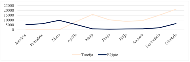 51 KP, izvērtējot Atpūtas ceļojumu tirgus dalībnieku (SIA "NOVATOURS", SIA BALTIC WORLD, SIA "TEZ TOUR", CORAL TRAVEL Latvia SIA un Sabiedrība ar ierobežotu atbildību "Join Up Baltic" (turpmāk - SIA "Join Up Baltic")) apkalpoto tūristu skaitu uz tādiem Atpūtas ceļojumu galamērķiem kā Turcija un Ēģipte 2024. un 2025. gadā, atsevišķi izdalot katru kalendārā gada mēnesi, secina, ka tūristu pieprasījums pēc ceļojumiem uz Turciju un Ēģipti būtiski atšķiras atkarībā no kalendārā gada mēneša (skat. tālāk tekstā attēlu Nr. 1 un Nr. 2). Attiecīgi patērētāju pieprasījuma pieaugums Atpūtas ceļojumam uz Turciju vērojams pavasara un vasaras mēnešos, savukārt uz Ēģipti pieprasījuma pieaugums ir vērojams rudens un ziemas mēnešos, kas norāda, ka Turcijas un Ēģiptes galamērķi nav uzskatāmi par savstarpēji aizvietojamiem galamērķiem konkrētos kalendārā gada mēnešos.