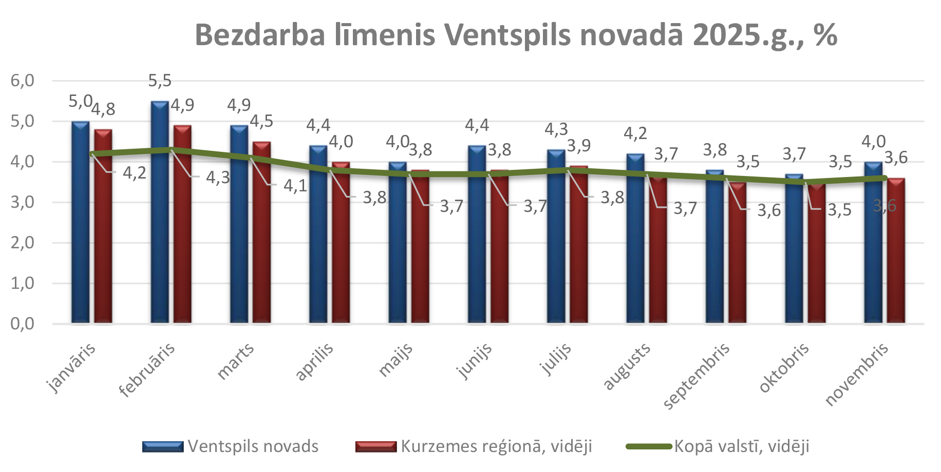 2025. gada novembrī bezdarba līmenis Ventspils novadā ir palielinājies uz 4,0 % salīdzinājumā ar 2024. gada novembri, kad bezdarba līmenis bija zemāks, t.i. 3,8 %. Vērtējot kopumā Kurzemē 2025. gada novembrī bezdarba līmenis bija zemāks, kā Ventspils novadā. 2025. gada vienpadsmit mēnešu griezumā bezdarba līmenis Ventspils novadā ir bijis svārstīgs ar lejupejošu tendenci. (skat. 4. attēlu), kas skaidrojams ar darba tirgus stabilizēšanos. Salīdzinot ar valstī vidējo un Kurzemes reģiona bezdarba līmeni, to var vērtēt kā līdzvērtīgu.
