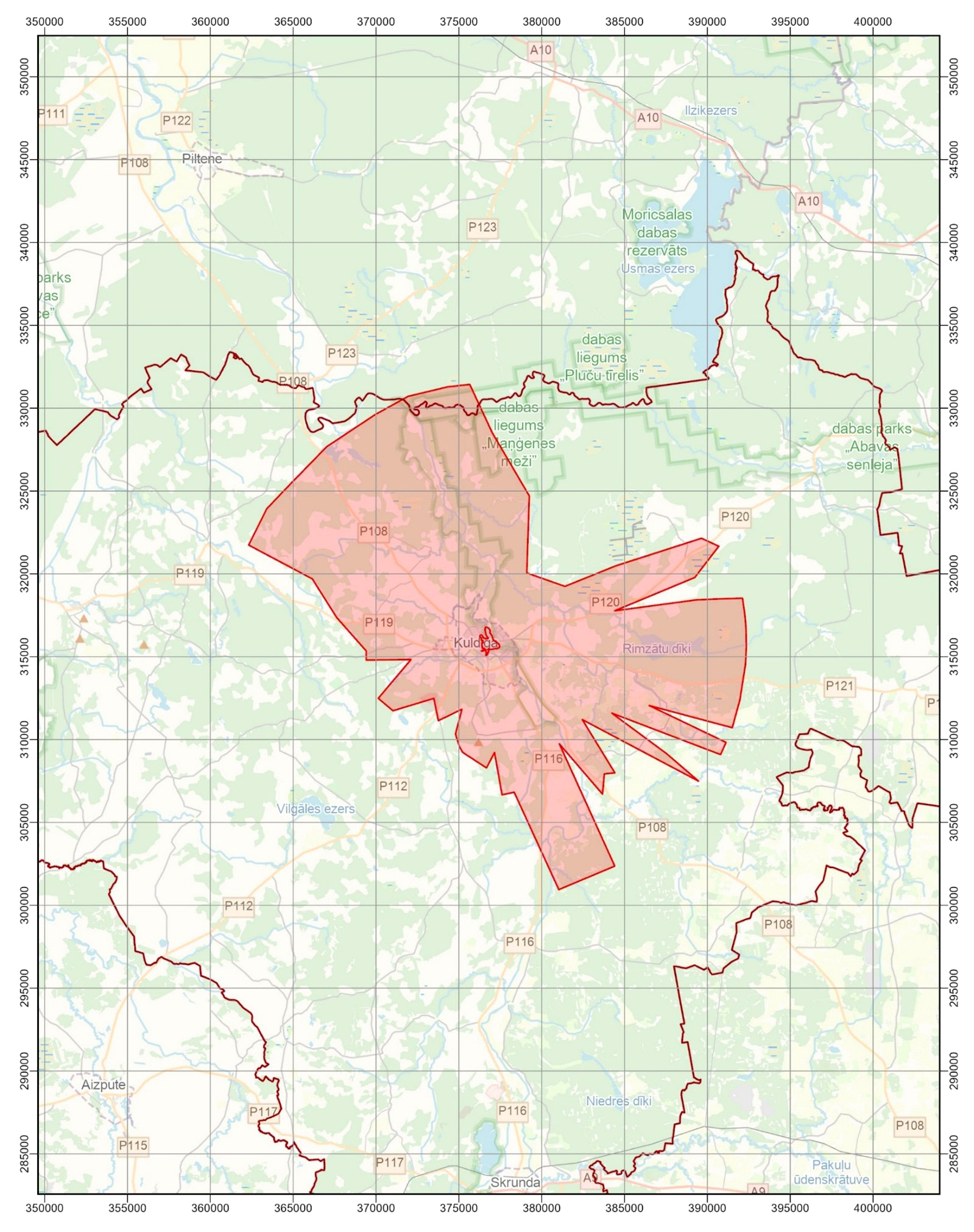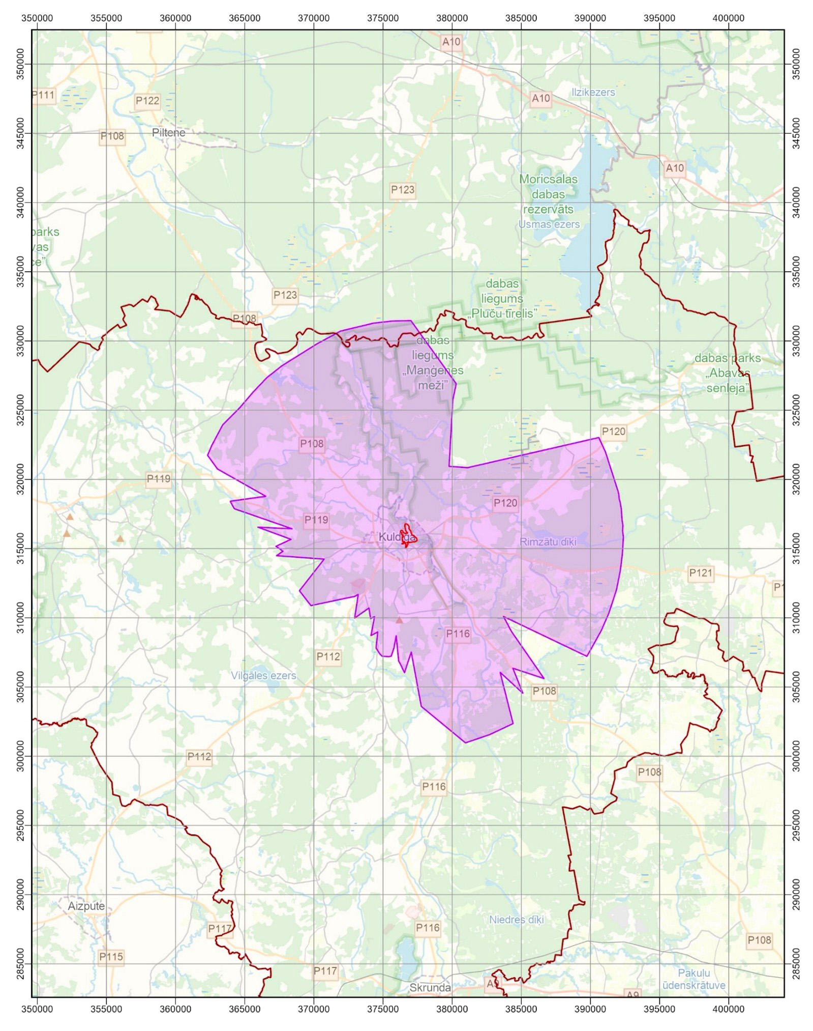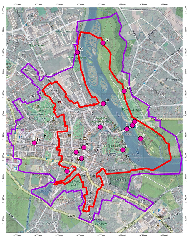 aizsardzības likuma Pasaules mantojuma vietas - Kuldīgas vecpilsētas - un tās aizsardzības zonas karte, šajā zonā esošie skatu punkti un to koordinātas