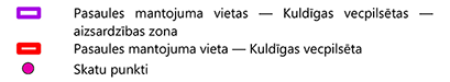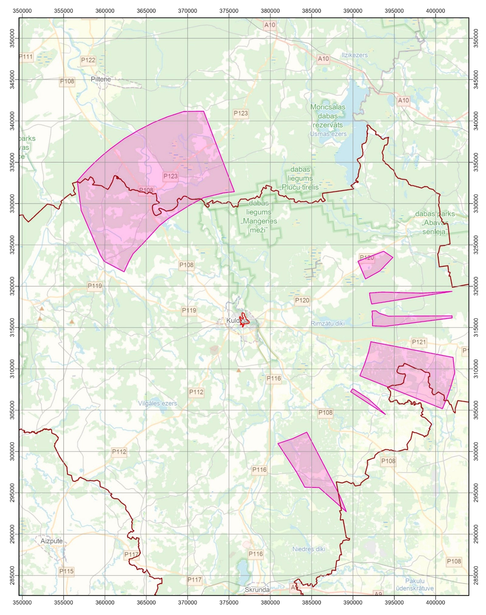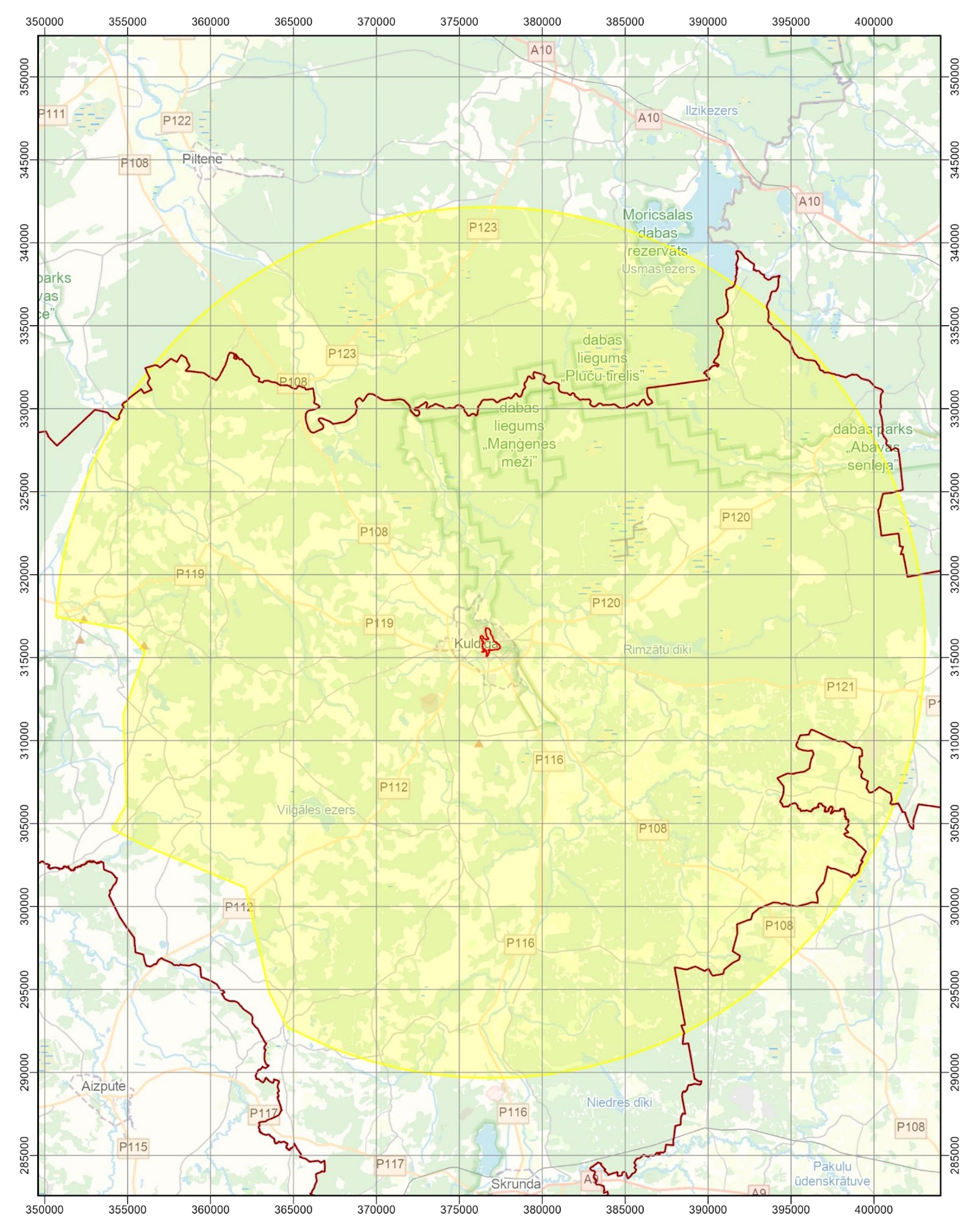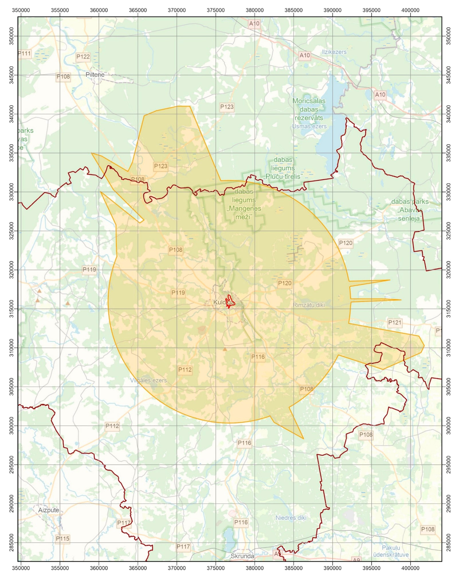 aizsardzības likuma Pasaules mantojuma vietas - Kuldīgas vecpilsētas - un tās aizsardzības zonas karte, šajā zonā esošie skatu punkti un to koordinātas