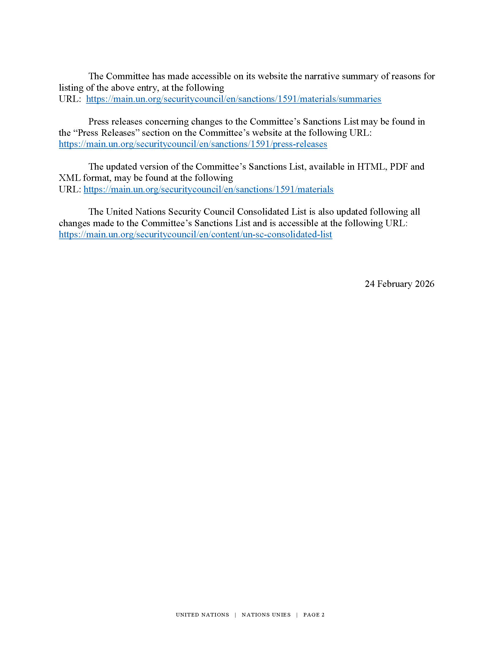 Ārlietu ministrijas informācija Rīgā 2026. gada 26. februārī Par ANO sankcijāmĀrlietu ministrija saskaņā ar Starptautisko un Latvijas Republikas nacionālo sankciju likuma 11. panta pirmo prim daļu publicē oficiālajā izdevumā "Latvijas Vēstnesis" informāciju par Apvienoto Nāciju Organizācijas (turpmāk - ANO) Drošības padomes rezolūcijas grozījumiem. 2026. gada 24. februārī ANO Drošības padome saskaņā ar rezolūciju Nr. 1591 (2005) noteica sankcijas pret četriem Sudānas pilsoņiem. Lūgums skatīt ANO notu un skaidrojošo informāciju pielikumā. Personas, kurām noteiktas sankcijas: SDi.007 Vārds: 1: GEDO 2: HAMDAN 3: AHMED; Amats: Commander for the North Darfur section of the Rapid Support Forces; Pazīstams arī kā (augsta ticamība): Abu Nashuk; Valstspiederība: Sudāna; Pievienots sankciju sarakstam: 2026. gada 24. februārī; Dzimums: Vīrietis. SDi.008 Vārds: 1: ABDUL 2: RAHIM 3: HAMDAN 4: DAGALO; Amats: Rapid Support Forces (RSF) Deputy Leader; Dzimšanas datums: 1972. gada 1. janvāris; Dzimšanas vieta: Kartuma, Sudāna; Valstspiederība: Sudāna; Pievienots sankciju sarakstam: 2026. gada 24. februārī; Dzimums: Vīrietis. SDi.009 Vārds: 1: AL-FATEH 2: ABDULLAH 3: IDRIS; Amats: Brigadier General of Rapid Support Forces; Pazīstams arī kā (augsta ticamība): Abu Lulu; Valstspiederība: Sudāna; Pievienots sankciju sarakstam: 2026. gada 24. februārī; Dzimums: Vīrietis. SDi.010 Vārds: 1: TIJANI 2: IBRAHIM 3: MOUSSA 4: MOHAMED; Amats: Field Commander of the Rapid Support Forces; Pazīstams arī kā (augsta ticamība): Al Zeir Salem; Valstspiederība: Sudāna; Pievienots sankciju sarakstam: 2026. gada 24. februārī; Dzimums: Vīrietis. Ārlietu ministrijas |