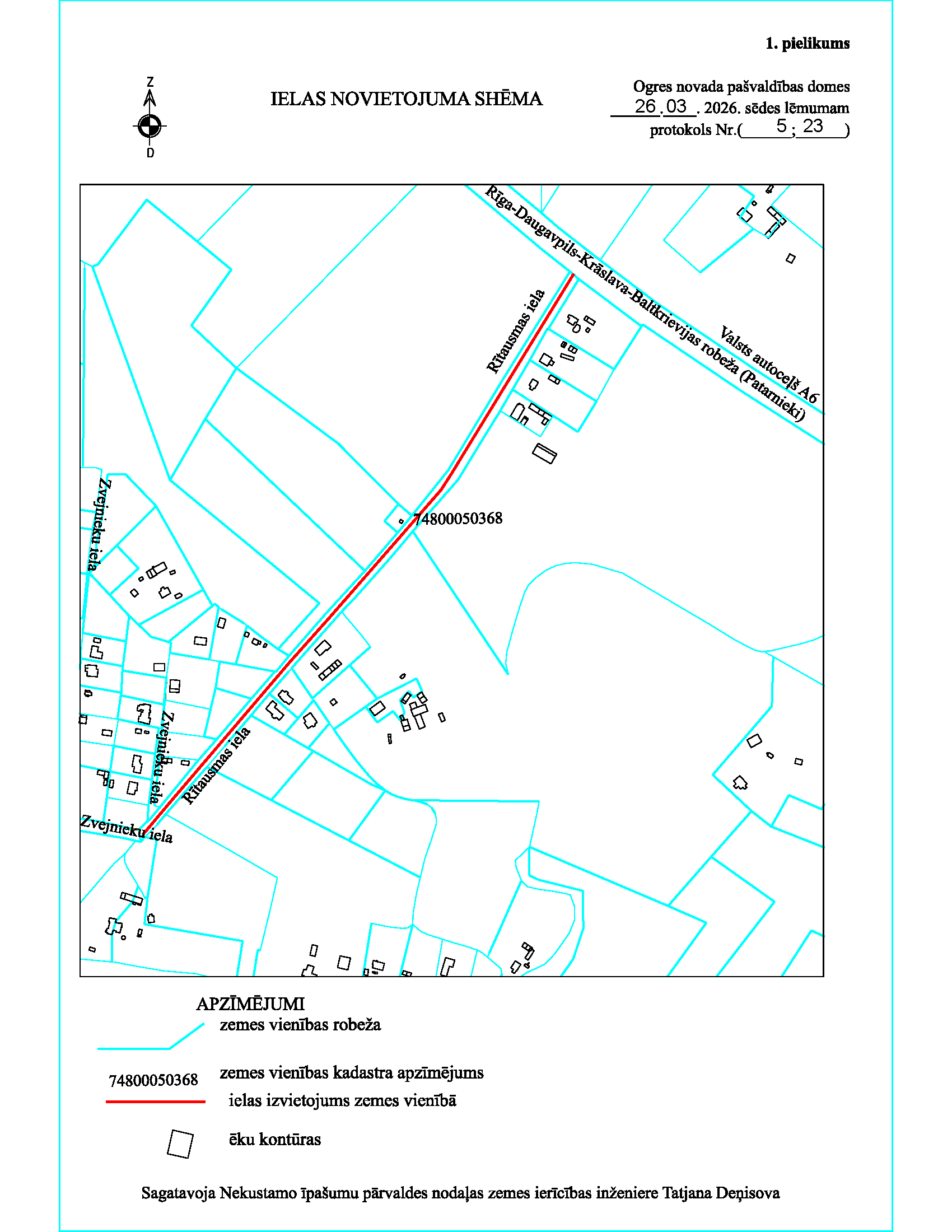 Ogres novada pašvaldības domes lēmums Ogrē 2026. gada 26. martā (prot. Nr. 5, 23.) Par pašvaldības ielas nosaukuma maiņuAr Ogres novada pašvaldības domes 2022. gada 28. aprīļa lēmumu "Par pašvaldības ielas nosaukuma maiņu" (protokols Nr. 9; 44.) un Ogres novada pašvaldības domes 2022. gada 26. maija lēmumu "Par grozījumiem Ogres novada pašvaldības domes 2022. gada 28. aprīļa lēmumā "Par pašvaldības ielas nosaukuma maiņu" (protokols Nr. 9; 44.)" (protokols Nr. 11; 26.) tika nolemts mainīt Ogres novada Ogresgala pagasta Ciemupes ciemā Pionieru ielas, zemes vienības kadastra apzīmējums 7480 005 0368, nosaukumu, piešķirot ielai nosaukumu Celmlaužu iela (turpmāk - Lēmums). Pirms Lēmuma pieņemšanas: 1) Valsts zemes dienesta (turpmāk - VZD) Valsts adrešu reģistra informācijas sistēmā bija reģistrēta iela: Pionieru iela, Ciemupe, Ogresgala pag, Ogres nov., tai piešķirts ARIS kods 100377943 (turpmāk - Pionieru iela); 2) Pionieru iela atradās uz Ogres novada pašvaldībai (turpmāk - Pašvaldība) piekritīgā nekustamā īpašuma "Pionieru iela", Ogresgala pagasts, Ogres novads, kadastra numurs 7480 005 0930, sastāvā esošās zemes vienības (kadastra apzīmējums 7480 005 0368) ~1,05 ha platībā (turpmāk - Zemes vienība); 3) Zemes vienībai nebija veikta kadastrālā uzmērīšana, tā piekrita Pašvaldībai un ierakstāma zemesgrāmatā uz Pašvaldības vārda, pamatojoties uz Pašvaldības domes 2010. gada 15. jūlija lēmumu "Par īpašuma tiesību atzīšanu Ogres novada pašvaldībai uz zemi zem ielām Ogres novada, Ogresgala pagasta, Ogresgala un Ciemupes ciemos" (protokols Nr. 8; 36. §), kas grozīts ar Pašvaldības domes 2015. gada 18. jūnija lēmumu "Par grozījumiem Ogres novada pašvaldības 15.07.2010. lēmumā "Par īpašuma tiesību atzīšanu Ogres novada pašvaldībai uz zemi zem ielām Ogres novada, Ogresgala pagasta, Ogresgala un Ciemupes ciemos" (protokols Nr. 8, 36. §)" (protokols Nr. 9; 21. §); 4) saskaņā ar Pašvaldības 2012. gada 21. jūnija saistošo noteikumu Nr. 16/2012 "Ogres novada teritorijas izmantošanas un apbūves noteikumi" 7. pielikumu "Ogres novada teritorijas atļautās un plānotās izmantošanas kartes" Zemes vienība zem Pionieru ielas atradās funkcionālajā zonā - satiksmes infrastruktūras teritorija (S); 5) atbilstoši Ministru kabineta 2006. gada 20. jūnija noteikumiem Nr. 496 "Nekustamā īpašuma lietošanas mērķu klasifikācija un nekustamā īpašuma lietošanas mērķu noteikšanas un maiņas kārtība" Zemes vienībai noteiktais lietošanas mērķis bija "Zeme dzelzceļa infrastruktūras zemes nodalījuma joslā un ceļu zemes nodalījuma joslā" (1101) - 10500 m2; 6) Pionieru iela sākās pie Daugavpils šosejas un beidzās pagriezienā, kur sākas Zvejnieku iela Ogres novada Ogresgala pagasta Ciemupes ciemā. Pēc Lēmuma pieņemšanas: 7) VZD Valsts adrešu reģistra informācijas sistēmā Pionieru ielas vietā reģistrēta iela: Celmlaužu iela, Ciemupe, Ogresgala pag, Ogres nov., tai piešķirts ARIS kods 100377943 (turpmāk - Celmlaužu iela); 8) VZD Nekustamā īpašuma valsts kadastra informācijas sistēmā reģistrēts nekustamais īpašums "Celmlaužu iela", Ogresgala pagasts, Ogres novads, kadastra numurs 7480 005 0930, kas sastāv no zemes vienības bez adreses, ar kadastra apzīmējumu 7480 005 0368 un platību 0,938 ha (veikta Zemes vienības kadastrālā uzmērīšana un platība precizēta); 9) atbilstoši Ministru kabineta 2006. gada 20. jūnija noteikumiem Nr. 496 "Nekustamā īpašuma lietošanas mērķu klasifikācija un nekustamā īpašuma lietošanas mērķu noteikšanas un maiņas kārtība", Zemes vienībai noteiktais lietošanas mērķis ir "Zeme dzelzceļa infrastruktūras zemes nodalījuma joslā un ceļu zemes nodalījuma joslā" (1101) - 9380 m2; 10) Administratīvajā rajona tiesā 2022. gada 6. septembrī tika ierosināta administratīvā lieta par Pašvaldības domes 2022. gada 26. maija lēmuma "Par grozījumiem Ogres novada pašvaldības domes 2022. gada 28. aprīļa lēmumā "Par pašvaldības ielas nosaukuma maiņu" (protokols Nr. 9; 44.)" (protokols Nr. 11; 26.) atcelšanu. Ar Administratīvās rajona tiesas 2023. gada 3. aprīļa spriedumu (lieta Nr. A420256022; A710-23/6) un ar Administratīvās apgabaltiesas 2024. gada 15. februāra spriedumu (lietas arhīva Nr. AA43-0254-24/7), kas stājies spēkā 2024. gada 6. jūnijā, (turpmāk - Administratīvās apgabaltiesas spriedums) pieteicēja pieteikums apmierināts un Pašvaldības domes 2022. gada 26. maija lēmums "Par grozījumiem Ogres novada pašvaldības domes 2022. gada 28. aprīļa lēmumā "Par pašvaldības ielas nosaukuma maiņu" (protokols Nr. 9; 44.)" (protokols Nr. 11; 26.) atcelts ar tā pieņemšanas dienu. Līdz ar to Pašvaldības domes 2022. gada 26. maija lēmums "Par grozījumiem Ogres novada pašvaldības domes 2022. gada 28. aprīļa lēmumā "Par pašvaldības ielas nosaukuma maiņu" (protokols Nr. 9; 44.)" ar kuru nolemts Pionieru ielas, Ciemupē, Ogresgala pagastā, Ogres novadā nosaukumu mainīt uz Celmlaužu ielu nav spēkā; 11) ievērojot Administratīvās apgabaltiesas spriedumā norādīto, ka pirms ielas nosaukuma maiņas bija veicama publiskā apspriešana, lai ievērotu iedzīvotāju intereses un sekmētu to līdzdalību, Pašvaldības dome 2025. gada 30. oktobrī pieņēma lēmumu "Par publiskās apspriešanas rīkošanu par ielas nosaukuma maiņu" ar kuru nolēma publiskai apspriešanai nodot ieceri par ielas nosaukuma "Pionieru iela", kas atrodas Ciemupē, Ogresgala pagastā, Ogres novadā, maiņu uz publiskai apspriešanai (turpmāk - Publiskā apspriešana) izvirzītajiem ielas nosaukuma variantiem: 1. Celmlaužu iela; 2. Pļavas iela; 3. Dāvja Ādama iela; 4. Loka iela; 5. Upes iela; 6. Ciemupes iela; 7. Pirmā iela; 8. Jaunatnes iela; 9. Lībiešu iela; 10. Rītausmas iela; 11. Skautu iela; 12. Lata iela. 12) Publiskās apspriešana norisinā