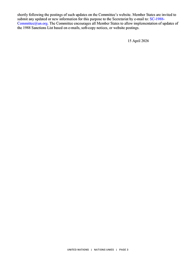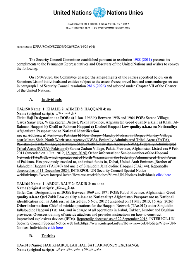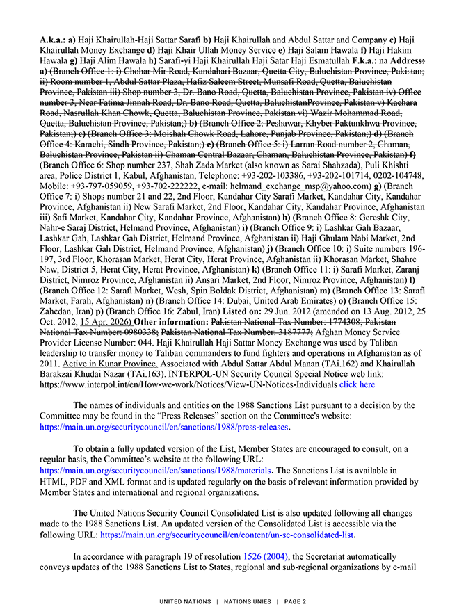 Ārlietu ministrijas informācija Rīgā 2026. gada 17. aprīlī Par ANO sankcijāmĀrlietu ministrija saskaņā ar Starptautisko un Latvijas Republikas nacionālo sankciju likuma 11. panta pirmo prim daļu nosūta publicēšanai oficiālajā izdevumā "Latvijas Vēstnesis" informāciju par Apvienoto Nāciju Organizācijas (turpmāk - ANO) Drošības padomes rezolūcijas grozījumiem. 2026. gada 15. aprīlī ANO Drošības padome saskaņā ar rezolūciju Nr. 1988 (2011) grozīja informāciju par diviem Afganistānas pilsoņiem un vienu Afganistānā, Irānā un Apvienotajos Arābu Emirātos reģistrētu juridisko personu. Lūgums skatīt ANO notu un skaidrojošo informāciju pielikumā. Personas, par kurām grozīta informācija: TAi.150 Vārds: 1: KHALIL 2: AHMED 3: HAQQANI Vārds (oriģinālajā valodā): خلیل احمد حقانی; Tituls: Haji; Dzimšanas datums: a) 1966. gada 1. janvāris; b) starp 1958. gadu un 1964. gadu; Dzimšanas vieta: Sarana Village, Garda Saray area, Waza Zadran District, Paktia Province, Afghanistan; Pazīstams arī kā (augsta ticamība): a) Khalil Al-Rahman Haqqani b) Khalil ur Rahman Haqqani c) Khaleel Haqqani; Valstspiederība: Afganistāna; Adrese: Sarana Zadran Village, Paktia Province, Afghanistan; Pievienots sankciju sarakstam: 2011. gada 9. februāris; Cita informācija: Has previously traveled to, and raised funds in, Dubai, United Arab Emirates. Brother of Jalaluddin Haqqani (TAi.040) and uncle of Sirajuddin Jallaloudine Haqqani (TAi.144). Reportedly deceased as of 11 December 2024; Dzimums: Vīrietis. TAi.164 Vārds: 1: ABDUL RAUF 2: ZAKIR; Vārds (oriģinālajā valodā): عبد الروف ذاکر; Tituls: Qari; Dzimšanas datums: starp 1969. gadu un 1971. gadu; Dzimšanas vieta: Kabul Province, Afghanistan; Pazīstams arī kā (augsta ticamība): Qari Zakir; Valstspiederība: Afganistāna; Pievienots sankciju sarakstam: 2012. gada 5. novembris; Cita informācija: Chief of suicide operations for the Haqqani Network (TAe.012) under Sirajuddin Jallaloudine Haqqani (TAi.144) and in charge of all operations in Kabul, Takhar, Kunduz and Baghlan provinces. Oversees training of suicide attackers and provides instructions on how to construct improvised explosives devices (IEDs). Reportedly deceased as of 22 September 2018; Dzimums: Vīrietis. Juridiskā persona, par kuru grozīta informācija: TAe.010 Nosaukums: HAJI KHAIRULLAH HAJI SATTAR MONEY EXCHANGE; Nosaukums (oriģinālajā valodā): حاجی خیرهلال و حاجی ستار صرافی; Pazīstams arī kā (augsta ticamība): a) Haji Khairullah-Haji Sattar Sarafi b) Haji Khairullah and Abdul Sattar and Company c) Haji Khairullah Money Exchange d) Haji Khair Ullah Money Service e) Haji Salam Hawala f) Haji Hakim Hawala g) Haji Alim Hawala h) Sarafi-yi Haji Khairullah Haji Satar Haji Esmatullah; Adrese: f) (Branch Office 6: Shop number 237, Shah Zada Market (also known as Sarai Shahzada), Puli Khishti area, Police District 1, Kabul, Afghanistan, Telephone: +93-202-103386, +93-202-101714, 0202-104748, Mobile: +93-797-059059, +93-702-222222, e-mail: helmand_exchange_msp@yahoo.com) g) (Branch Office 7: i) Shops number 21 and 22, 2nd Floor, Kandahar City Sarafi Market, Kandahar City, Kandahar Province, Afghanistan ii) New Sarafi Market, 2nd Floor, Kandahar City, Kandahar Province, Afghanistan iii) Safi Market, Kandahar City, Kandahar Province, Afghanistan) h) (Branch Office 8: Gereshk City, Nahr-e Saraj District, Helmand Province, Afghanistan) i) (Branch Office 9: i) Lashkar Gah Bazaar, Lashkar Gah, Lashkar Gah District, Helmand Province, Afghanistan ii) Haji Ghulam Nabi Market, 2nd Floor, Lashkar Gah District, Helmand Province, Afghanistan) j) (Branch Office 10: i) Suite numbers 196- 197, 3rd Floor, Khorasan Market, Herat City, Herat Province, Afghanistan ii) Khorasan Market, Shahre Naw, District 5, Herat City, Herat Province, Afghanistan) k) (Branch Office 11: i) Sarafi Market, Zaranj District, Nimroz Province, Afghanistan ii) Ansari Market, 2nd Floor, Nimroz Province, Afghanistan) l) (Branch Office 12: Sarafi Market, Wesh, Spin Boldak District, Afghanistan) m) (Branch Office 13: Sarafi Market, Farah, Afghanistan) n) (Branch Office 14: Dubai, United Arab Emirates) o) (Branch Office 15: Zahedan, Iran) p) (Branch Office 16: Zabul, Iran); Pievienots sankciju sarakstam: 2012. gada 29. jūnijā; Cita informācija: Afghan Money Service Provider License Number: 044. Haji Khairullah Haji Sattar Money Exchange was used by Taliban leadership to transfer money to Taliban commanders to fund fighters and operations in Afghanistan as of 2011. Active in Kunar Province. Associated with Abdul Sattar Abdul Manan (TAi.162) and Khairullah Barakzai Khudai Nazar (TAi.163). Ārlietu ministrijas