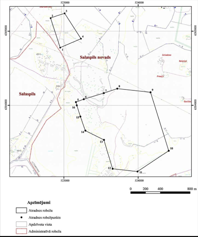 II. Valsts nozīmes ģipšakmens atradnes "Salaspils" robežpunktu koordinātas Nr. p.k. | Robežpunkts | X koordināta | Y koordināta | 1. | 1 | 304778,60 | 522949,26 | 2. | 2 | 305175,95 | 522819,59 | 3. | 3 | 305240,94 | 523009,03 | 4. | 4 | 304897,94 | 523229,89 | 5. | 5 | 304044,18 | 523161,22 | 6. | 6 | 304083,04 | 523266,98 | 7. | 7 | 304165,01 | 523537,66 | 8. | 8 | 304225,08 | 523718,56 | 9. | 9 | 304175,89 | 524166,20 | 10. | 10 | 303388,58 | 524411,54 | 11. | 11 | 303109,12 | 523991,08 | 12. | 12 | 303146,01 | 523656,21 | 13. | 13 | 303535,67 | 523539,38 | 14. | 14 | 303661,10 | 523288,26 | 15. | 15 | 303849,07 | 523220,62 | 16. | 16 | 303999,29 | 523173,52 |