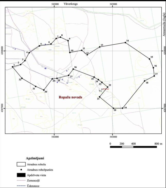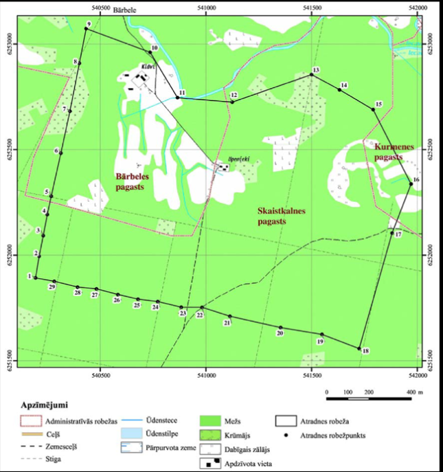 II. Valsts nozīmes dolomīta atradnes "Turkalne" robežpunktu koordinātas Nr. p.k. | Robežpunkts | X koordināta | Y koordināta | 1. | 1 | 307722,83 | 541283,20 | 2. | 2 | 307763,01 | 541422,00 | 3. | 3 | 307830,76 | 541496,26 | 4. | 4 | 307968,72 | 541569,22 | 5. | 5 | 308088,33 | 541745,71 | 6. | 6 | 308121,49 | 541944,72 | 7. | 7 | 308216,67 | 542033,54 | 8. | 8 | 308240,62 | 542105,40 | 9. | 9 | 308178,62 | 542237,71 | 10. | 10 | 307972,33 | 542269,03 | 11. | 11 | 308010,29 | 542472,10 | 12. | 12 | 307933,63 | 542567,55 | 13. | 13 | 308069,99 | 542781,30 | 14. | 14 | 308146,19 | 543221,15 | 15. | 15 | 307860,13 | 543636,27 | 16. | 16 | 307707,17 | 543702,64 | 17. | 17 | 307564,15 | 543717,04 | 18. | 18 | 307477,84 | 543551,37 | 19. | 19 | 307004,74 | 543173,40 | 20. | 20 | 307002,25 | 543018,09 | 21. | 21 | 307200,16 | 542779,87 | 22. | 22 | 307371,53 | 542917,96 | 23. | 23 | 307453,54 | 542818,95 | 24. | 24 | 307500,69 | 542758,27 | 25. | 25 | 307544,92 | 542684,56 | 26. | 26 | 307684,13 | 542326,53 | 27. | 27 | 307575,32 | 542246,55 | 28. | 28 | 307523,17 | 542047,68 | 29. | 29 | 307514,06 | 541965,61 | 30. | 30 | 307319,28 | 541821,26 | 31. | 31 | 307381,70 | 541680,95 | 32. | 32 | 307523,70 | 541444,67 |