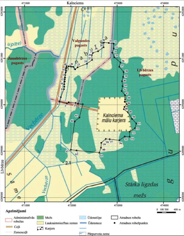 II. Valsts nozīmes māla atradnes "Kaiģi" robežpunktu koordinātas Nr. p.k. | Robežpunkts | X koordināta | Y koordināta | 1 | 2 | 3 | 4 | 1. | 1 | 290009,45 | 472255,52 | 2. | 2 | 290021,61 | 472152,16 | 3. | 3 | 290038,73 | 472101,47 | 4. | 4 | 290051,24 | 471953,34 | 5. | 5 | 290030,17 | 471913,18 | 6. | 6 | 290067,74 | 471752,40 | 7. | 7 | 290162,50 | 471782,83 | 8. | 8 | 290334,32 | 471848,66 | 9. | 9 | 290388,31 | 471855,90 | 10. | 10 | 290441,63 | 471856,56 | 11. | 11 | 290498,25 | 471866,44 | 12. | 12 | 290543,67 | 471867,75 | 13. | 13 | 290583,83 | 471873,68 | 14. | 14 | 290637,16 | 471878,29 | 15. | 15 | 290693,78 | 471888,16 | 16. | 16 | 290741,18 | 471892,77 | 17. | 17 | 290789,24 | 471899,36 | 18. | 18 | 290838,61 | 471903,31 | 19. | 19 | 290828,74 | 471953,34 | 20. | 20 | 290822,81 | 472002,06 | 21. | 21 | 290817,54 | 472048,14 | 22. | 22 | 290763,56 | 472092,91 | 23. | 23 | 290805,69 | 472144,92 | 24. | 24 | 290881,90 | 472345,82 | 25. | 25 | 290966,51 | 472458,43 | 26. | 26 | 291069,43 | 472451,48 | 27. | 27 | 291117,06 | 472473,27 | 28. | 28 | 291154,55 | 472587,54 | 29. | 29 | 291237,90 | 472707,34 | 30. | 30 | 291340,30 | 472712,40 | 31. | 31 | 291332,37 | 472817,44 | 32. | 32 | 291317,16 | 472923,42 | 33. | 33 | 291216,15 | 472924,92 | 34. | 34 | 291121,83 | 472897,14 | 35. | 35 | 291024,31 | 472937,06 | 36. | 36 | 290911,54 | 473071,85 | 37. | 37 | 290818,35 | 473046,16 | 38. | 38 | 290705,55 | 473138,88 | 39. | 39 | 290600,27 | 473128,63 | 40. | 40 | 290506,27 | 473106,03 | 41. | 41 | 290400,76 | 473116,09 | 42. | 42 | 290295,75 | 473096,49 | 43. | 43 | 290206,74 | 473169,00 | 44. | 44 | 290114,20 | 473171,79 | 45. | 45 | 290063,72 | 473163,32 | 46. | 46 | 290014,11 | 473207,76 | 47. | 47 | 289952,07 | 473157,20 | 48. | 48 | 289903,50 | 473144,95 | 49. | 49 | 289830,70 | 473235,29 | 50. | 50 | 289694,81 | 473320,73 | 51. | 51 | 289597,72 | 473414,09 | 52. | 52 | 289496,82 | 473384,23 | 53. | 53 | 289420,32 | 473267,78 | 54. | 54 | 289312,11 | 473269,65 | 55. | 55 | 289317,39 | 473162,55 | 56. | 56 | 289235,17 | 473045,55 | 57. | 57 | 289258,34 | 472839,38 | 58. | 58 | 289264,63 | 472753,98 | 59. | 59 | 289180,82 | 472655,85 | 60. | 60 | 289075,76 | 472650,48 | 61. | 61 | 288966,94 | 472613,70 | 62. | 62 | 289016,75 | 472123,52 | 63. | 63 | 289031,53 | 471999,73 | 64. | 64 | 289641,06 | 472082,57 | 65. | 65 | 289723,03 | 472185,42 |