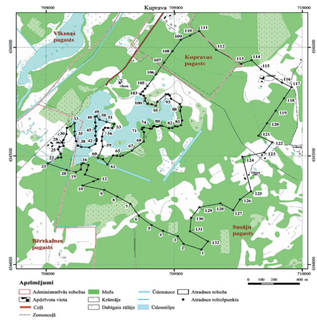 II. Valsts nozīmes māla atradnes "Kuprava" robežpunktu koordinātas Nr. p.k. | Robežpunkts | X koordināta | Y koordināta | 1 | 2 | 3 | 4 | 1. | 1 | 344137,33 | 709211,77 | 2. | 2 | 344189,94 | 709071,77 | 3. | 3 | 344259,18 | 709028,12 | 4. | 4 | 344308,95 | 708912,42 | 5. | 5 | 344362,76 | 708822,49 | 6. | 6 | 344446,53 | 708724,33 | 7. | 7 | 344556,74 | 708656,40 | 8. | 8 | 344625,00 | 708554,77 | 9. | 9 | 344686,15 | 708453,30 | 10. | 10 | 344727,09 | 708284,53 | 11. | 11 | 344766,41 | 708369,73 | 12. | 12 | 344785,13 | 708407,17 | 13. | 13 | 344827,73 | 708302,79 | 14. | 14 | 344868,92 | 708318,23 | 15. | 15 | 344915,73 | 708329,47 | 16. | 16 | 344933,99 | 708288,28 | 17. | 17 | 344920,88 | 708274,23 | 18. | 18 | 344875,01 | 708270,02 | 19. | 19 | 344850,67 | 708231,63 | 20. | 20 | 344870,80 | 708159,08 | 21. | 21 | 344930,24 | 708013,03 | 22. | 22 | 344984,55 | 708090,73 | 23. | 23 | 344985,01 | 708117,88 | 24. | 24 | 345020,59 | 708113,67 | 25. | 25 | 345060,38 | 708093,07 | 26. | 26 | 345082,85 | 708103,84 | 27. | 27 | 345092,21 | 708135,67 | 28. | 28 | 345126,38 | 708122,10 | 29. | 29 | 345146,04 | 708134,27 | 30. | 30 | 345199,88 | 708156,74 | 31. | 31 | 345257,92 | 708161,42 | 32. | 32 | 345271,50 | 708190,44 | 33. | 33 | 345304,26 | 708221,80 | 34. | 34 | 345224,68 | 708221,46 | 35. | 35 | 345185,83 | 708222,69 | 36. | 36 | 345135,28 | 708233,63 | 37. | 37 | 345094,08 | 708248,02 | 38. | 38 | 345081,89 | 708273,57 | 39. | 39 | 345077,82 | 708337,28 | 40. | 40 | 345109,02 | 708384,31 | 41. | 41 | 345139,02 | 708393,47 | 42. | 42 | 345154,94 | 708393,33 | 43. | 43 | 345186,30 | 708383,77 | 44. | 44 | 345225,15 | 708387,51 | 45. | 45 | 345253,71 | 708380,96 | 46. | 46 | 345271,96 | 708389,39 | 47. | 47 | 345308,01 | 708382,83 | 48. | 48 | 345361,84 | 708381,43 | 49. | 49 | 345365,59 | 708394,54 | 50. | 50 | 345333,29 | 708416,07 | 51. | 51 | 345313,16 | 708470,37 | 52. | 52 | 345293,50 | 708530,29 | 53. | 53 | 345256,05 | 708517,18 | 54. | 54 | 345257,18 | 708482,69 | 55. | 55 | 345259,39 | 708460,02 | 56. | 56 | 345241,09 | 708446,13 | 57. | 57 | 345178,51 | 708436,87 | 58. | 58 | 345138,40 | 708434,06 | 59. | 59 | 345085,36 | 708441,60 | 60. | 60 | 344981,74 | 708404,37 | 61. | 61 | 344969,10 | 708441,81 | 62. | 62 | 344920,41 | 708477,39 | 63. | 63 | 345003,99 | 708522,52 | 64. | 64 | 345000,63 | 708553,43 | 65. | 65 | 344999,28 | 708578,96 | 66. | 66 | 345003,99 | 708597,78 | 67. | 67 | 345049,68 | 708670,35 | 68. | 68 | 345131,66 | 708762,41 | 69. | 69 | 345217,67 | 708763,75 | 70. | 70 | 345244,55 | 708747,62 | 71. | 71 | 345257,32 | 708749,64 | 72. | 72 | 345261,35 | 708762,41 | 73. | 73 | 345250,60 | 708810,12 | 74. | 74 | 345251,94 | 708824,90 | 75. | 75 | 345270,76 | 708835,65 | 76. | 76 | 345276,14 | 708843,04 | 77. | 77 | 345268,07 | 708863,20 | 78. | 78 | 345269,42 | 708873,96 | 79. | 79 | 345278,82 | 708890,08 | 80. | 80 | 345277,48 | 708904,19 | 81. | 81 | 345254,63 | 708957,95 | 82. | 82 | 345257,32 | 708984,83 | 83. | 83 | 345272,78 | 709006,33 | 84. | 84 | 345270,09 | 709025,82 | 85. | 85 | 345282,86 | 709052,03 | 86. | 86 | 345327,21 | 709061,43 | 87. | 87 | 345416,58 | 709045,98 | 88. | 88 | 345449,50 | 709052,03 | 89. | 89 | 345479,07 | 709043,29 | 90. | 90 | 345526,11 | 708975,42 | 91. | 91 | 345557,02 | 708964,67 | 92. | 92 | 345569,11 | 708952,58 | 93. | 93 | 345568,44 | 708934,43 | 94. | 94 | 345499,90 | 708869,25 | 95. | 95 | 345462,27 | 708856,48 | 96. | 96 | 345475,71 | 708823,56 | 97. | 97 | 345480,41 | 708791,30 | 98. | 98 | 345509,31 | 708770,47 | 99. | 99 | 345509,31 | 708770,47 | 100. | 100 | 345531,48 | 708774,50 | 101. | 101 | 345555,67 | 708761,74 | 102. | 102 | 345568,44 | 708737,55 | 103. | 103 | 345594,65 | 708754,35 | 104. | 104 | 345620,19 | 708772,89 | 105. | 105 | 345643,70 | 708789,96 | 106. | 106 | 345751,22 | 708856,48 | 107. | 107 | 345859,40 | 708919,65 | 108. | 108 | 345964,90 | 708985,50 | 109. | 109 | 346069,73 | 709050,68 | 110. | 110 | 346110,05 | 709123,93 | 111. | 111 | 346151,04 | 709195,16 | 112. | 112 | 345977,67 | 709326,86 | 113. | 113 | 345848,65 | 709523,08 | 114. | 114 | 345882,25 | 709603,71 | 115. | 115 | 345797,58 | 709677,63 | 116. | 116 | 345675,96 | 709841,59 | 117. | 117 | 345634,30 | 709916,18 | 118. | 118 | 345530,14 | 709857,04 | 119. | 119 | 345415,23 | 709791,86 | 120. | 120 | 345300,33 | 709724,00 | 121. | 121 | 345186,09 | 709658,14 | 122. | 122 | 345124,27 | 709765,66 | 123. | 123 | 345031,54 | 709703,16 | 124. | 124 | 344991,22 | 709532,48 | 125. | 125 | 344674,05 | 709599,68 | 126. | 126 | 344598,79 | 709513,67 | 127. | 127 | 344500,01 | 709459,91 | 128. | 128 | 344561,83 | 709360,46 | 129. | 129 | 344526,22 | 709197,17 | 130. | 130 | 344429,46 | 709131,99 | 131. | 131 | 344305,03 | 709122,75 | 132. | 132 | 344212,41 | 709262,35 |