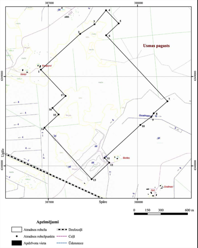 II. Valsts nozīmes māla atradnes "Usma" robežpunktu koordinātas Nr. p.k. | Robežpunkts | X koordināta | Y koordināta | 1. | 1 | 349076,65 | 386916,12 | 2. | 2 | 349477,94 | 387357,61 | 3. | 3 | 349586,04 | 387518,23 | 4. | 4 | 349741,81 | 387646,99 | 5. | 5 | 349595,19 | 387788,67 | 6. | 6 | 349462,75 | 387639,32 | 7. | 7 | 348722,64 | 388326,07 | 8. | 8 | 348590,85 | 388179,35 | 9. | 9 | 348547,54 | 388153,50 | 10. | 10 | 348457,99 | 388032,05 | 11. | 11 | 348089,76 | 387630,47 | 12. | 12 | 348037,25 | 387682,82 | 13. | 13 | 347851,84 | 387486,33 | 14. | 14 | 348426,74 | 386956,58 | 15. | 15 | 348574,75 | 387115,52 | 16. | 16 | 348647,92 | 387047,00 | 17. | 17 | 348783,14 | 387193,98 |