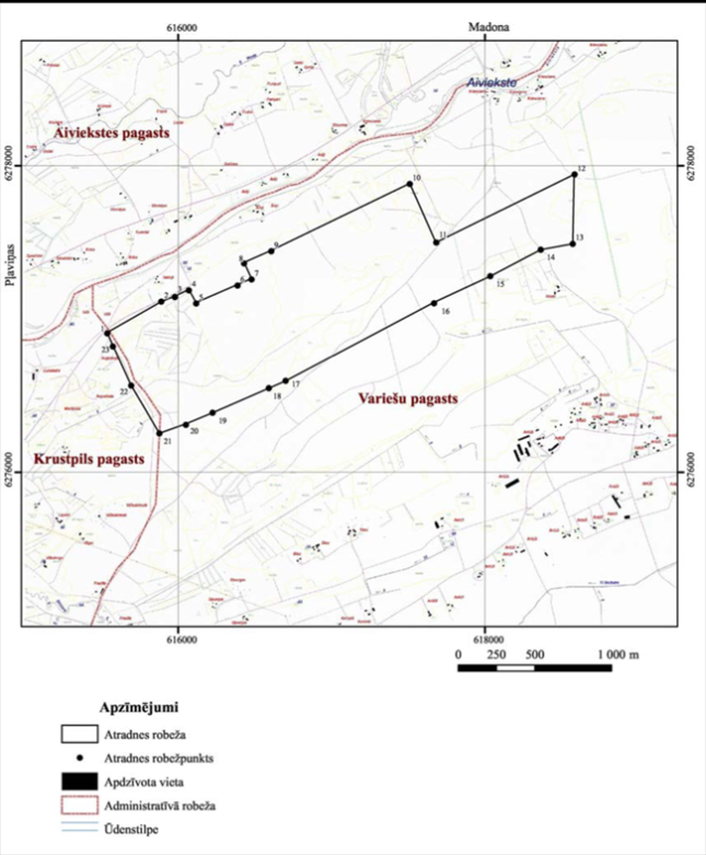 II. Valsts nozīmes dolomīta atradnes "Aiviekste - kreisais krasts" robežpunktu koordinātas Nr. p.k. | Robežpunkts | X koordināta | Y koordināta | 1. | 1 | 276905,00 | 615537,00 | 2. | 2 | 277112,87 | 615890,00 | 3. | 3 | 277143,00 | 615978,00 | 4. | 4 | 277186,00 | 616070,00 | 5. | 5 | 277101,00 | 616117,00 | 6. | 6 | 277218,00 | 616387,00 | 7. | 7 | 277257,00 | 616479,00 | 8. | 8 | 277363,00 | 616430,00 | 9. | 9 | 277441,00 | 616607,00 | 10. | 10 | 277881,00 | 617510,00 | 11. | 11 | 277499,00 | 617682,00 | 12. | 12 | 277942,92 | 618584,53 | 13. | 13 | 277490,62 | 618572,93 | 14. | 14 | 277452,45 | 618364,43 | 15. | 15 | 277278,89 | 618035,53 | 16. | 16 | 277101,50 | 617667,39 | 17. | 17 | 276594,00 | 616701,00 | 18. | 18 | 276546,00 | 616591,00 | 19. | 19 | 276385,00 | 616224,00 | 20. | 20 | 276307,00 | 616050,00 | 21. | 21 | 276251,07 | 615877,10 | 22. | 22 | 276563,97 | 615694,15 | 23. | 23 | 276820,00 | 615574,00 |