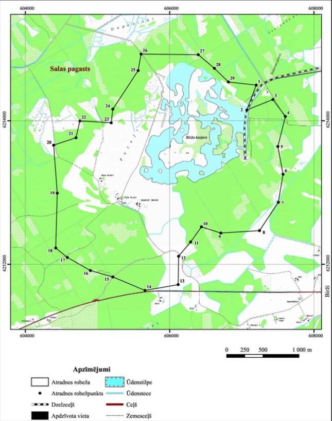 II. Valsts nozīmes dolomīta atradnes "Birži-Pūteļi" robežpunktu koordinātas Nr. p.k. | Robežpunkts | X koordināta | Y koordināta | 1. | 1 | 254495,82 | 607199,96 | 2. | 2 | 254149,86 | 607070,31 | 3. | 3 | 254296,01 | 607429,85 | 4. | 4 | 254060,54 | 607603,70 | 5. | 5 | 253642,01 | 607499,44 | 6. | 6 | 253254,47 | 607570,78 | 7. | 7 | 252865,22 | 607505,15 | 8. | 8 | 252470,08 | 607244,29 | 9. | 9 | 252437,16 | 606709,29 | 10. | 10 | 252522,21 | 606439,87 | 11. | 11 | 252313,70 | 606291,71 | 12. | 12 | 252113,69 | 606124,35 | 13. | 13 | 251717,77 | 606118,30 | 14. | 14 | 251636,29 | 605657,88 | 15. | 15 | 251824,64 | 605213,05 | 16. | 16 | 251913,40 | 604902,91 | 17. | 17 | 252096,61 | 604582,24 | 18. | 18 | 252229,27 | 604420,94 | 19. | 19 | 252991,52 | 604443,56 | 20. | 20 | 253660,23 | 604393,04 | 21. | 21 | 253764,25 | 604702,07 | 22. | 22 | 253997,23 | 604756,34 | 23. | 23 | 253971,60 | 605191,25 | 24. | 24 | 254162,45 | 605213,10 | 25. | 25 | 254698,80 | 605562,84 | 26. | 26 | 254928,31 | 605603,54 | 27. | 27 | 254919,27 | 606396,47 | 28. | 28 | 254729,57 | 606619,57 | 29. | 29 | 254539,54 | 606814,80 |