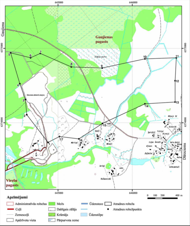 II. Valsts nozīmes dolomīta atradnes "Dārzciems" robežpunktu koordinātas Nr. p.k. | Robežpunkts | X koordināta | Y koordināta | 1. | 1 | 373737,10 | 644867,43 | 2. | 2 | 374108,54 | 644580,72 | 3. | 3 | 374312,39 | 644562,94 | 4. | 4 | 374525,38 | 644487,53 | 5. | 5 | 374937,07 | 644364,23 | 6. | 6 | 374871,86 | 644632,24 | 7. | 7 | 374929,94 | 644762,68 | 8. | 8 | 374748,95 | 645178,99 | 9. | 9 | 374734,66 | 645595,16 | 10. | 10 | 374857,02 | 646169,41 | 11. | 11 | 374871,60 | 646590,64 | 12. | 12 | 374564,09 | 646574,87 | 13. | 13 | 374278,30 | 646574,87 | 14. | 14 | 374254,19 | 646168,52 | 15. | 15 | 373991,63 | 645598,74 | 16. | 16 | 373784,43 | 645280,80 | 17. | 17 | 373816,58 | 645020,02 |