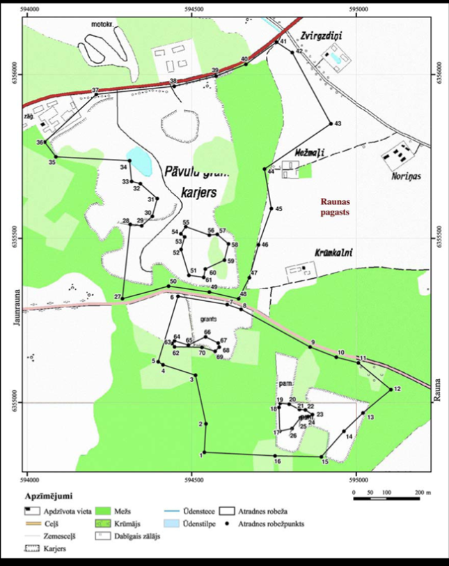 II. Valsts nozīmes smilts-grants un smilts atradnes "Pāvuli" robežpunktu koordinātas Nr. p.k. | Robežpunkts | X koordināta | Y koordināta | 1 | 2 | 3 | 4 | 1. | 1 | 354848,00 | 594538,16 | 2. | 2 | 354935,00 | 594543,16 | 3. | 3 | 355083,25 | 594511,33 | 4. | 4 | 355114,92 | 594412,56 | 5. | 5 | 355124,50 | 594398,21 | 6. | 6 | 355324,00 | 594458,16 | 7. | 7 | 355298,85 | 594607,72 | 8. | 8 | 355284,41 | 594649,97 | 9. | 9 | 355169,47 | 594859,64 | 10. | 10 | 355138,24 | 594939,16 | 11. | 11 | 355120,96 | 595006,14 | 12. | 12 | 355039,44 | 595104,97 | 13. | 13 | 354968,00 | 595020,16 | 14. | 14 | 354912,00 | 594962,16 | 15. | 15 | 354834,00 | 594894,16 | 16. | 16 | 354837,00 | 594753,16 | 17. | 17 | 354912,43 | 594767,35 | 18. | 18 | 354984,71 | 594765,22 | 19. | 19 | 354997,27 | 594768,78 | 20. | 20 | 354994,67 | 594796,27 | 21. | 21 | 354978,55 | 594827,31 | 22. | 22 | 354977,12 | 594845,33 | 23. | 23 | 354962,91 | 594866,90 | 24. | 24 | 354956,98 | 594853,62 | 25. | 25 | 354952,95 | 594830,16 | 26. | 26 | 354920,24 | 594804,80 | 27. | 27 | 355316,90 | 594289,33 | 28. | 28 | 355542,64 | 594313,15 | 29. | 29 | 355538,39 | 594347,86 | 30. | 30 | 355567,13 | 594380,10 | 31. | 31 | 355621,60 | 594395,00 | 32. | 32 | 355666,96 | 594343,98 | 33. | 33 | 355674,03 | 594317,02 | 34. | 34 | 355737,00 | 594311,00 | 35. | 35 | 355749,00 | 594087,00 | 36. | 36 | 355794,00 | 594053,00 | 37. | 37 | 355939,44 | 594209,82 | 38. | 38 | 355964,02 | 594446,75 | 39. | 39 | 355995,09 | 594574,10 | 40. | 40 | 356031,07 | 594664,71 | 41. | 41 | 356098,74 | 594757,78 | 42. | 42 | 356066,97 | 594805,46 | 43. | 43 | 355849,67 | 594922,85 | 44. | 44 | 355711,66 | 594721,24 | 45. | 45 | 355591,26 | 594741,82 | 46. | 46 | 355480,00 | 594703,00 | 47. | 47 | 355380,00 | 594675,00 | 48. | 48 | 355316,44 | 594642,30 | 49. | 49 | 355336,96 | 594553,43 | 50. | 50 | 355354,32 | 594429,43 | 51. | 51 | 355387,20 | 594491,46 | 52. | 52 | 355465,89 | 594467,60 | 53. | 53 | 355504,39 | 594478,48 | 54. | 54 | 355514,02 | 594466,76 | 55. | 55 | 355535,78 | 594481,83 | 56. | 56 | 355509,83 | 594553,40 | 57. | 57 | 355512,34 | 594577,68 | 58. | 58 | 355483,05 | 594611,58 | 59. | 59 | 355433,66 | 594599,44 | 60. | 60 | 355406,45 | 594541,26 | 61. | 61 | 355380,92 | 594536,24 | 62. | 62 | 355169,95 | 594447,72 | 63. | 63 | 355180,06 | 594440,19 | 64. | 64 | 355188,06 | 594447,72 | 65. | 65 | 355175,12 | 594489,82 | 66. | 66 | 355200,52 | 594541,79 | 67. | 67 | 355181,70 | 594580,36 | 68. | 68 | 355169,01 | 594583,42 | 69. | 69 | 355156,54 | 594570,96 | 70. | 70 | 355168,30 | 594530,98 |