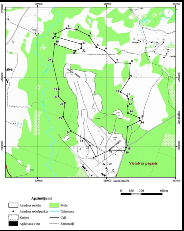 II. Valsts nozīmes smilts-grants atradnes "Veseta" robežpunktu koordinātas Nr. p.k. | Robežpunkts | X koordināta | Y koordināta | 1. | 1 | 290637,38 | 609255,63 | 2. | 2 | 290723,14 | 609422,34 | 3. | 3 | 290702,02 | 609568,86 | 4. | 4 | 290616,22 | 609742,96 | 5. | 5 | 290447,26 | 609851,20 | 6. | 6 | 290398,09 | 609968,68 | 7. | 7 | 290220,88 | 610129,99 | 8. | 8 | 290210,32 | 610343,69 | 9. | 9 | 289989,23 | 610330,49 | 10. | 10 | 289793,87 | 610201,13 | 11. | 11 | 289735,79 | 610301,45 | 12. | 12 | 289692,23 | 610315,97 | 13. | 13 | 289587,22 | 610308,05 | 14. | 14 | 289484,26 | 610310,69 | 15. | 15 | 289412,98 | 610480,97 | 16. | 16 | 289376,02 | 610483,61 | 17. | 17 | 289285,94 | 610304,09 | 18. | 18 | 288982,93 | 610282,97 | 19. | 19 | 288936,73 | 610261,85 | 20. | 20 | 288944,65 | 610048,15 | 21. | 21 | 288852,63 | 609844,87 | 22. | 22 | 289013,67 | 609757,48 | 23. | 23 | 289113,98 | 609667,73 | 24. | 24 | 289226,05 | 609480,95 | 25. | 25 | 289431,44 | 609371,39 | 26. | 26 | 289633,27 | 609395,15 | 27. | 27 | 289730,02 | 609302,75 | 28. | 28 | 289833,38 | 609308,03 | 29. | 29 | 290238,35 | 609217,21 | 30. | 30 | 290494,96 | 609247,97 | 31. | 31 | 290390,94 | 609543,25 | 32. | 32 | 290432,92 | 609636,05 | 33. | 33 | 290492,32 | 609632,09 | 34. | 34 | 290600,42 | 609252,99 |
