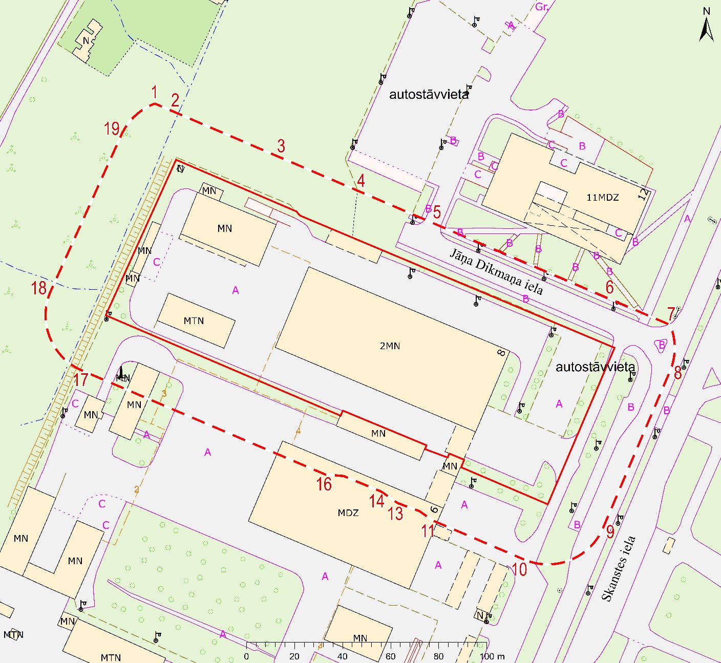 II. Aizsargjosla ap valsts aizsardzības objektu Rīgā, Skanstes ielā 8, kadastra Nr. 0100 024 0308 (robežpunktu koordinātas) | Robežpunktu koordinātas LKS-92 TM | Aizsargjoslas robežposmi | Nr. p. k. | X koordināta | Y koordināta | Nr. p. k. | Robežposma virziens | Robežposma garums (m) | | 1. | 314172,922 | 507052,652 | | Robežposmu atskaites sākums – 1. atzīme | | | | | | 1. | no 1. atzīmes uz 2. atzīmi pa zemes vienības ar kadastra apzīmējumu 01000240225 un zemes vienības ar kadastra apzīmējumu 01000242146 kopīgo malu dienvidaustrumu virzienā | 8,011 | | 2. | 314169,760 | 507060,013 | | | | | | | | 2. | no 2. atzīmes uz 3. atzīmi pa zemes vienības ar kadastra apzīmējumu 01000240225 un zemes vienības ar kadastra apzīmējumu 01000240072 kopīgo malu dienvidaustrumu virzienā | 47,915 | | 3. | 314150,847 | 507104,037 | | | | | | | | 3. | no 3. atzīmes uz 4. atzīmi pa zemes vienības ar kadastra apzīmējumu 01000240225 un zemes vienības ar kadastra apzīmējumu 01000249018 kopīgo malu dienvidaustrumu virzienā | 35,894 | | 4. | 314136,679 | 507137,017 | | | | | | | | 4. | no 4. atzīmes uz 5. atzīmi pa zemes vienības ar kadastra apzīmējumu 01000240225 un zemes vienības ar kadastra apzīmējumu 01000240415 kopīgo malu dienvidaustrumu virzienā | 34,185 | | 5. | 314123,186 | 507168,426 | | | | | | | | 5. | no 5. atzīmes uz 6. atzīmi pa zemes vienības ar kadastra apzīmējumu 01000240225 un zemes vienības ar kadastra apzīmējumu 01000240415 kopīgo malu dienvidaustrumu virzienā | 78,788 | | 6. | 314092,087 | 507240,817 | | | | | | | | 6. | no 6. atzīmes uz 7. atzīmi dienvidaustrumu virzienā | 28,563 | | 7. | 314080,813 | 507267,061 | | | | | | | | 7. | no 7. atzīmes uz 8. atzīmi riņķa līnijas loks ar rādiusu 25 m, centrs koordinātās x – 314071,272 y – 507243,953 | 19,872 | | 8. | 314061,460 | 507266,947 | | | | | | | | 8. | no 8. atzīmes uz 9. atzīmi dienvidu virzienā | 70,791 | | 9. | 313996,349 | 507239,164 | | | | | | | | 9. | no 9. atzīmes uz 10. atzīmi riņķa līnijas loks ar rādiusu 25 m, centrs koordinātās x – 314006,161 y – 507216,170 | 39,288 | | 10. | 313983,174 | 507206,341 | | | | | | | | 10. | no 10. atzīmes uz 11. atzīmi rietumu virzienā | 41,362 | | 11. | 313999,436 | 507168,310 | | | | | | | | 11. | no 11. atzīmes uz 12. atzīmi ziemeļrietumu virzienā | 6,721 | | 12. | 314003,291 | 507162,804 | | | | | | | | 12. | no 12. atzīmes uz 13. atzīmi rietumu virzienā | 9,736 | | 13. | 314006,684 | 507153,678 | | | | | | | | 13. | no 13. atzīmes uz 14. atzīmi ziemeļrietumu virzienā | 8,343 | | 14. | 314011,469 | 507146,844 | | | | | | | | 14. | no 14. atzīmes uz 15. atzīmi rietumu virzienā | 16,809 | | 15. | 314017,901 | 507131,314 | | | | | | | | 15. | no 15. atzīmes uz 16. atzīmi rietumu virzienā | 7,809 | | 16. | 314018,581 | 507123,535 | | | | | | | | 16. | no 16. atzīmes uz 17. atzīmi rietumu virzienā | 109,997 | | 17. | 314061,826 | 507022,395 | | | | | | | | 17. | no 17. atzīmes uz 18. atzīmi riņķa līnijas loks ar rādiusu 25 m, centrs koordinātās x – 314084,813 y – 507032,224 | 39,787 | | 18. | 314095,115 | 507009,445 | | | | | | | | 18. | no 18. atzīmes uz 19. atzīmi ziemeļaustrumu virzienā | 71,038 | | 19. | 314159,841 | 507038,718 | | | | | | | | 19. | no 19. atzīmes uz 1. atzīmi riņķa līnijas loks ar rādiusu 25 m, centrs koordinātās x – 314149,539 y – 507061,497 | 19,611 |