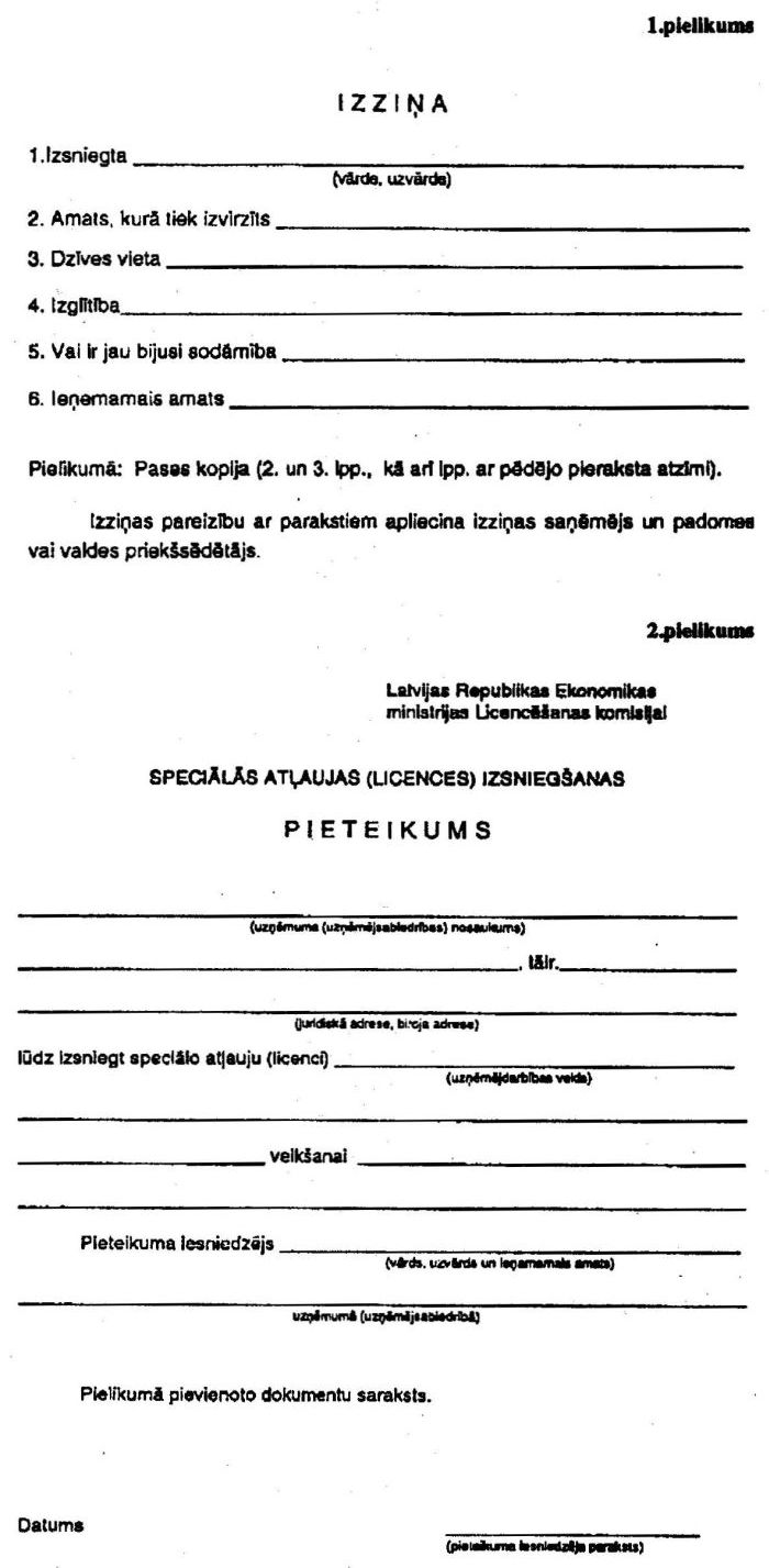 1) Ekonomikas ministrijai adresēts pieteikums atļaujas