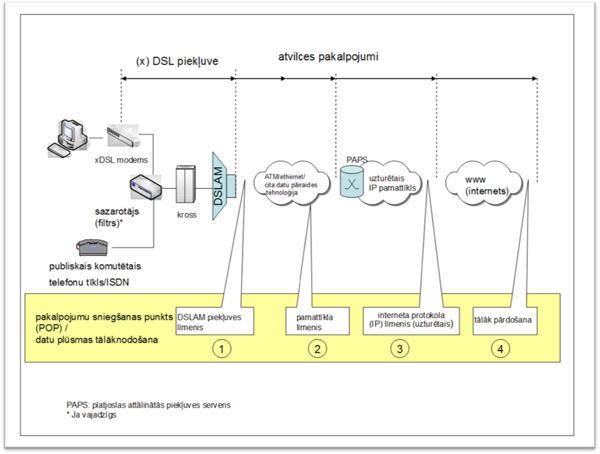 1 ISO/IEC 8802-3: "Information technology - Telecommunications and information exchange between systems - Local and metropolitan area networks - Specific requirements - Part 3: Carrier sense multiple access with collision detection (CSMA/CD) access method and physical layer specifications" 2 angļu val. – CAPEX - capital expenditure 3 angļu val. – terminating segment 4 angļu val. – trunk segment 5 angļu val. – bit stream access 6 Piekļuve datu plūsmai attiecas uz gadījumiem, kad pamatoperators uzstāda augsta ātruma piekļuves posmu (link) lietotāja telpās (piemēram, uzstādot ADSL iekārtas un veicot konfigurāciju tā lokālajā piekļuves tīklā) un tad šo posmu (linku) padara pieejamu trešajām pusēm, lai tiem dotu iespēju nodrošināt augsta ātruma pakalpojumus lietotājiem. Pamatoperators var arī nodrošināt pārraides pakalpojumus tā konkurentiem, lai noslodzi nogādātu augstākā tīkla hierarhijas līmenī, kurā jaunajiem ienācējiem varētu būt platjoslas piekļuve 7 angļu val. – bundled offer