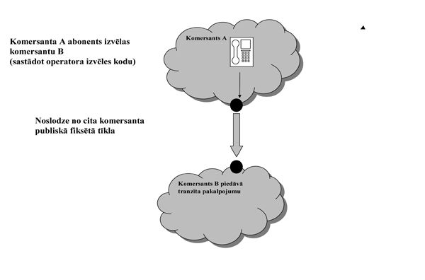23.7 | Starpsavienojumu shēmas | 23.7.1 | Noslodze tranzītā | | | Tranzīts ir komersanta sniegts vairumtirdzniecības pakalpojums, kas nodrošina ienākošās noslodzes maršrutēšanu starp divām komutācijas iekārtām, kuras izmanto starpsavienojuma nodrošināšanai (starpsavienojuma punktiem). Pakalpojuma lietotāji ir citi komersanti, kuri nodrošina publiskos telefonu tīklus.