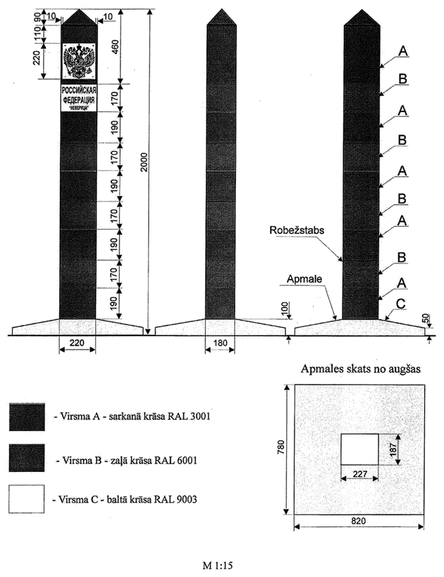 2. Uz robežzīmes robežstaba plaknes, kas pavērsta pret robežu krustpunktu, atrodas valsts ģerboņa attēls, valsts nosaukums, kuras teritorijā ir uzstādīts robežstabs, un robežzīmes nosaukums. Uzraksti veikti attiecīgās valsts valodā.