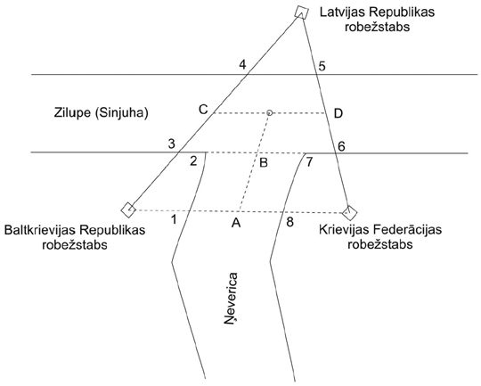 1. Robežu krustpunkts atrodas uz Zilupes (Sinjuha) upes un tajā ietekošās Ņevericas upes viduslīniju krustpunktā ar koordinātām: