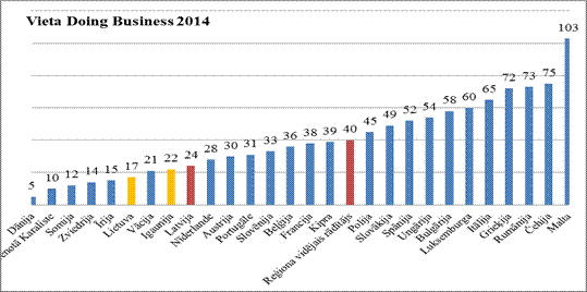 Uzņēmējiem labvēlīgas vides novērtējumā Latvija atrodas 9.vietā, kas ir par 1 vietu zemāk nekā gadu iepriekš, starp Eiropas Savienības dalībvalstīm, piekāpjoties Dānijai, Apvienotajai Karalistei, Īrijai, Somijai, Zviedrijai, Vācijai un Igaunijai, un šogad arī Lietuvai. Jāatzīmē, ka Latvijas vērtējums ir kopumā uzlabojies, salīdzinoši ar vērtējumu gadu iepriekš – Latvija Doing Business 2013 bija 24.vietā starp 185 pasaules valstīm, bet pasliktinājies par vienu vietu starp Eiropas Savienības dalībvalstīm. Vērtējot situāciju kaimiņvalstīs, Igaunija ir zaudējusi savas pozīcijas par 1 vietu (no 21.vietas uz 22.vietu), savukārt Lietuva krasi uzlabojusi savas pozīcijas par 8 vietām (no 25.vietas uz 17.vietu). Minētā situācija ir skaidrojama ar to, ka Lietuvā ir veiktas būtiskas reformas, kā arī tas, ka citas valstis nav veikušas nozīmīgākas uzņēmējdarbības vidi uzlabojošas reformas, līdz ar to zaudējot savas pozīcijas stagnācijas dēļ. Baltijas valstis Doing Business 2013 un 2014 | Latvija | Igaunija | Lietuva | | DB2013 | DB2014 | DB2013 | DB2014 | DB2013 | DB2014 | | Uzņēmējdarbības uzsākšana | 59 | 57 | 50 | 61 | 105 | 11 | | Būvniecības atļaujas | 118 | 79 | 38 | 38 | 39 | 39 | | Pieslēgums elektroenerģijai | 89 | 83 | 55 | 56 | 80 | 75 | | Īpašuma reģistrācija | 29 | 33 | 14 | 15 | 5 | 6 | | Kredītu reģistrs | 3 | 3 | 40 | 42 | 52 | 28 | | Investoru tiesību aizsardzība | 67 | 68 | 67 | 68 | 67 | 68 | | Nodokļu maksāšana | 52 | 49 | 44 | 32 | 59 | 56 | | Pārrobežu tirdzniecība | 23 | 17 | 8 | 7 | 15 | 15 | | Līgumu izpilde | 21 | 21 | 28 | 26 | 16 | 17 | | Uzņēmējdarbības izbeigšana | 46 | 43 | 70 | 66 | 43 | 44 |