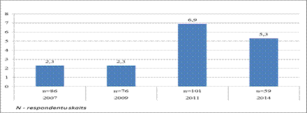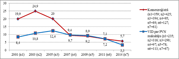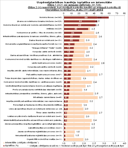 Datu avots: 2014.gada Uzņēmumu aptauja par administratīvo procedūru ietekmi uz uzņēmējdarbības vidi. Salīdzinoši visvairāk darba laiku dažādu birokrātijas jautājumu risināšanai velta lielo uzņēmumu vadītāji (26% no visa darba laika). Administratīvo prasību risināšanai patērēto laiku, kā lielu apgrūtinājumu, vērtēja 11,1% (2011.g. – 17%) uzņēmēju, kā nelielu apgrūtinājumu – 36,3% respondentu, savukārt 36,1% aptaujas dalībnieku pauda viedokli, ka tas nav apgrūtinājums. Kopumā pētījuma rezultātu analīze un to salīdzinājums ar iepriekšējo pētījumu rezultātiem ļauj apgalvot, ka uzņēmējdarbības vide Latvijā uzlabojas. Visas pētījuma instrumentārijā iekļautās regulējošās jomas, administratīvās procedūras, iespējamie uzņēmējdarbības šķēršļi šogad retāk tika vērtēti, kā kavējoši uzņēmumu attīstībai, nekā tas bija iepriekšējos pētījumos (kopš 2001.gada). Līdzīgi kā iepriekšējos pētījumos, arī šogad visbiežāk, kā šķērsli uzņēmējdarbībā, aptaujas dalībnieki nosauca nodokļu likmes ( vienīgais faktors, ko, kā kavējošu uzņēmuma attīstībai nosauca vairāk par pusi (59%) aptaujāto uzņēmēju (2011.gadā– 78%)); likumu un noteikumu izmaiņu biežums – kā šķērsli uzņēmējdarbībā nosauca 44% uzņēmēju (2011. gadā – 59%); nodokļu likumi un noteikumi/ nodokļu administrēšana – 42% (2011.gadā – 59%); inflācija – 32% (2011. gadā – 61%); Konkurence ar pelēko / ēnu ekonomiku – 24% (2011. gadā – 43%) un infrastruktūras pakalpojumu izmaksas (elektrība, ūdens, gāze, autoceļi) – 21% (2011.gadā – 35%). Minētās problēmas īpaši smagi ietekmē ražotājus un ārvalstu investorus.